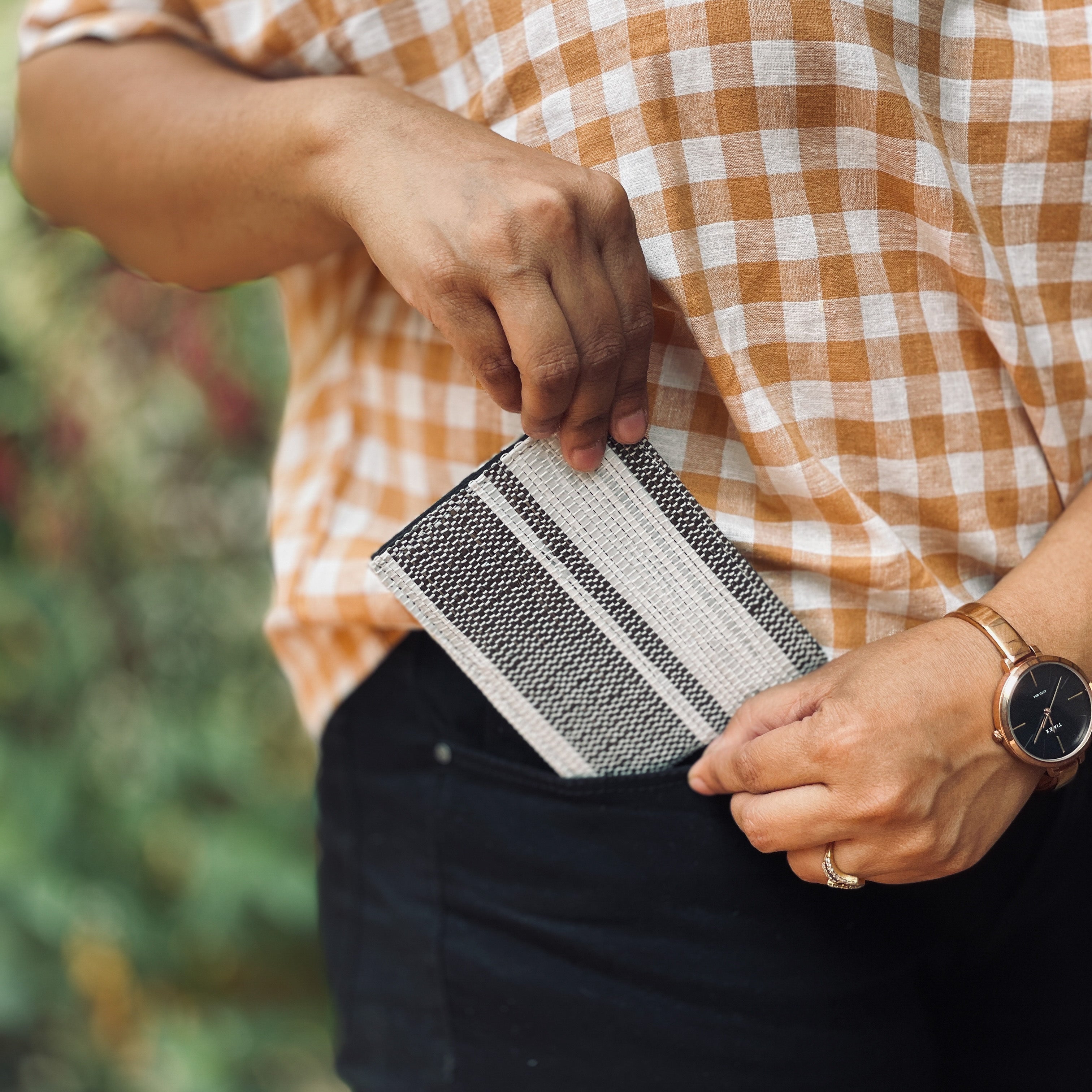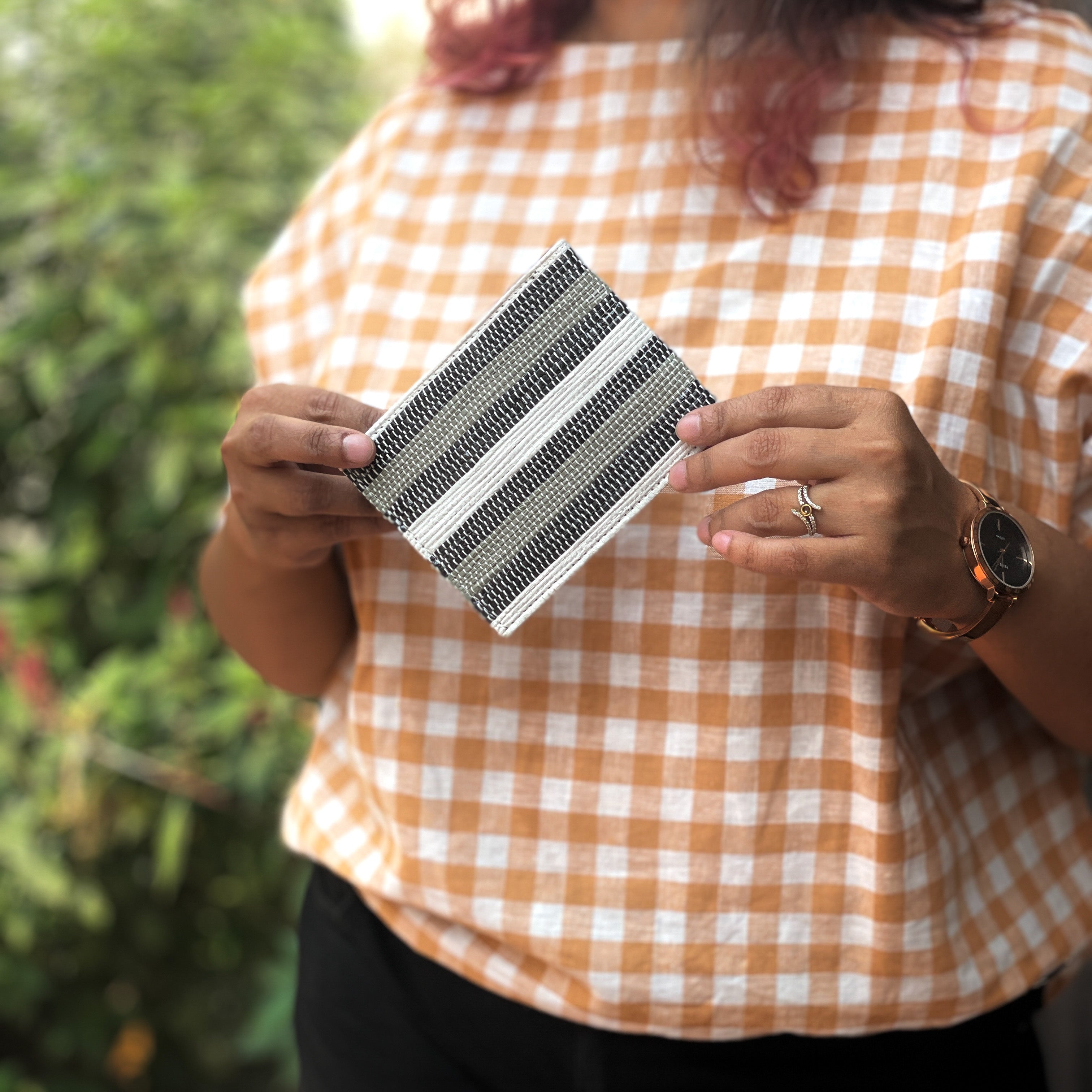 A safe place to store your credit cards, ID cards, currency notes, coins and other important receipts, reCharkha’s UPCYCLED HANDWOVEN Wallet is a must-have product. With a sturdy yet compact design, you can hold it in your hand with ease. Being a functional product, it is produced in gender neutral colours like black, white and even combinations of both.