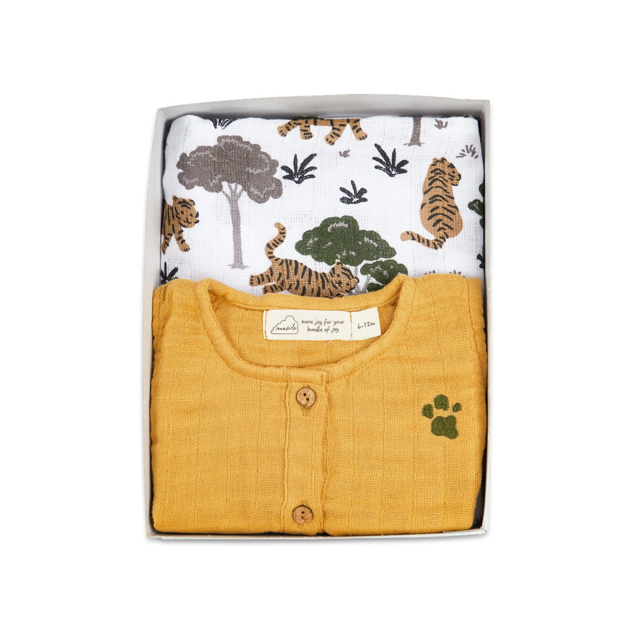 It's a classic for a reason. One of our organic swaddle blankets gets perfectly paired with a cutest-of-cute, baby romper.