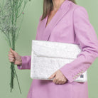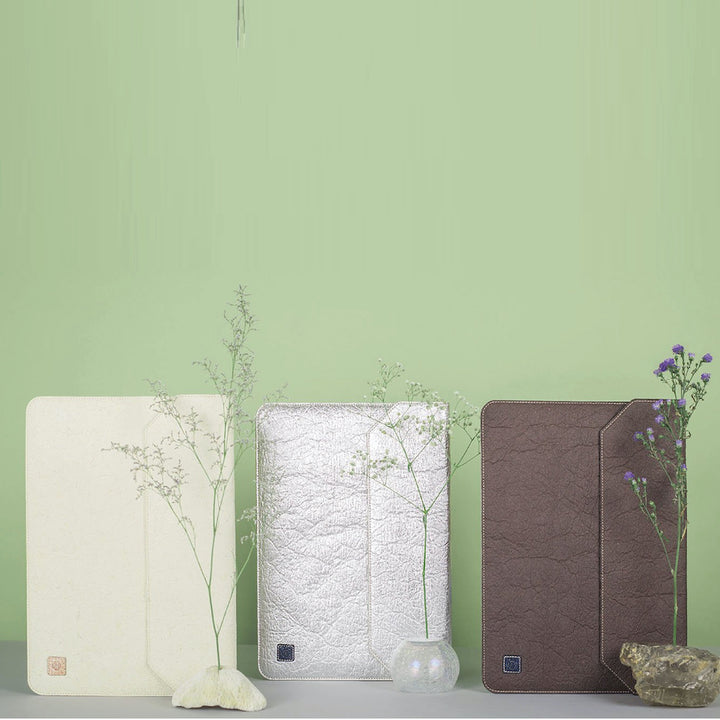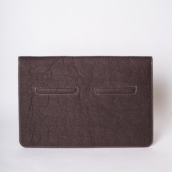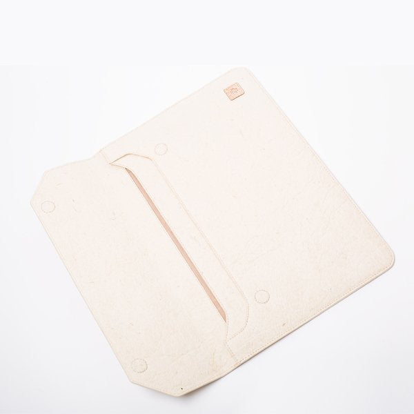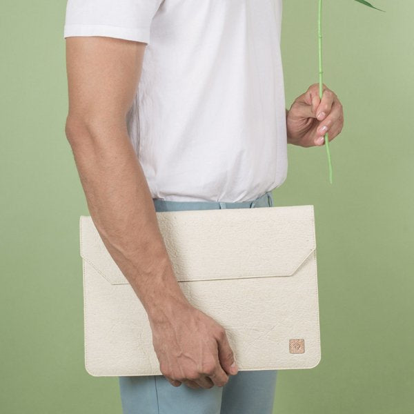 Product Features: Unisex Style 2 functional back welt pockets Additional slot inside for documents, notepads, etc. Flap with concealed magnetic closure Compatible with upto 13”– MacBook, MacBook Air, MacBook Pro models and any other 11” to 14” laptop models Made from imported Pinatex (Vegan material made from upcycled pineapple leaves) Signature M A Y U monogram debossing detail Construction stitching in our signature brand colour Packaged in a beautiful natural silk cover Bonus feature: M A Y U monogram charm on the silk cover Dimensions: 36 cm x 25 cm