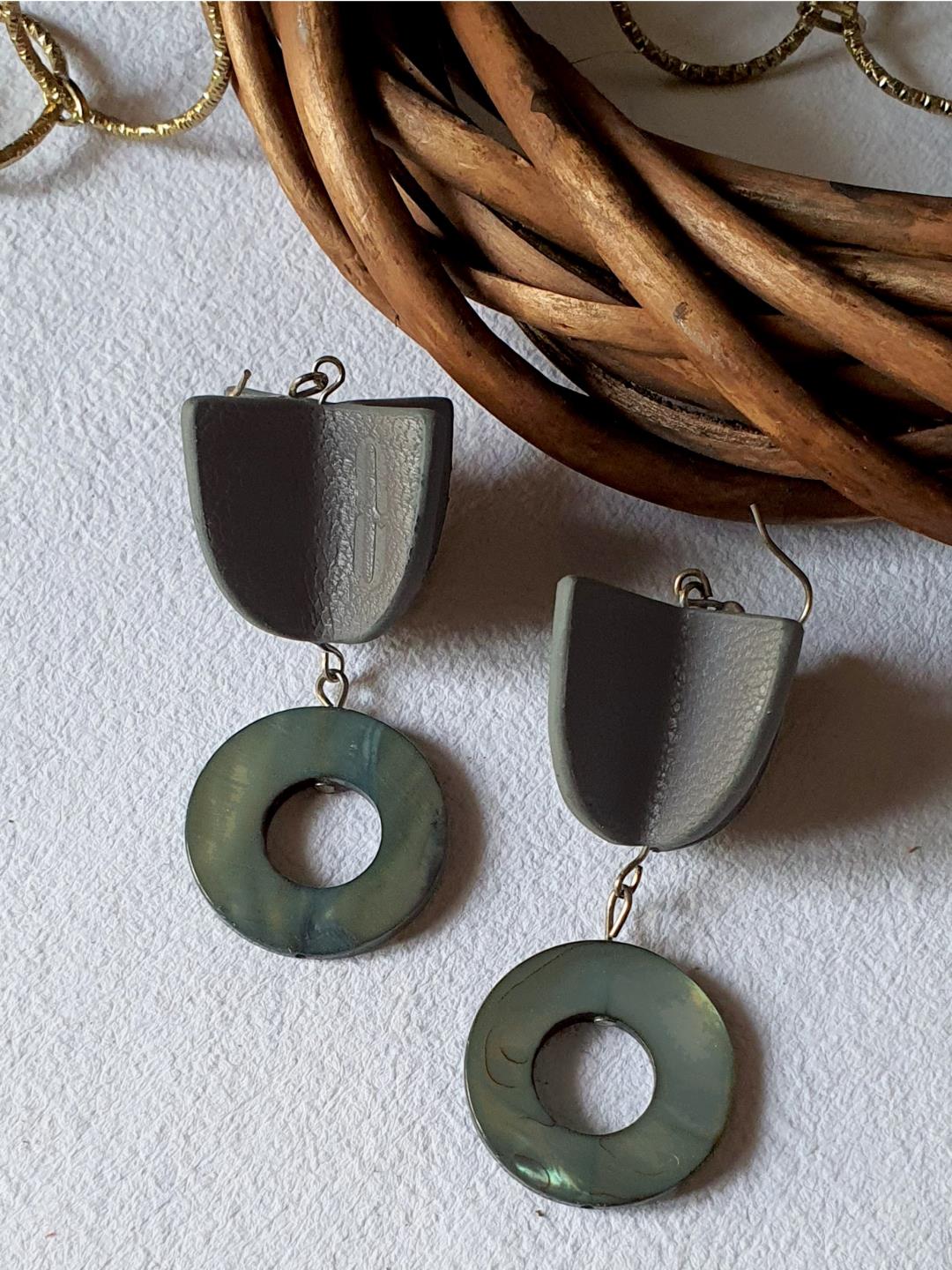 Contrasting and angular, the pieces are crafted with facing petals and a shell bead dangling from the middle We are redefining the word new by upcycling leather off-cuts to give them a second purpose and each product a new skin.