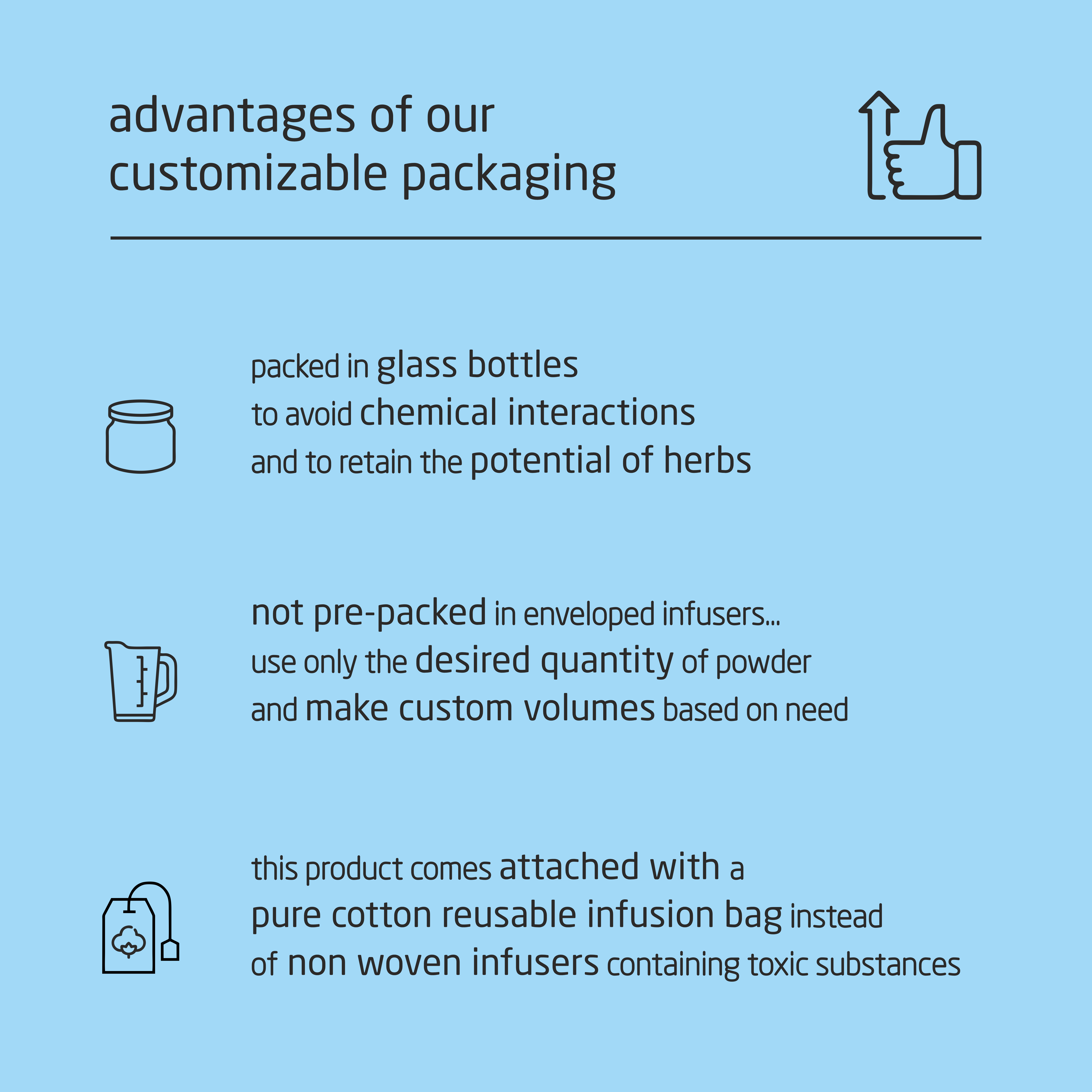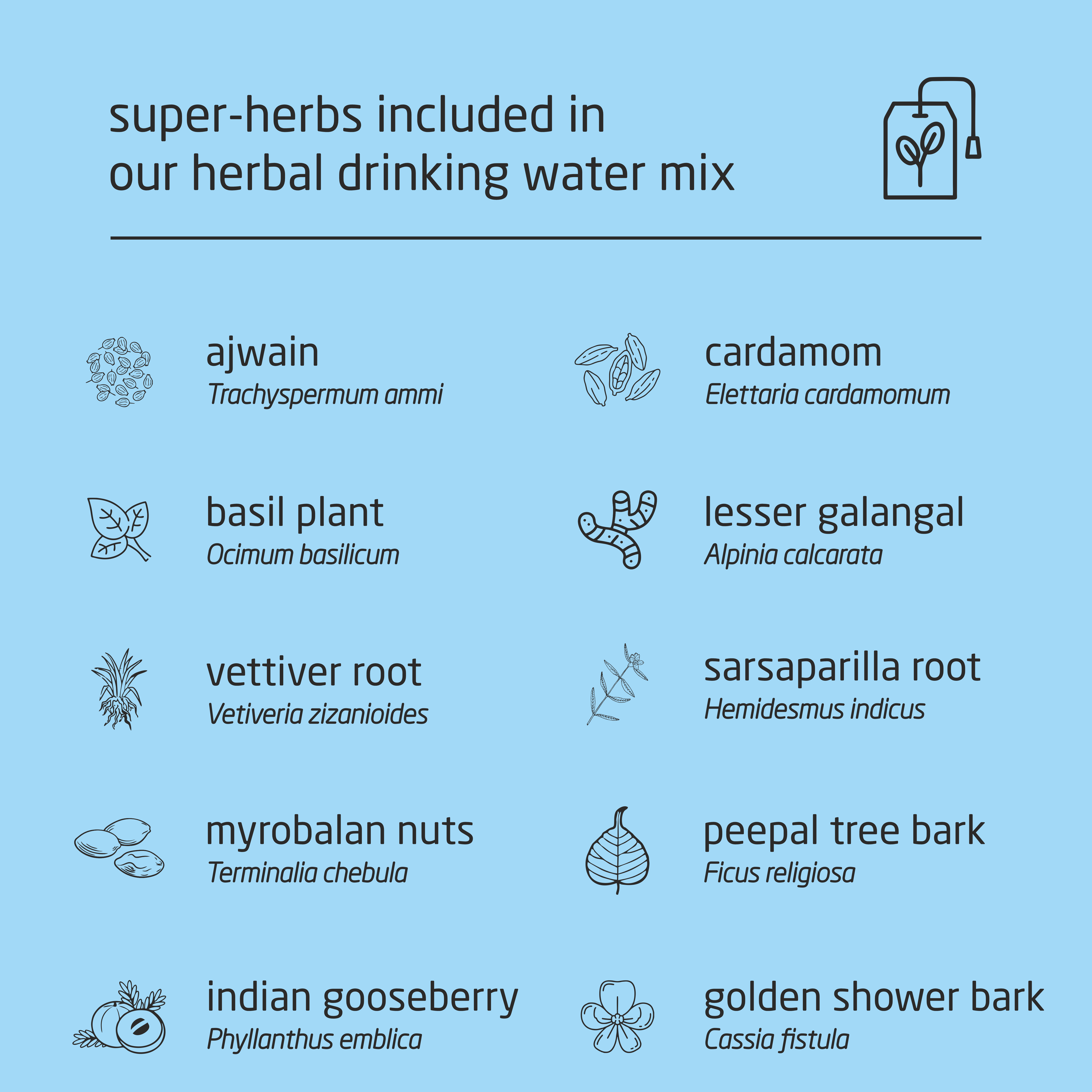 Ingredients: Vettiver Root (Vetiveria zizanioides), Indian Sarsaparilla (Hemidesmus indicus), Mango Leaves (Mangifera indica), Indian Gooseberry (Emblica officinalis), Ajwain (Trachyspermum ammi), Lesser Galangal (Alpinia galanga), Golden Shower Tree Bark (Cassia fistula), Nut Grass Tubers (Cyperus rotundus), Cardamom (Elettaria cardamomum), Peepal Tree Bark (Ficus religiosa), Basil Plant (Ocimum basilicum), Holy Basil (Ocimum sanctum), Myrobalan Nuts (Terminalia chebula), Garlic Pear (Crateva adansonii)