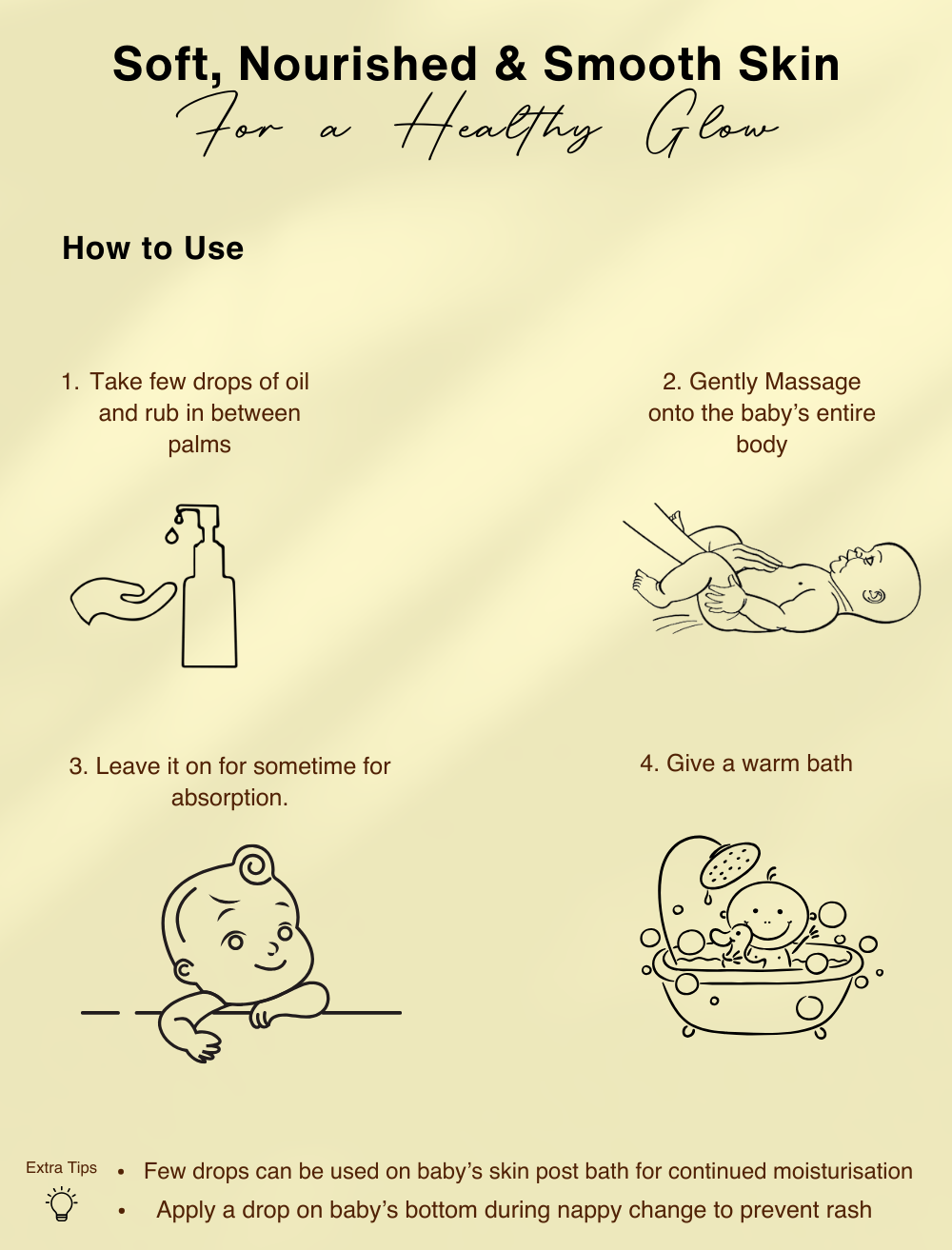 How to Use: "Pre-bath Massage Pour a small amount of Oil into your hands. Rub your palms together to warm the oil. Gently massage onto the baby's body. Leave for 20-30 minutes. Cleanse and rinse the baby with warm water. Post-bath Moisturizer After the bath, few drops to baby's skin. Leave the oil on for continued moisturization."