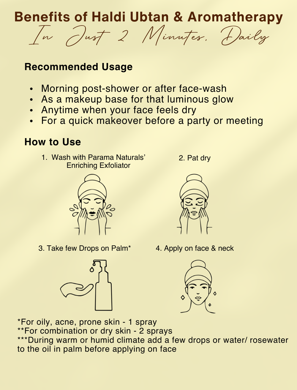How to Use: "After cleansing your face, pat your skin dry. Use circular motions to apply 3-4 drops of Facial Oil to your face and neck. Focus on the under-eye area during application. Leave the facial oil on throughout the day for continuous hydration. If you need a quick refresh anytime, apply a small amount directly using the same circular motions. Apply the facial oil as a protective base on your face and neck before using any cosmetics. Allow a moment for it to set before layering other products. This acts as a barrier against potential chemical exposure from cosmetics."