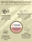 Ingredients: Virgin Malabar Kokum Butter (Garnicia indica), Cold-pressed Sesame Oil (Sesamum indicum), Virgin Cold-pressed Coconut Oil (Cocos nucifera), Cold-pressed Castor Oil (Ricinus communis), Nutmeg Butter (Myristica fragrans), Neem Oil (Azadirachta indica), Turmeric Essential Oil (Curcuma longa CO2 extract), Peppermint Essential Oil (Menthe viridis), Rosemary Essential Oil (Salvia rosmarinus) AND NOTHING ELSE.