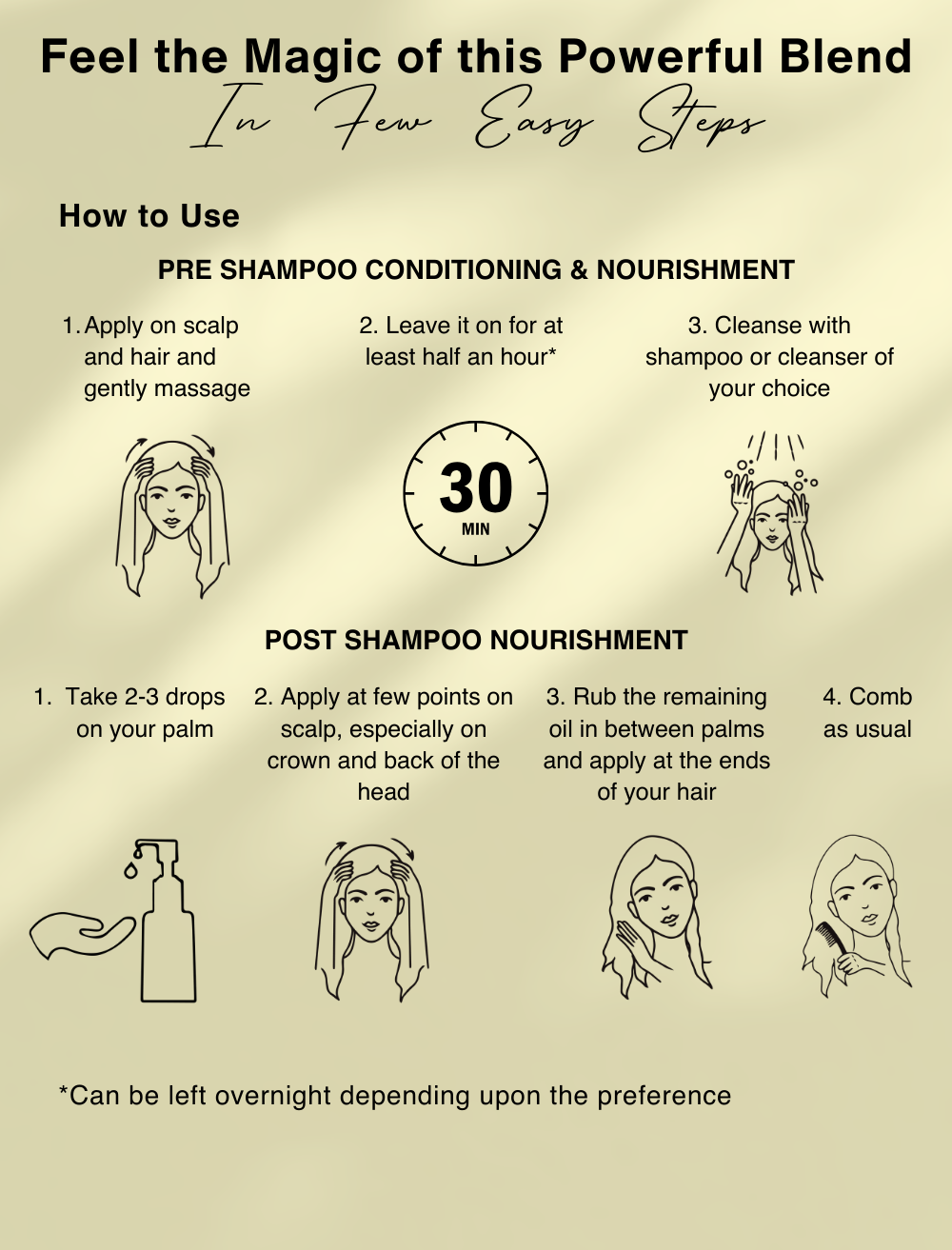 How to Use: "Pre-Wash Scalp Treatment: Dispense a few drops into your palm or a bowl. Dip your fingertips to take some oil, ensuring to remove any excess. Massage into the scalp, separating hair. Leave on for a minimum of 30 minutes or overnight, depending upon preference. Wash thoroughly. Post-Wash Conditioning and Detangling: Take a few drops on your palm. Rub palms together. Apply along the length of the hair. Comb through for smooth and detangled hair."