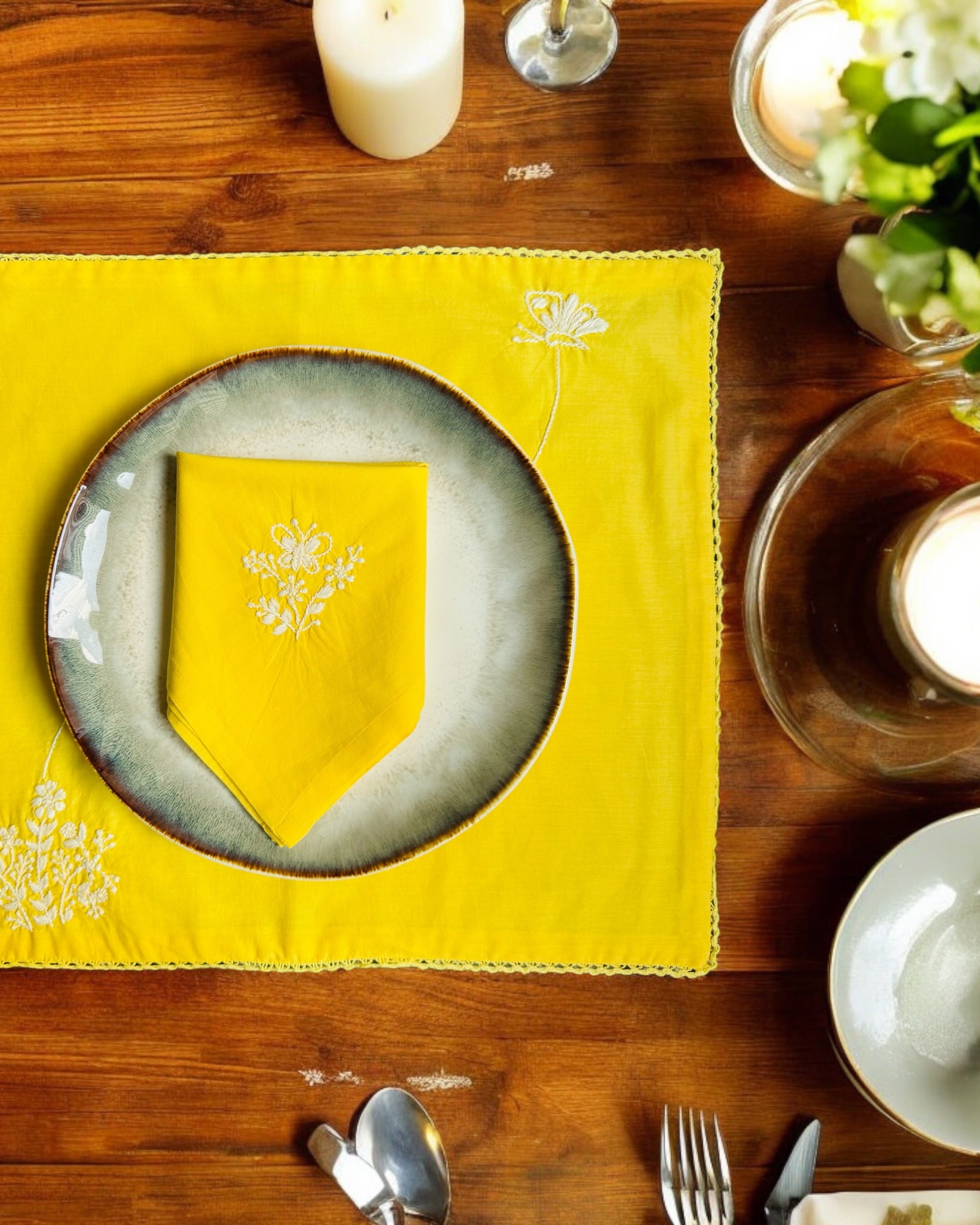 A4. Cotton placemats are typically machine washable. It's recommended to wash them in cold water with a mild detergent and dry them on low heat to preserve their quality. Always check the care instructions provided with your specific placemats for the best maintenance practices.