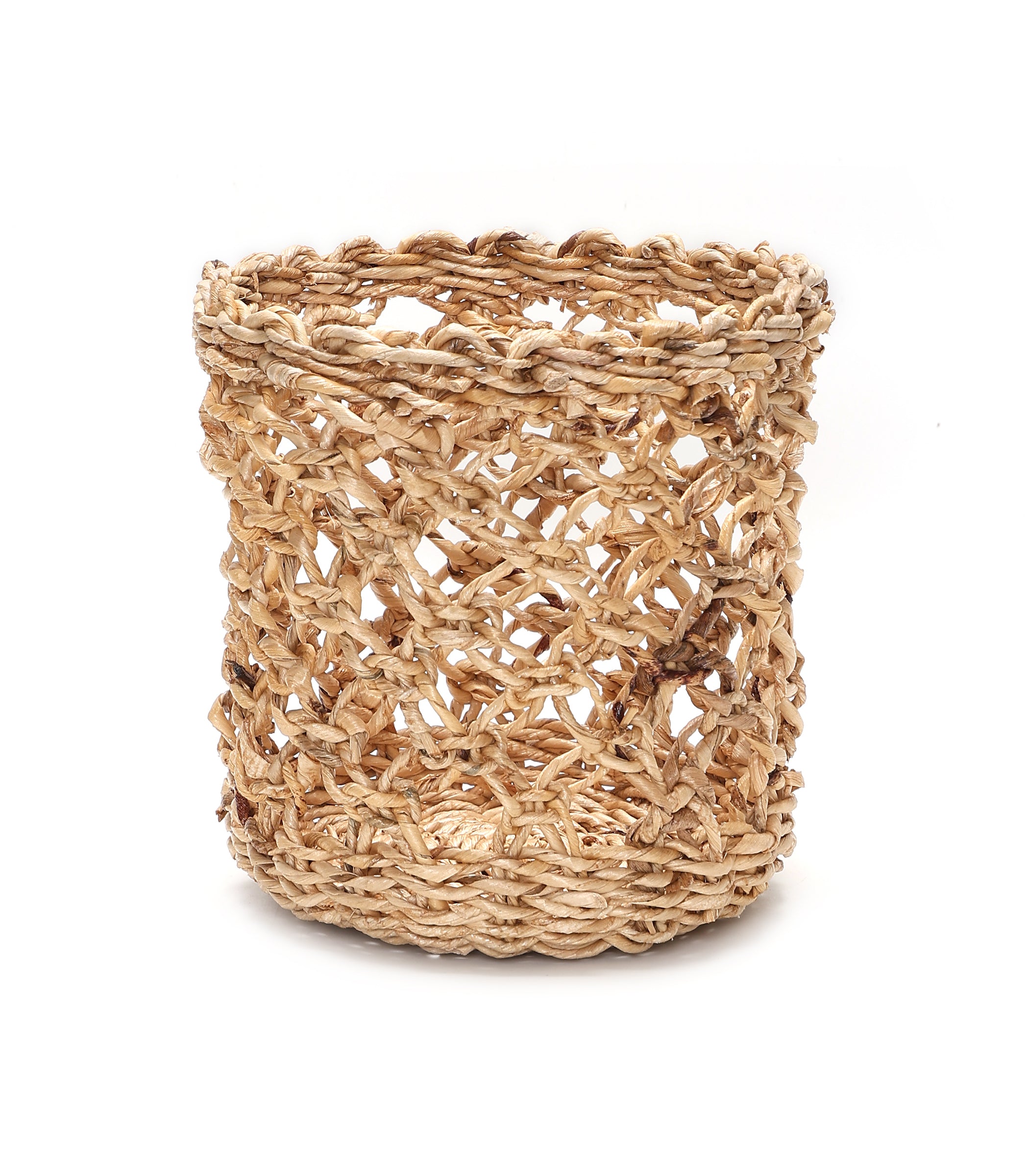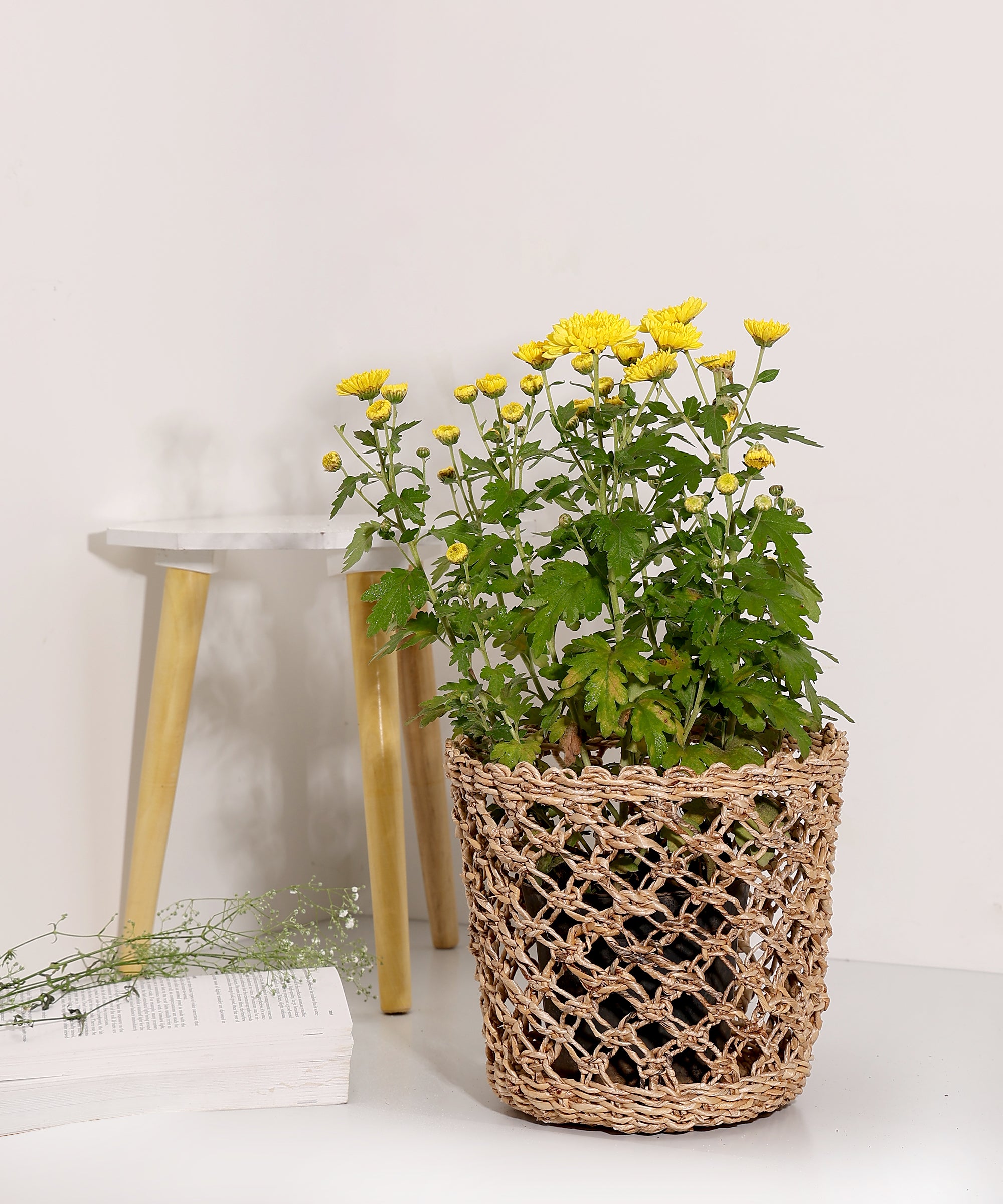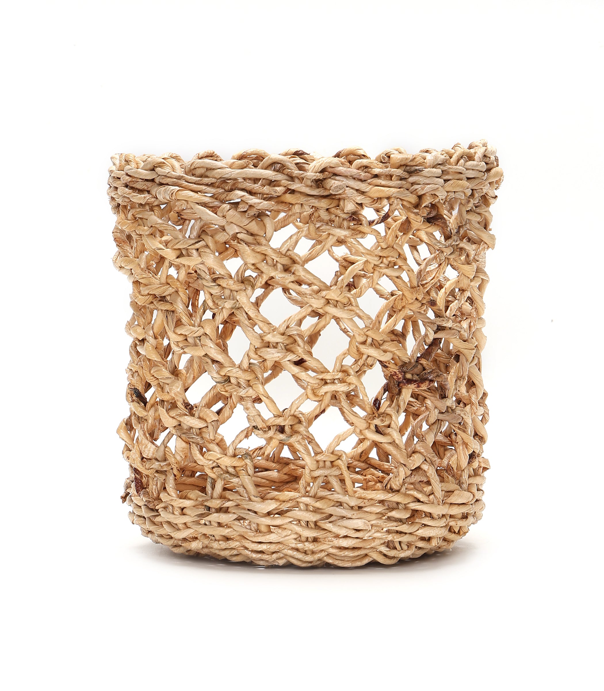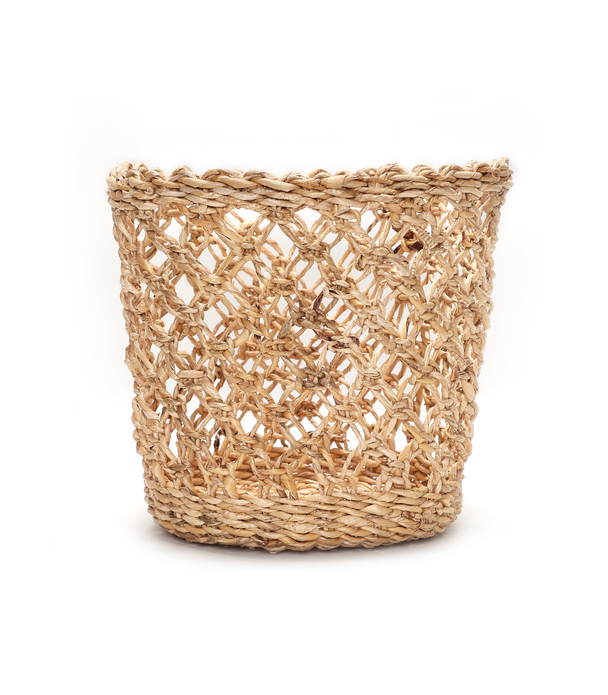 The open-weave structure supports airflow around the pot liner, and the lightweight build allows easy placement and movement.