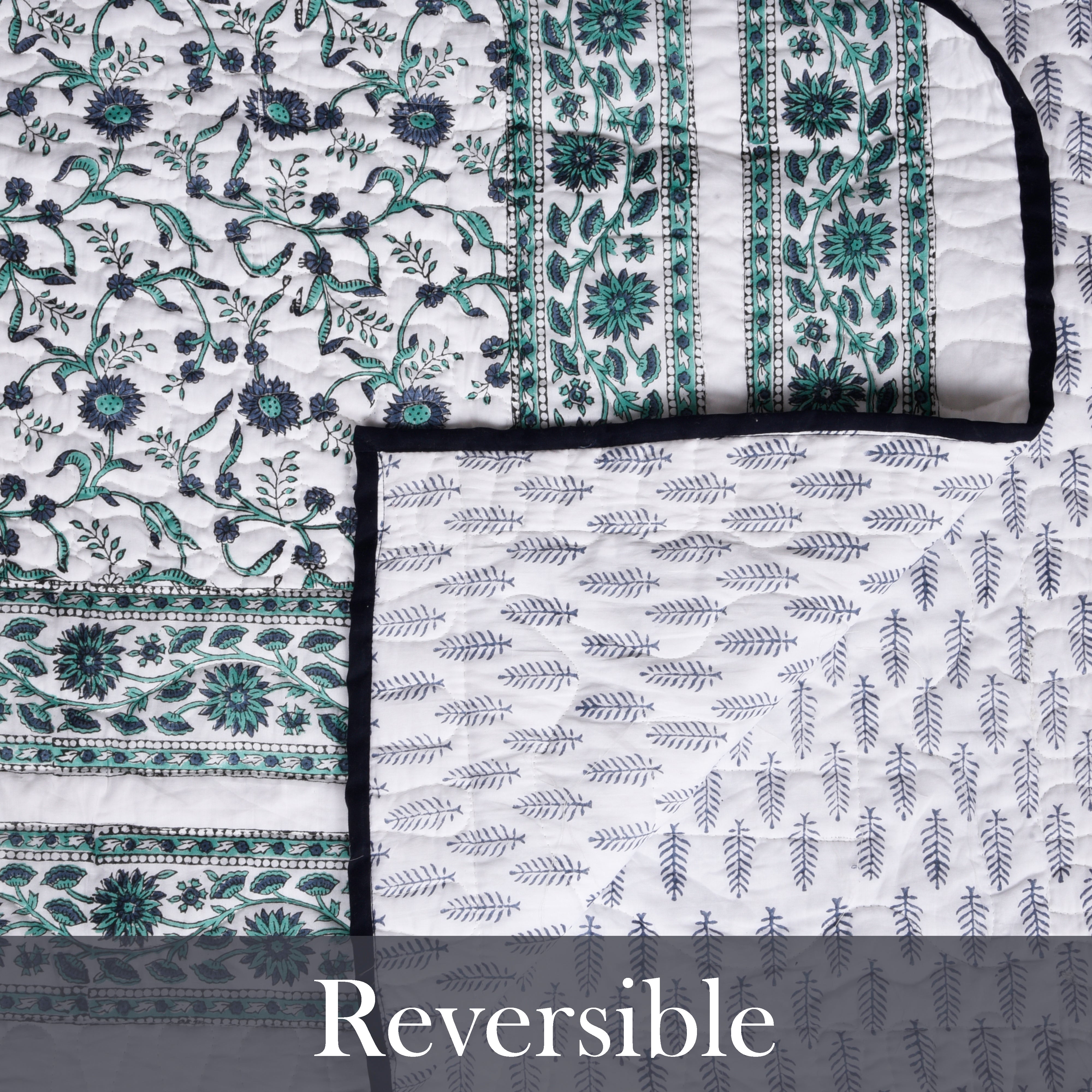 This Single bed quilted blanket is perfect for a cozy and comfortable night's sleep. Crafted from pure cotton muslin fabric, it features a beautiful hand block print design. The quilting provides added warmth and the machine washable feature makes for easy maintenance.