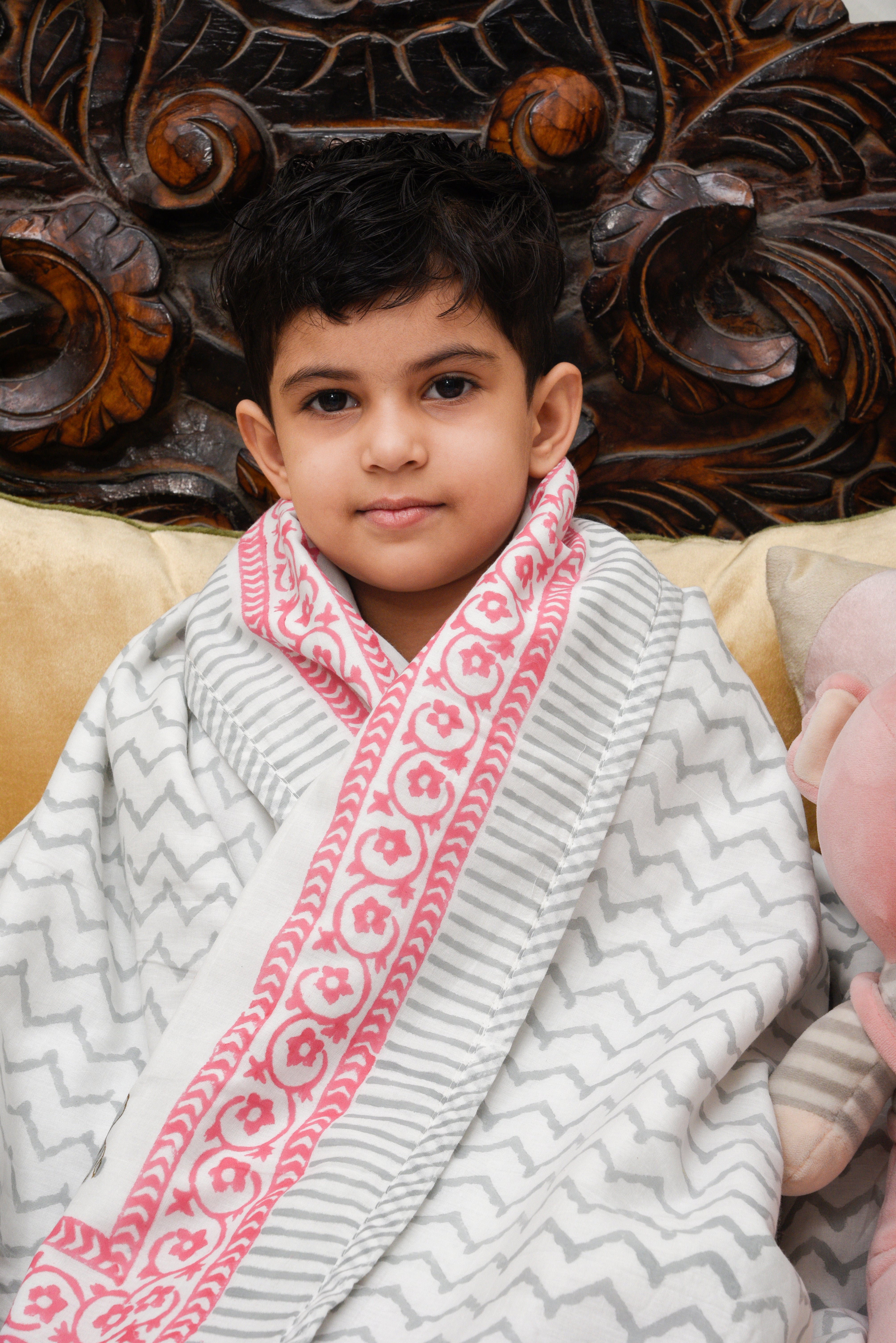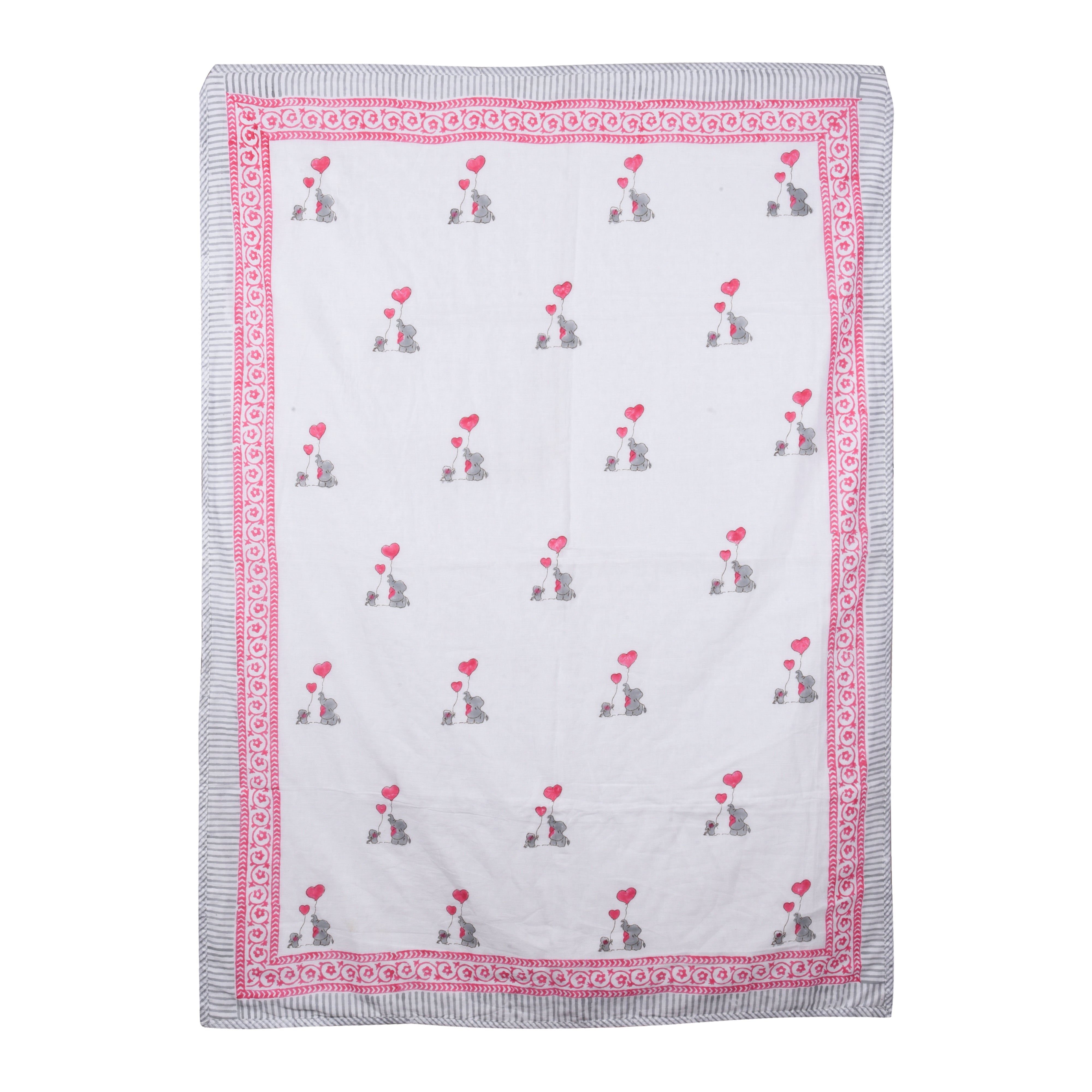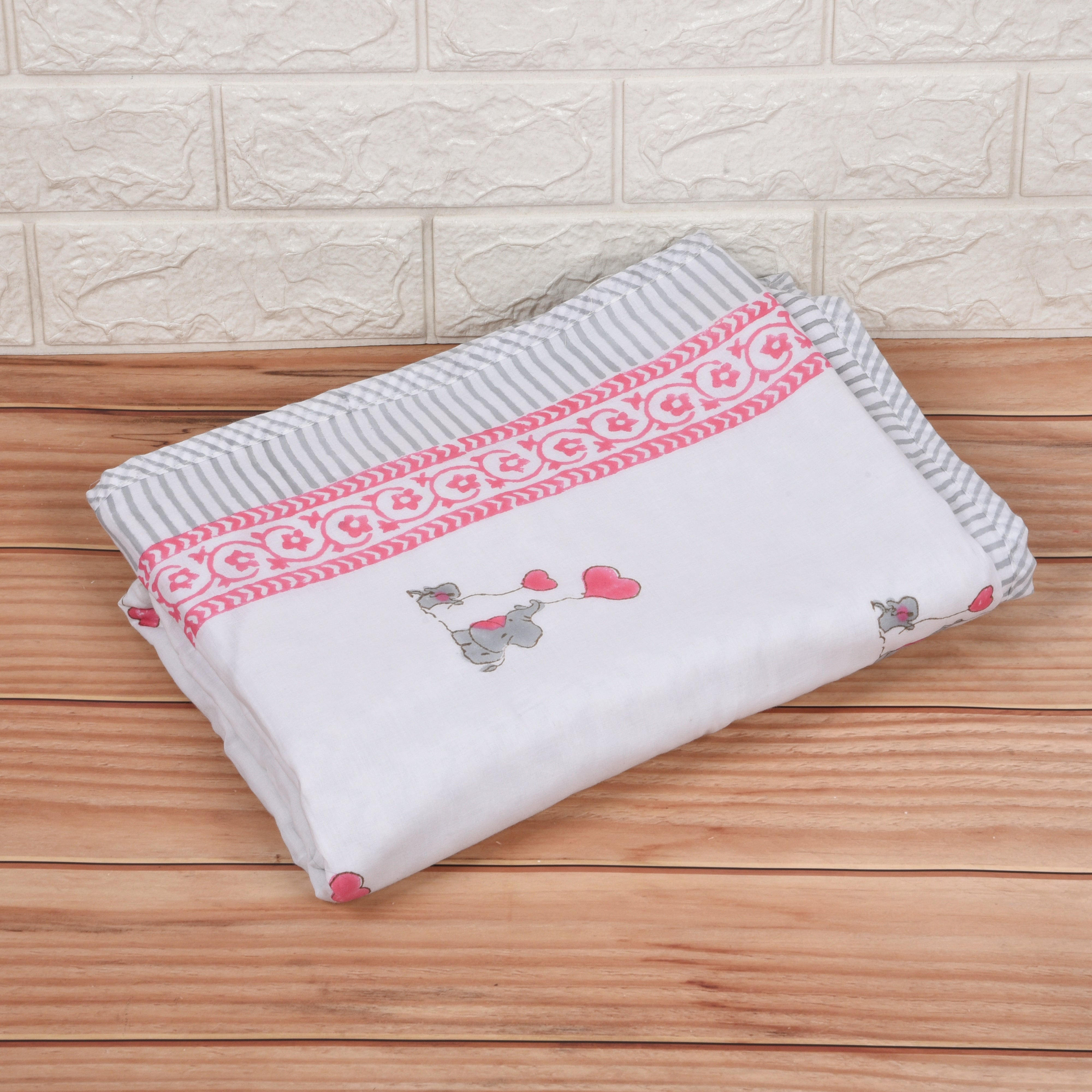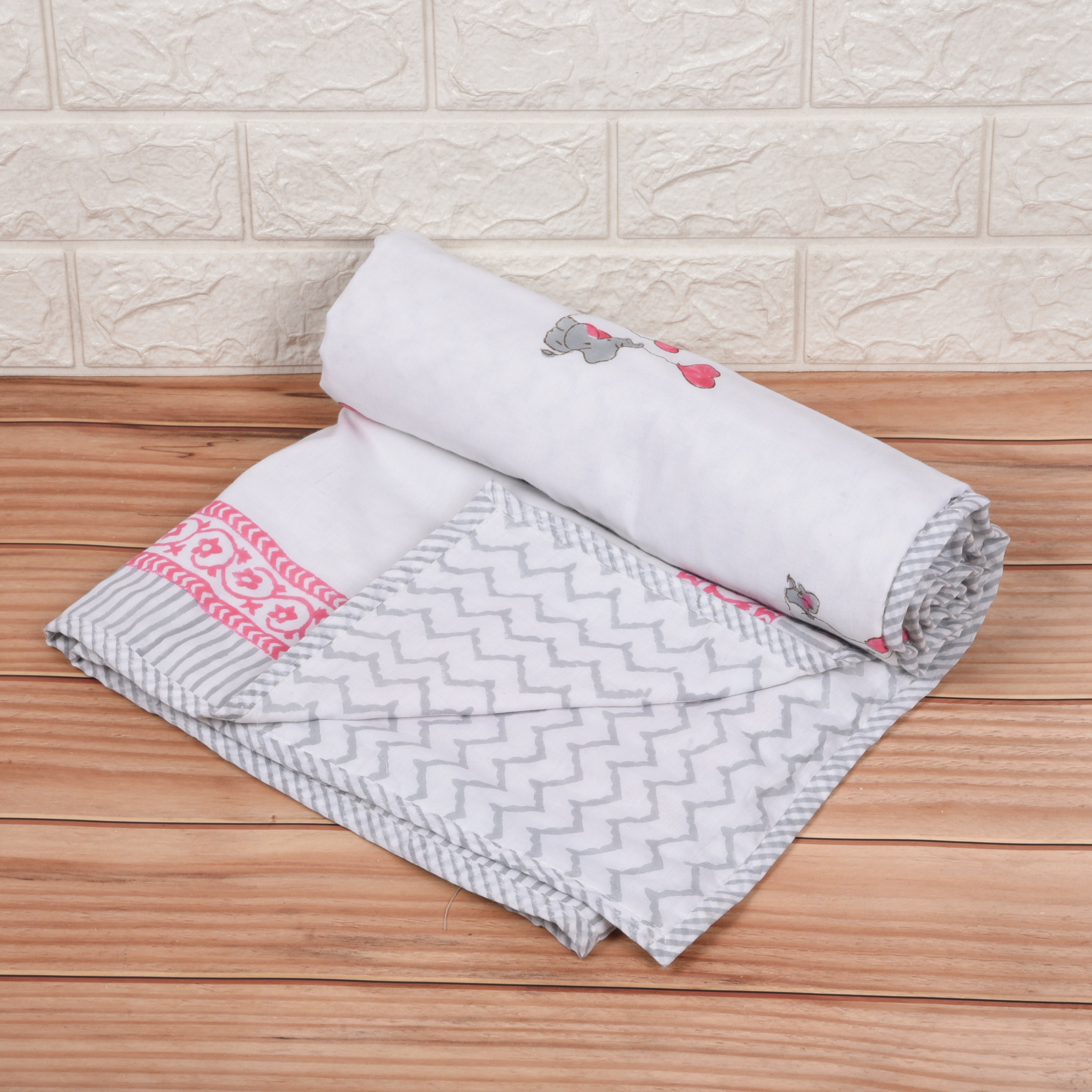 Hand Block Printed Cotton Baby dohar blanket, 60x40 inches (100x150 cm) (Pink Grey Baby Elephant)