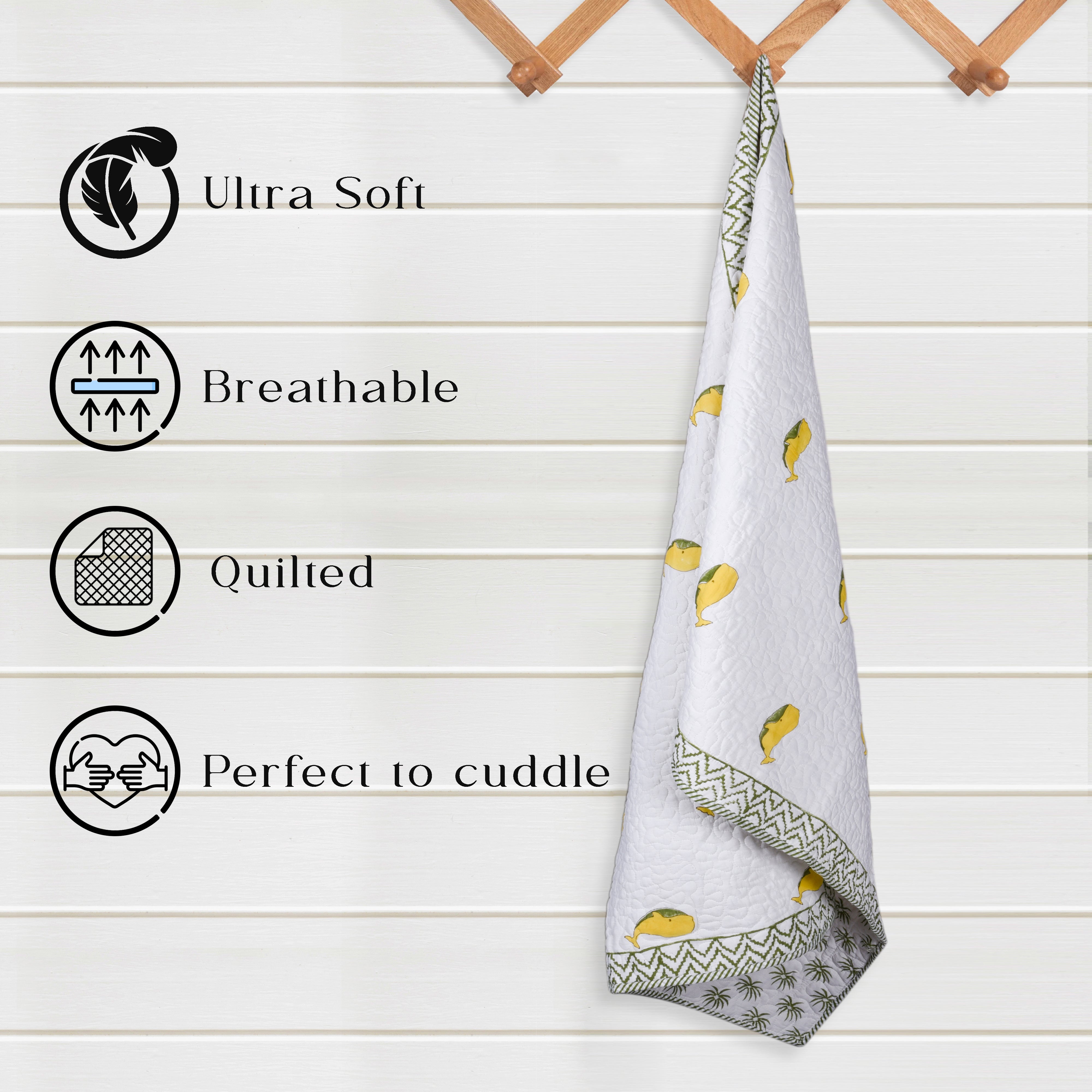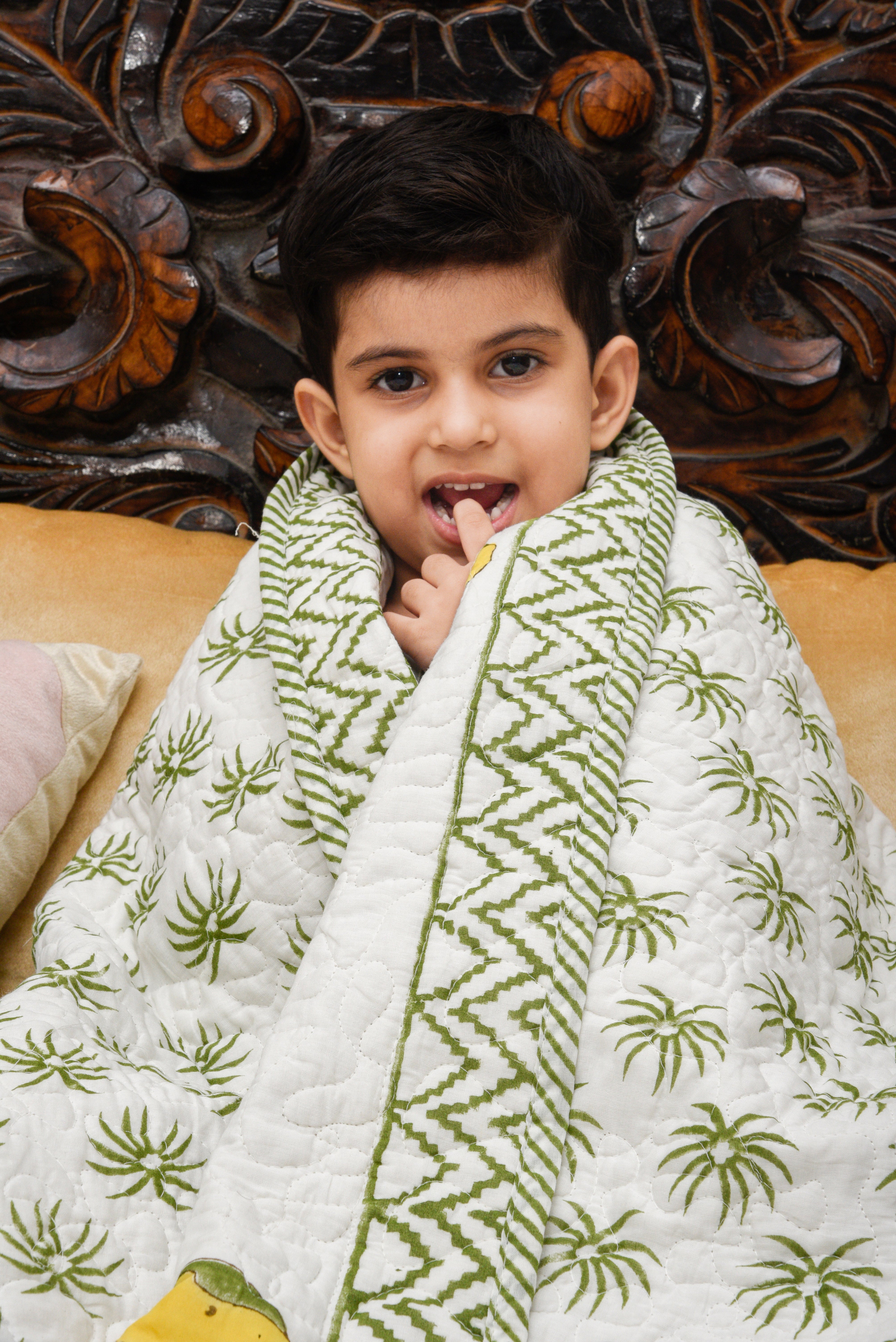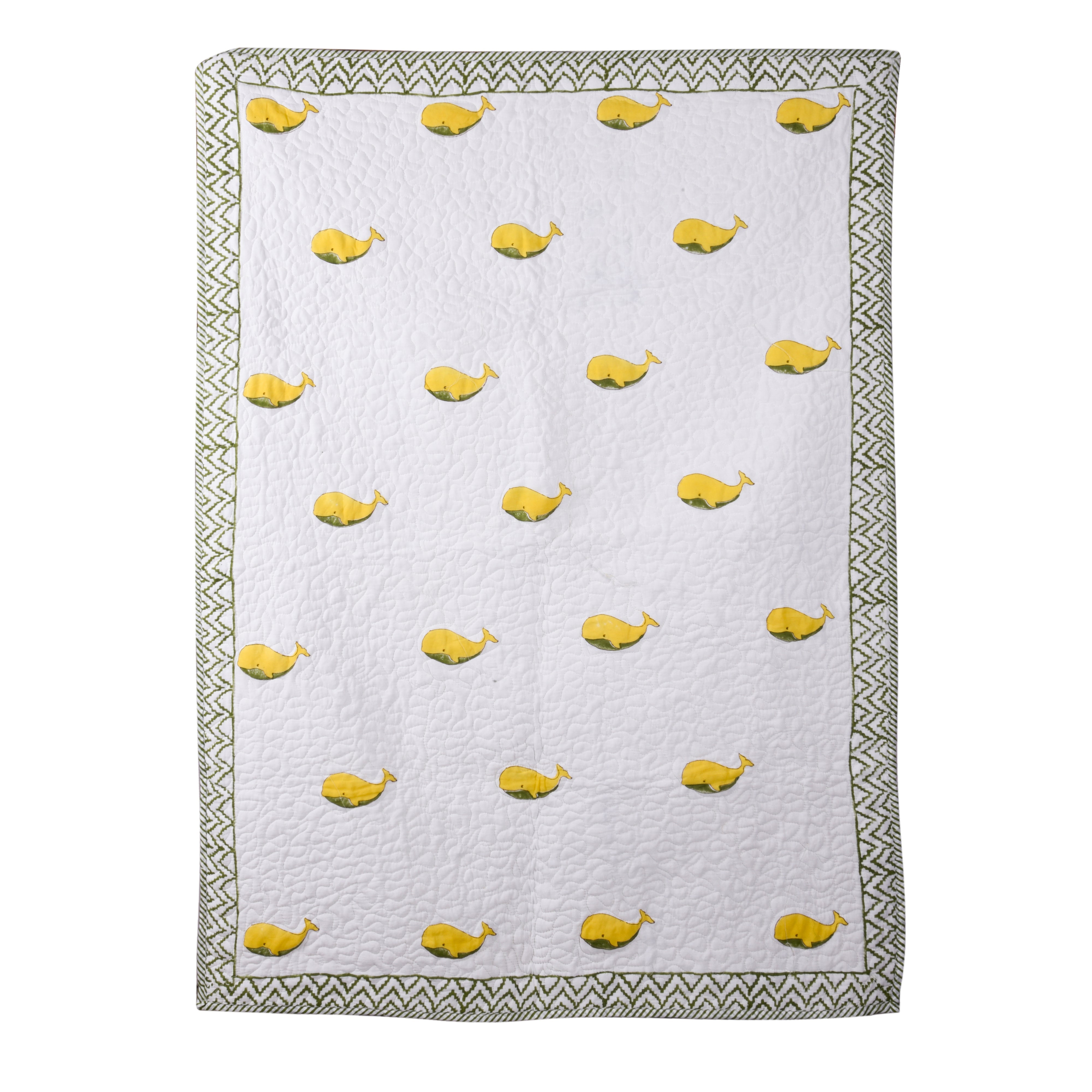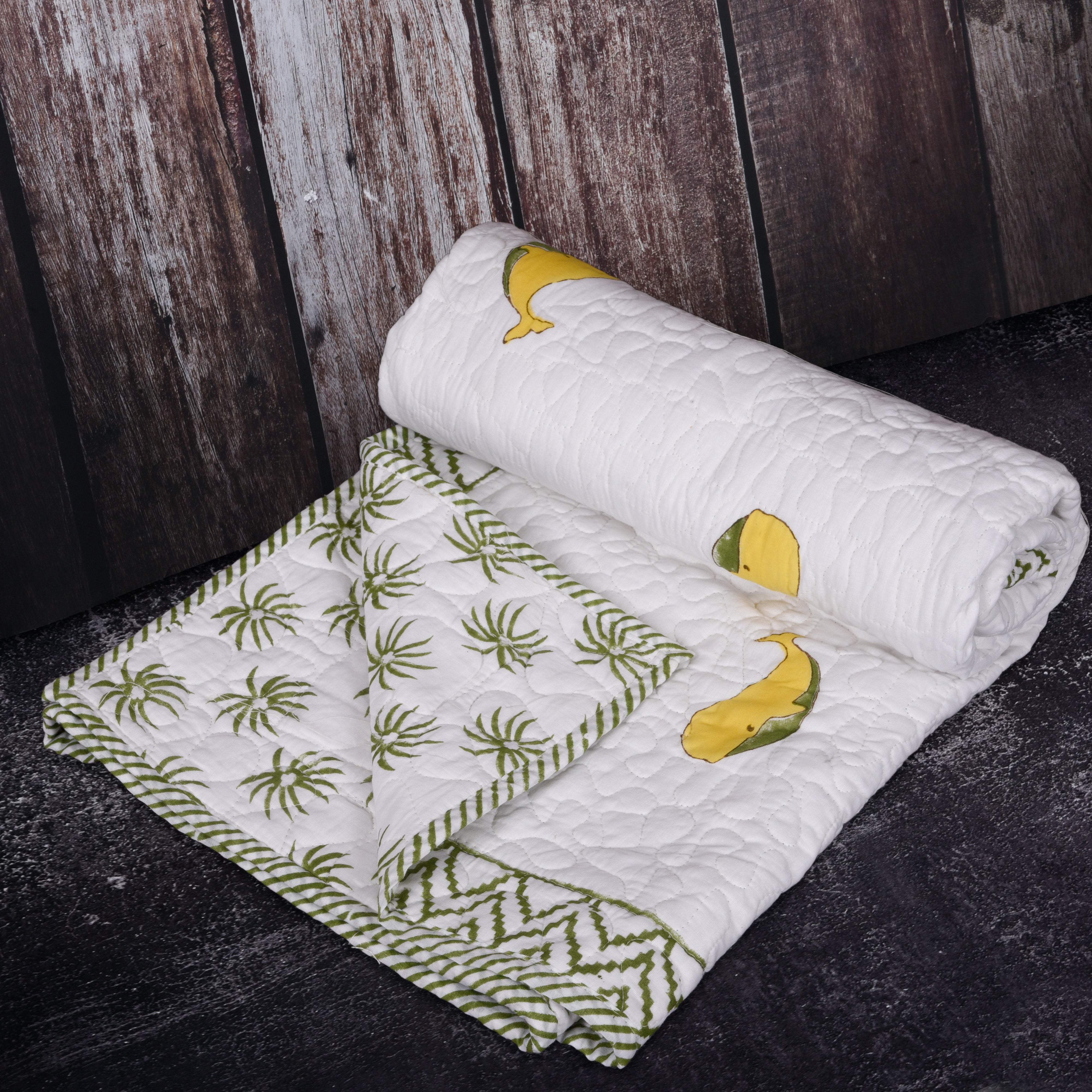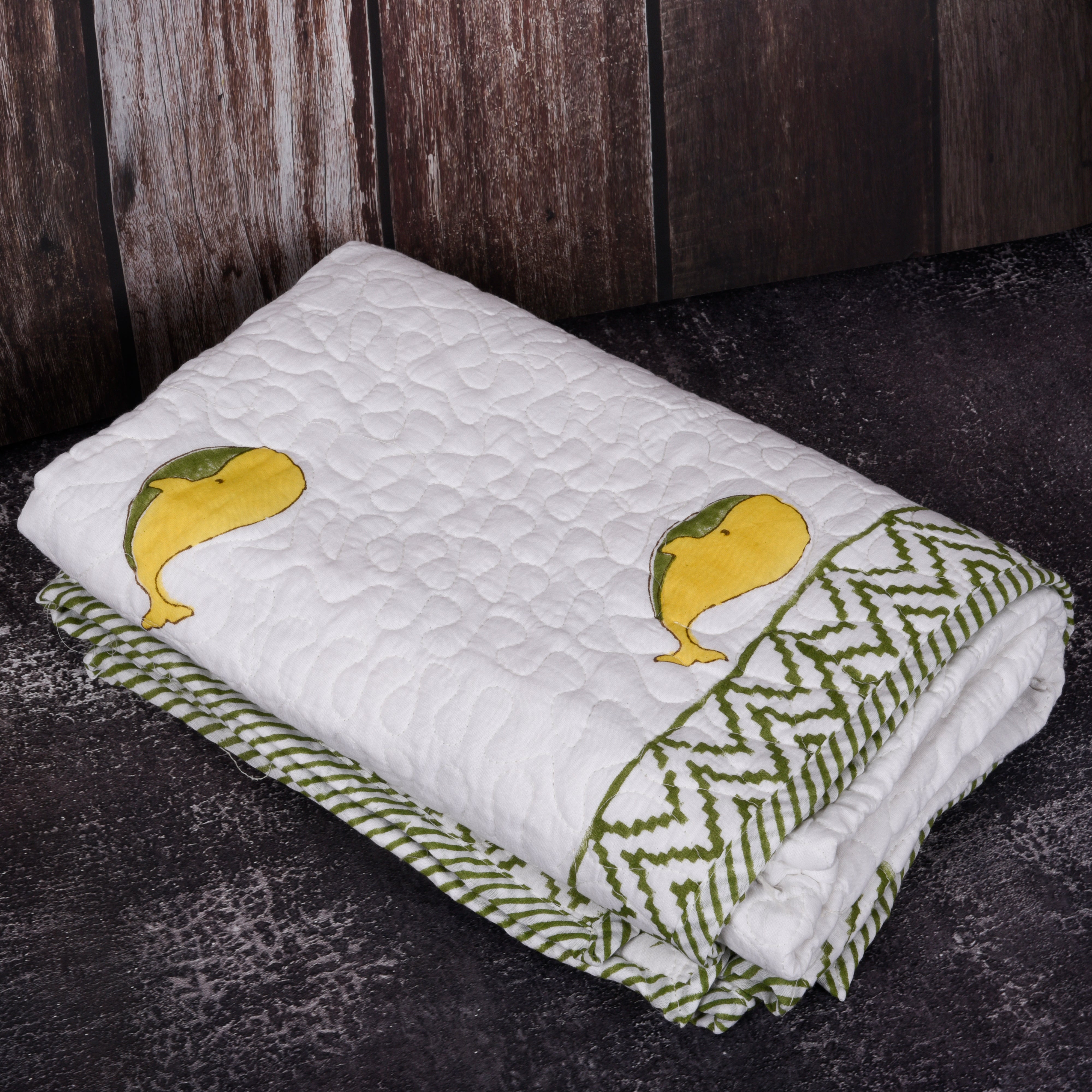 Hand Block Printed Cotton Baby Quilted blanket (light Rajai) – Quilted, 60x40 inches (100x150 cm) Green Yellow Dolphin