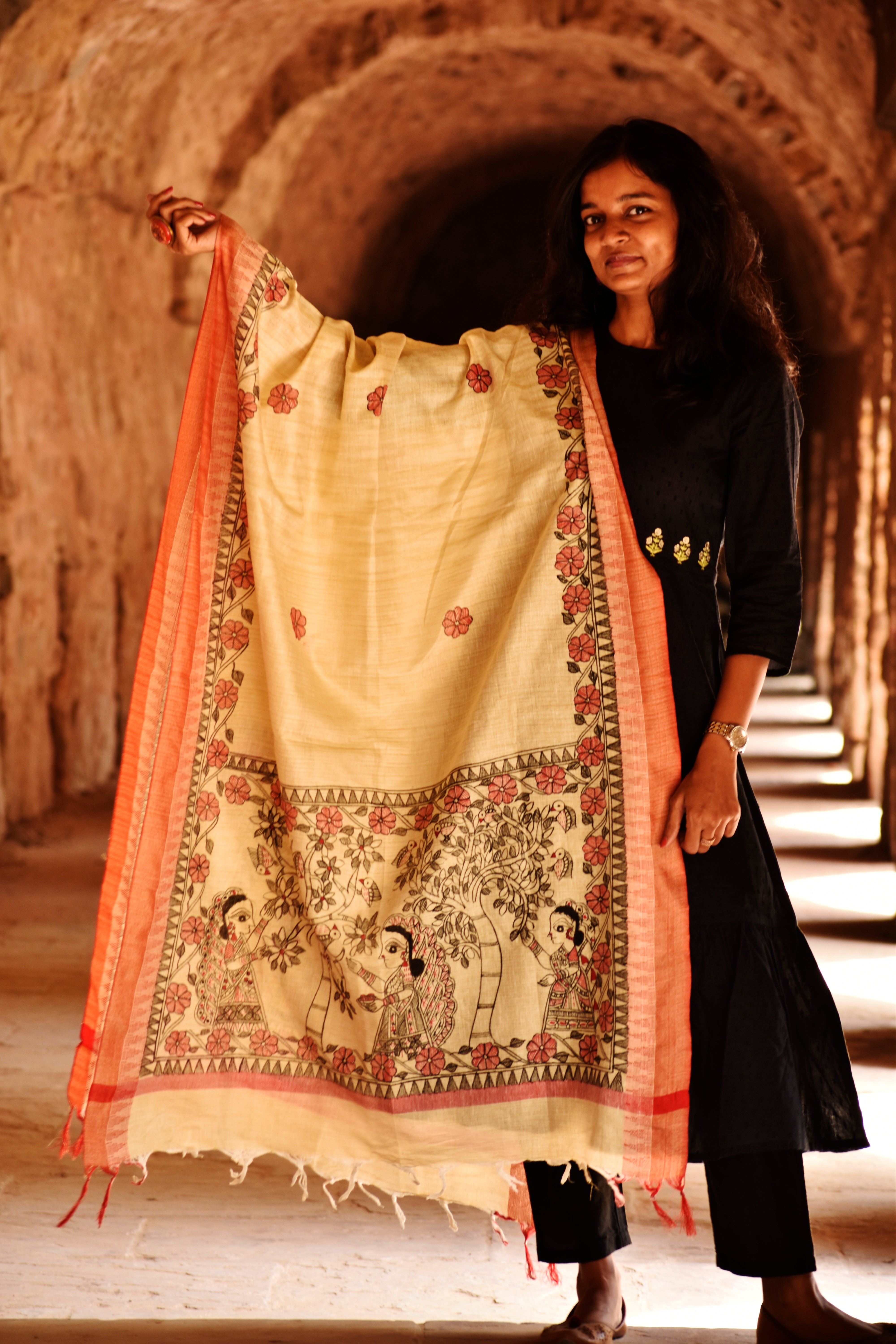 Madhubani Handpainted Black-Red Cotton Dupatta
