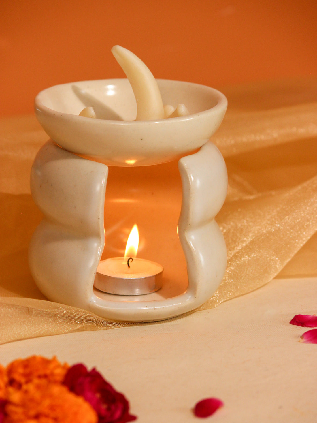 A blend of aesthetics and versatile usage, this delicately handcrafted piece adds a visual and aromatic appeal! Cast a soothing aura with the warm glow of a tealight candle, the fragrant touch of wax melts or the slow burning of essential oils. Exuding a dreamy and relaxing ambiance, place this in your space for a calming welcome to your home!