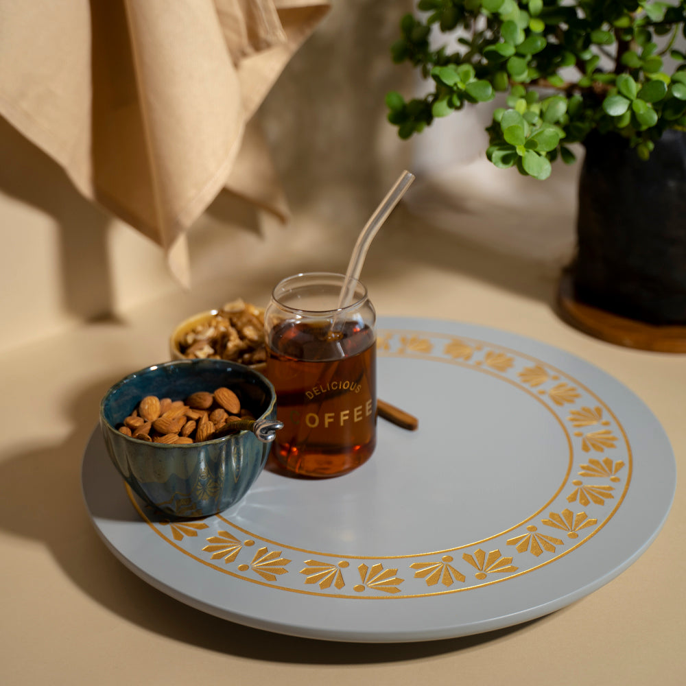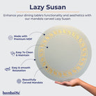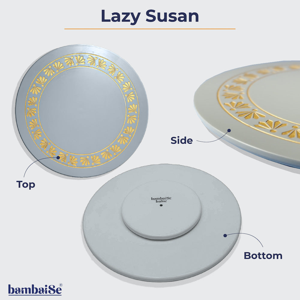 Grey Lazy Susan with Carved Petals Mandala Art is a beautifully crafted wooden lazy susan featuring an intricate mandala design with carved Petals and a smooth rotating mechanism. Its elegant and sophisticated design makes it a perfect addition to any home decor.