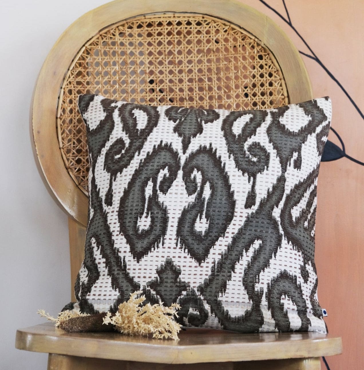 The ever popular ikat motifs are timeless and they create the best cushion cover designs- so effective yet so simple. This hand screen printed cushion cover on a handwoven organic cotton textured fabric with a colorful yet subtle back ground stripe is the must have for any home.. This cushion will look lovely paired with a solid brown one.