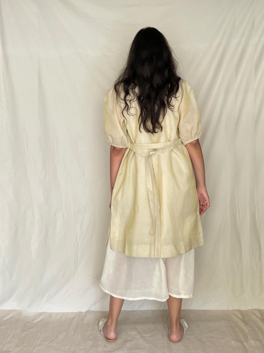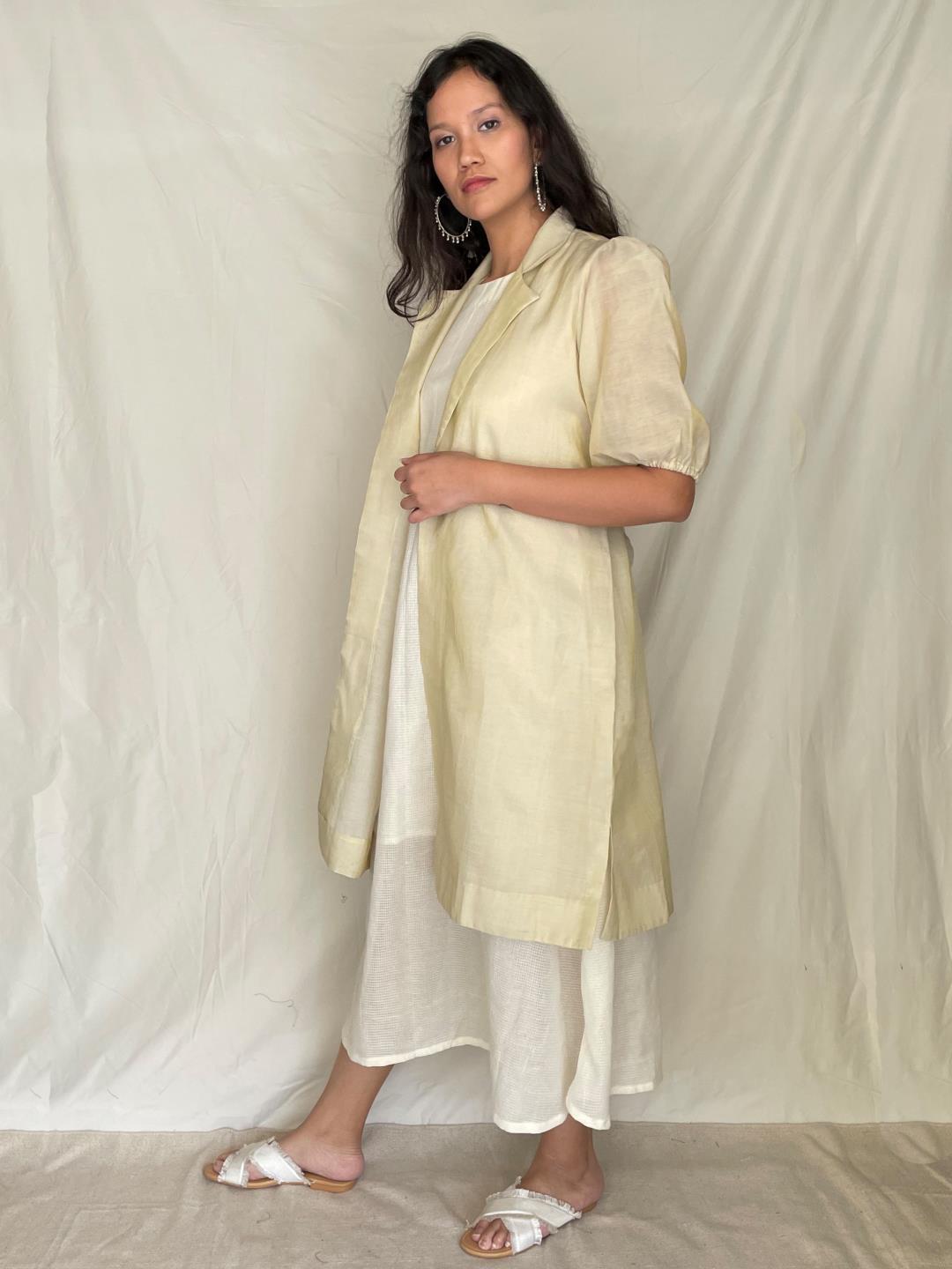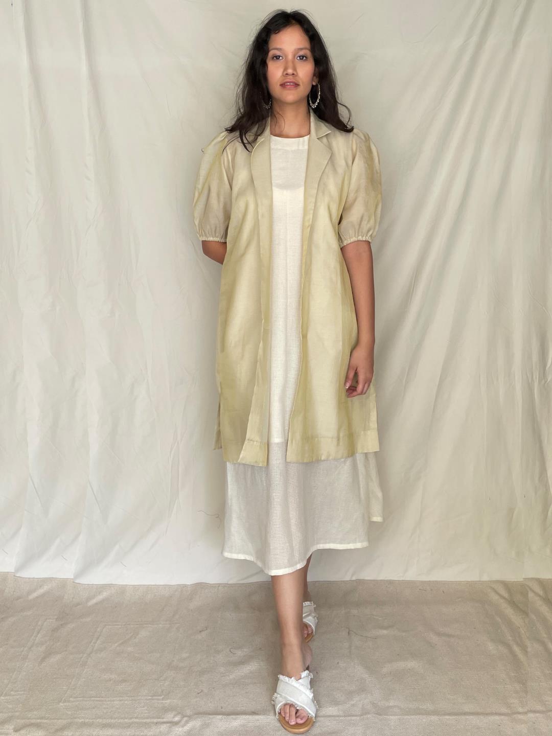 Puff sleeved wide notch collar tissue jacket with a belt paired with a sleeveless A-line cotton dress.