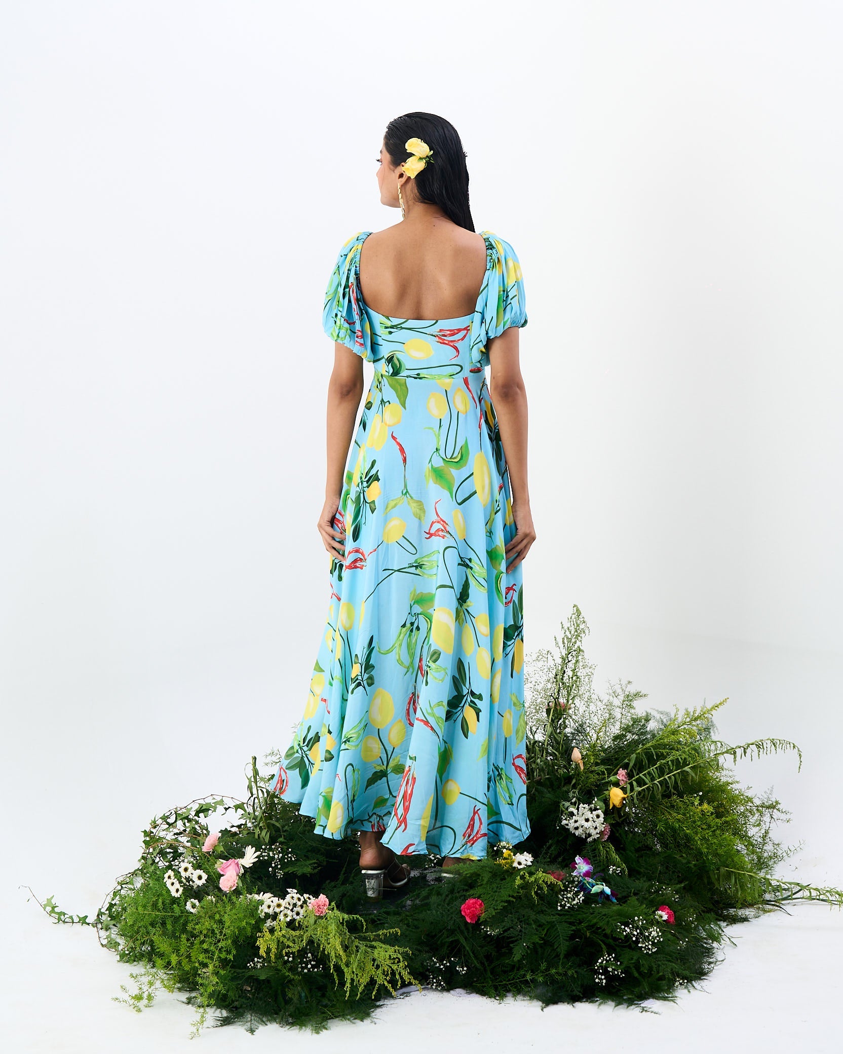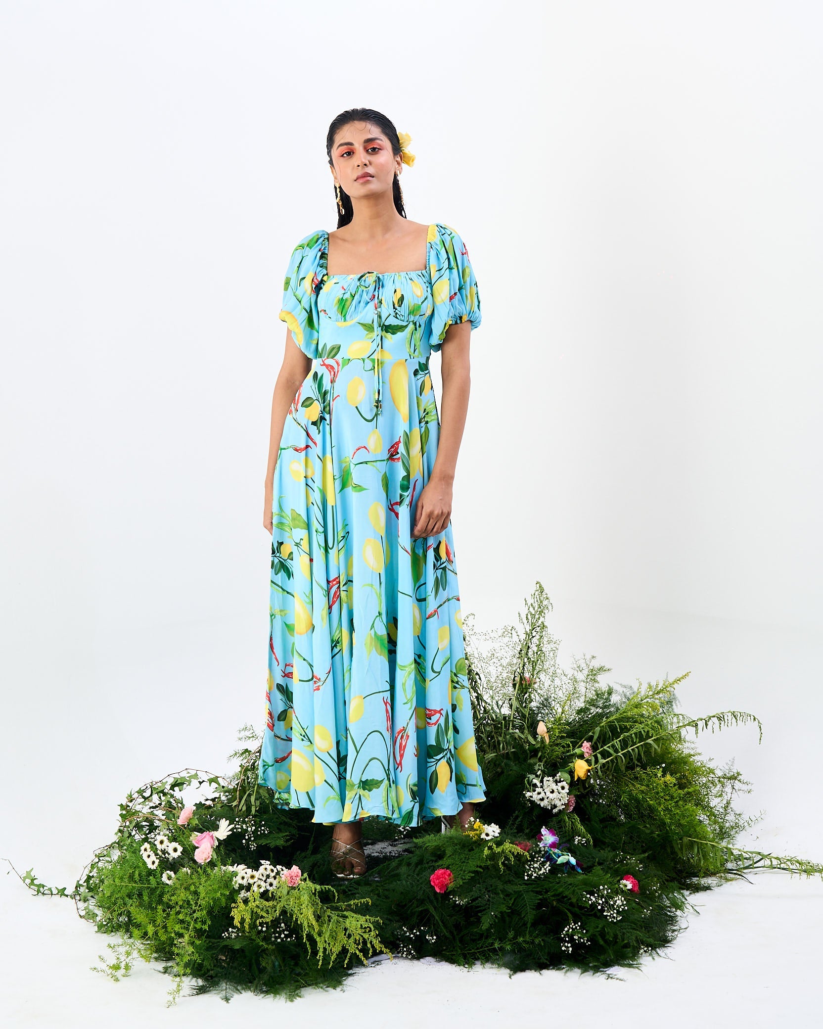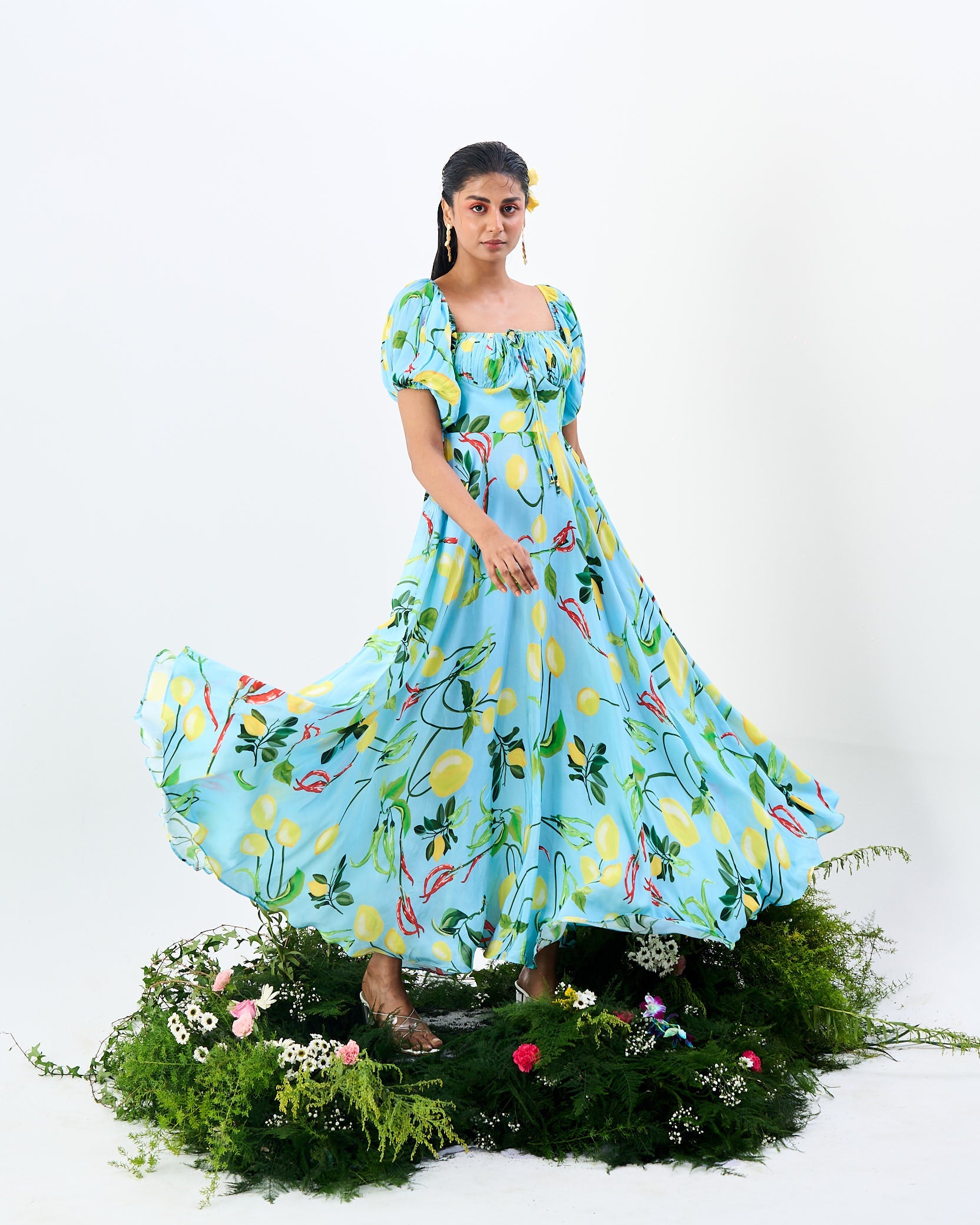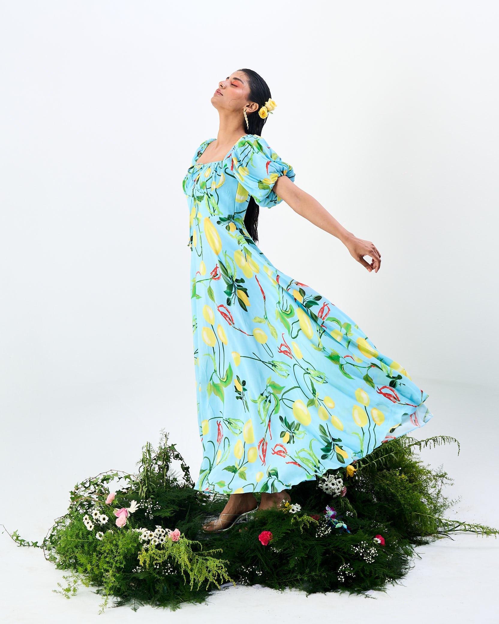 Our Nimbu Mirchi dress is a playful addition to our collection, featuring hand-painted lemons and chillies on a dress with drawstrings. This unique piece is perfect for the bold and quirky fashionista who loves to stand out in a crowd.