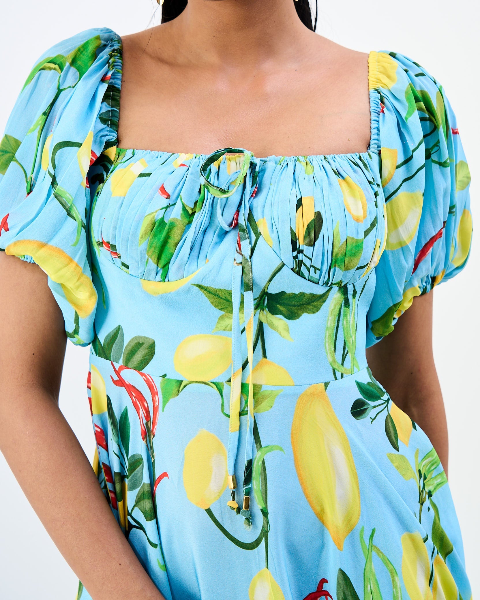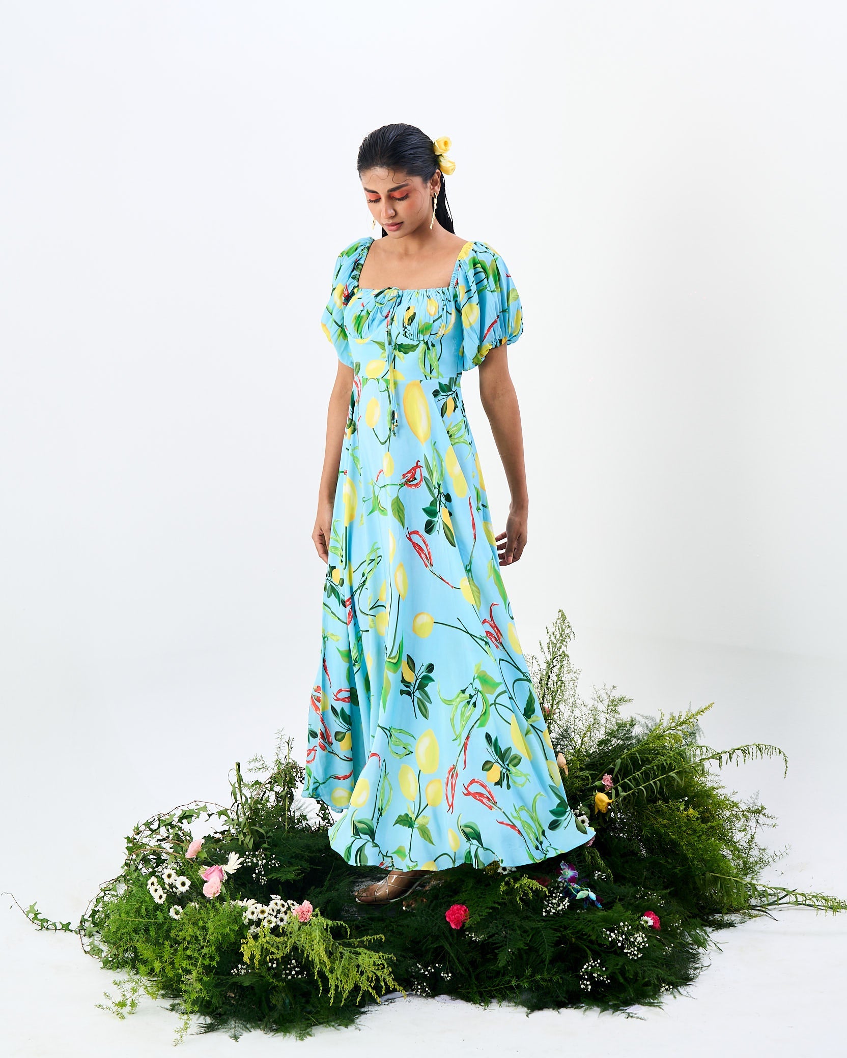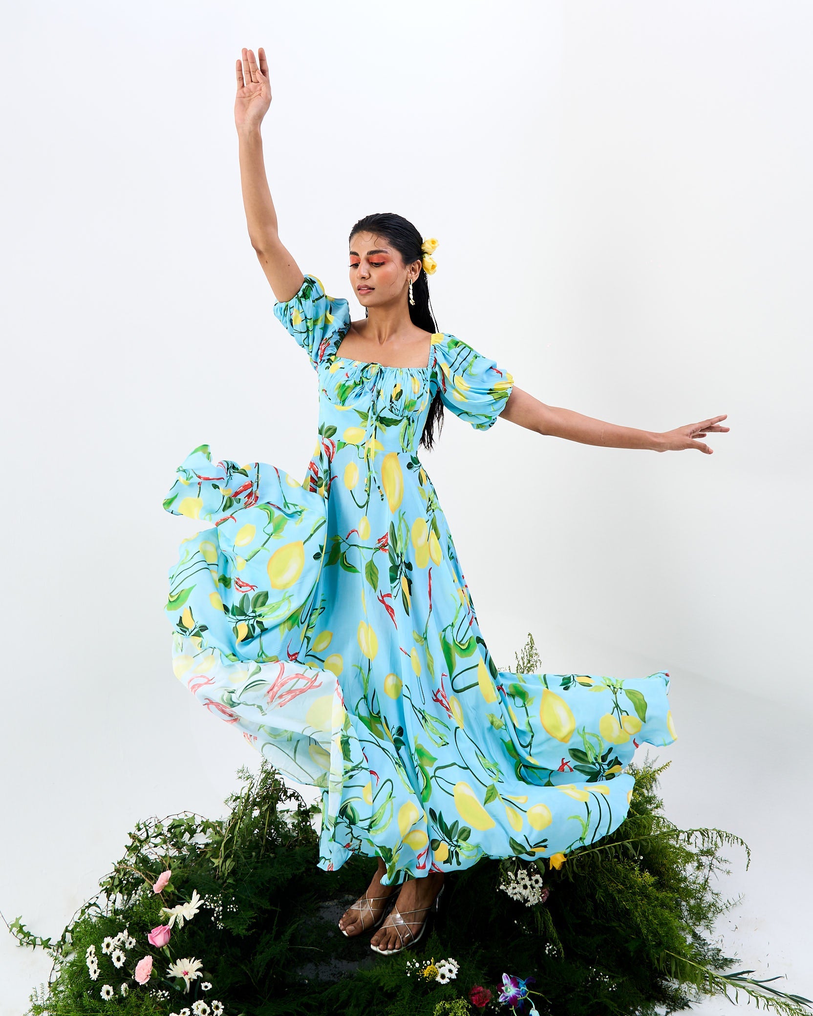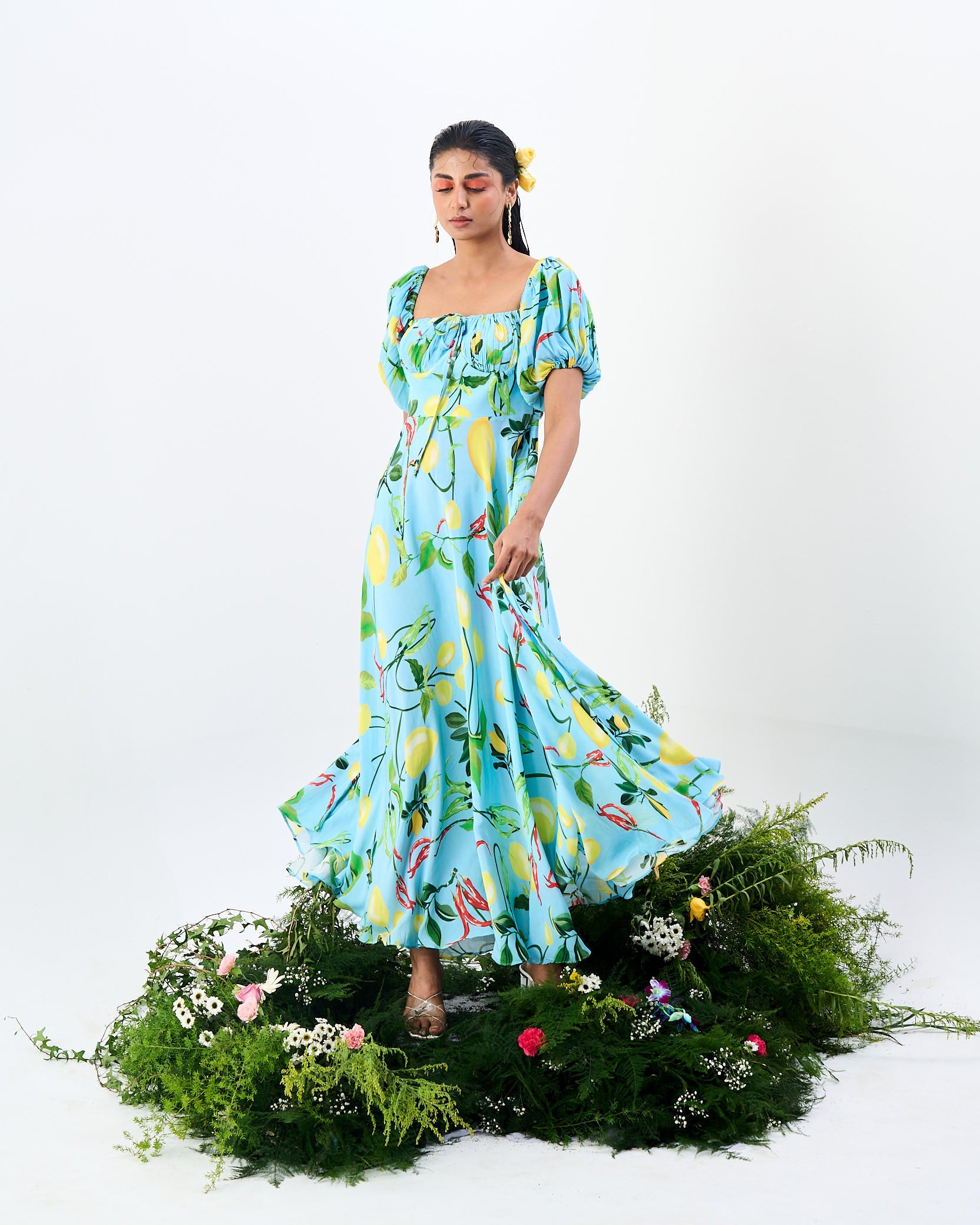 Our Nimbu Mirchi dress is a playful addition to our collection, featuring hand-painted lemons and chillies on a dress with drawstrings. This unique piece is perfect for the bold and quirky fashionista who loves to stand out in a crowd.