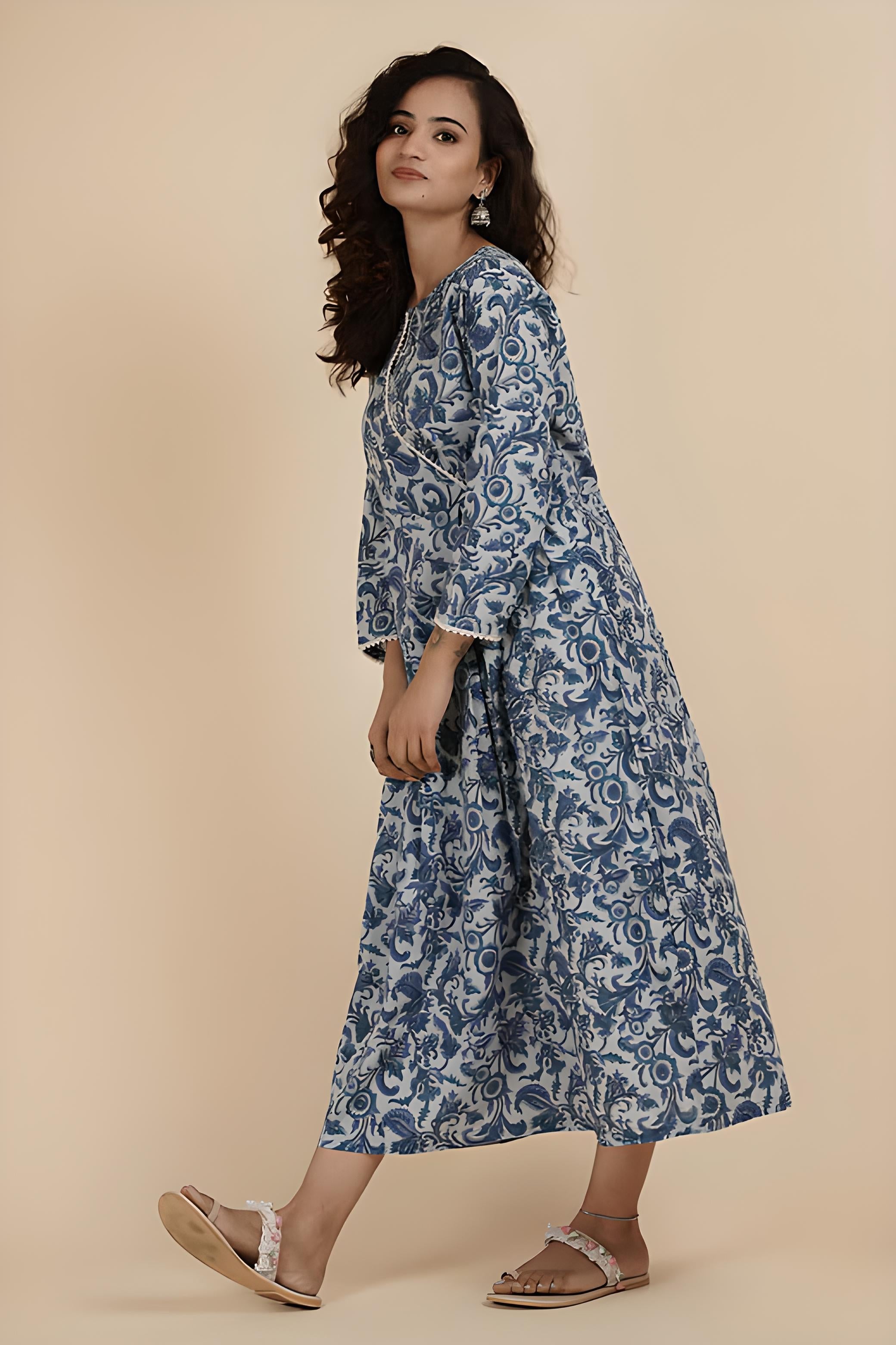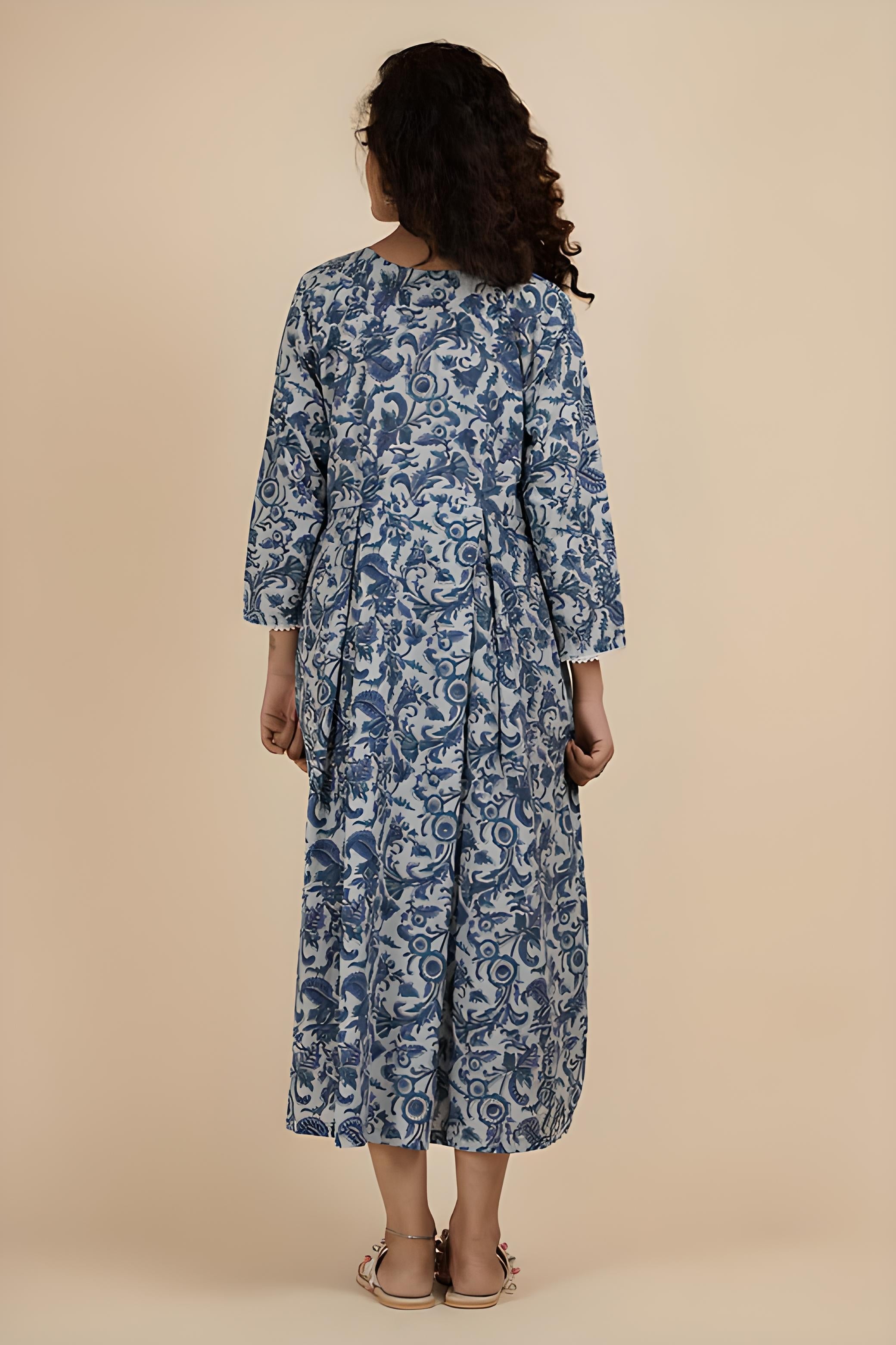 THE BLUE FLOWER: Hand block printed cotton dress with pearl detail