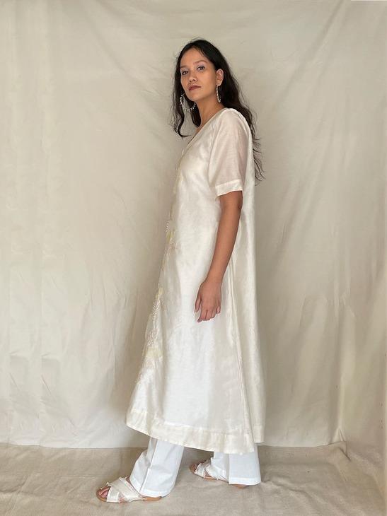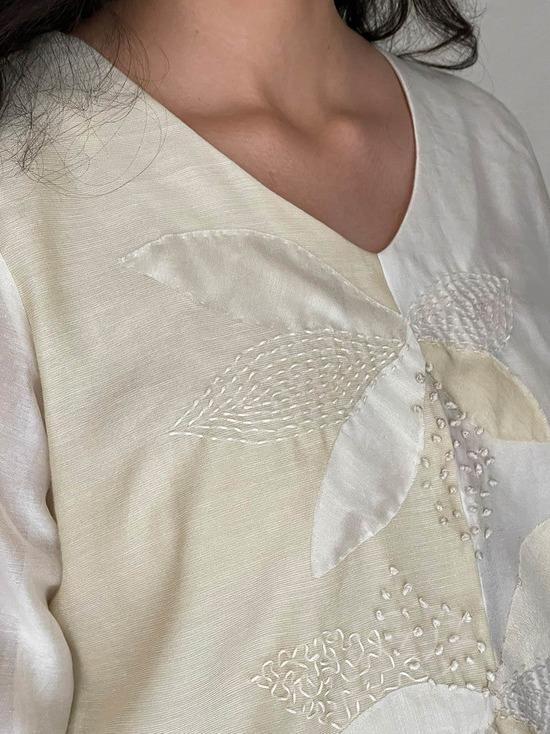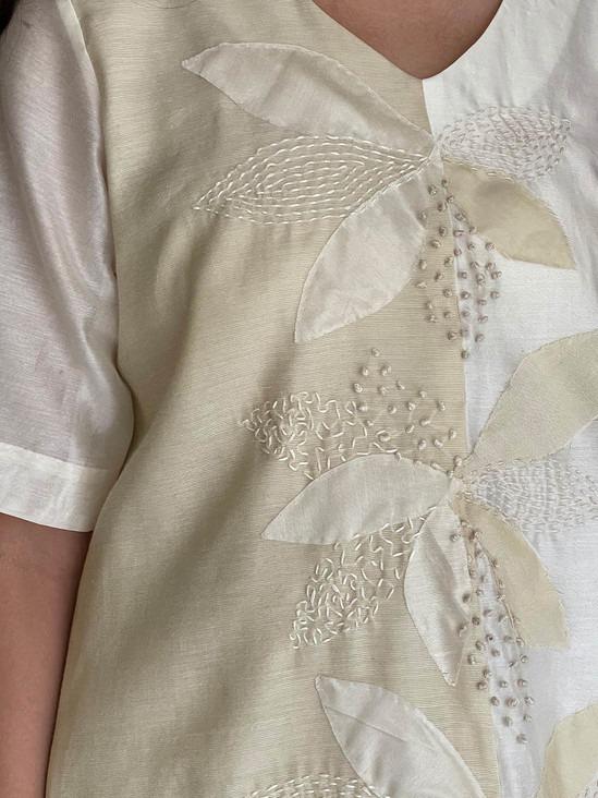 V-neck dual shade flared dress detailed with delicate hand applique and thread embroidery.