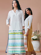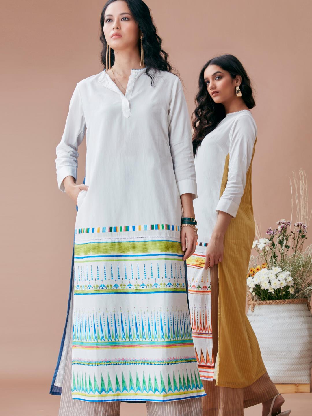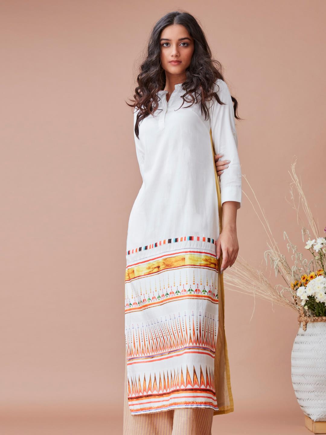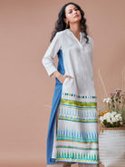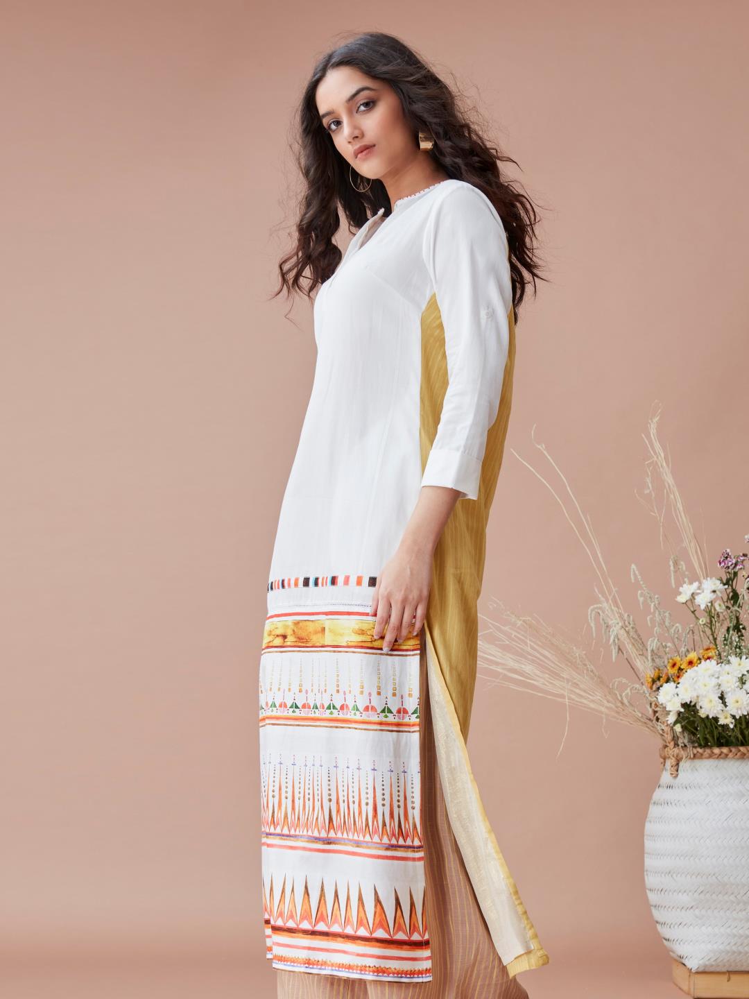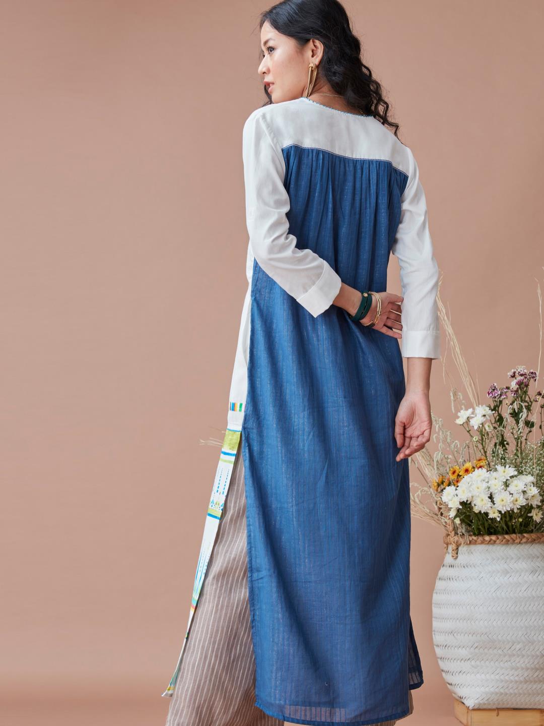 The OLEA dress kurta is crafted from combining 3 variations in cotton fabric. The front is crafted in solid cotton satin with ladder lace insert & digitally printed panel. The double layered back with subtle shimmer underlay creates a linear look.