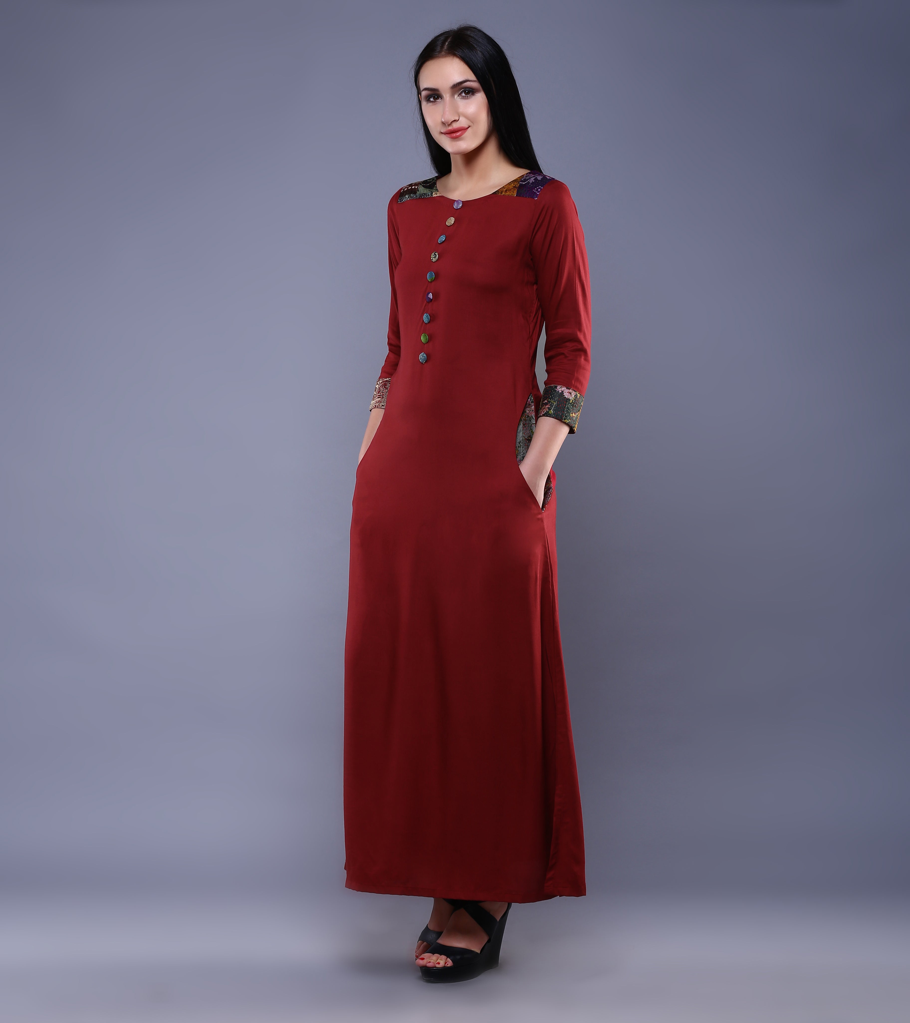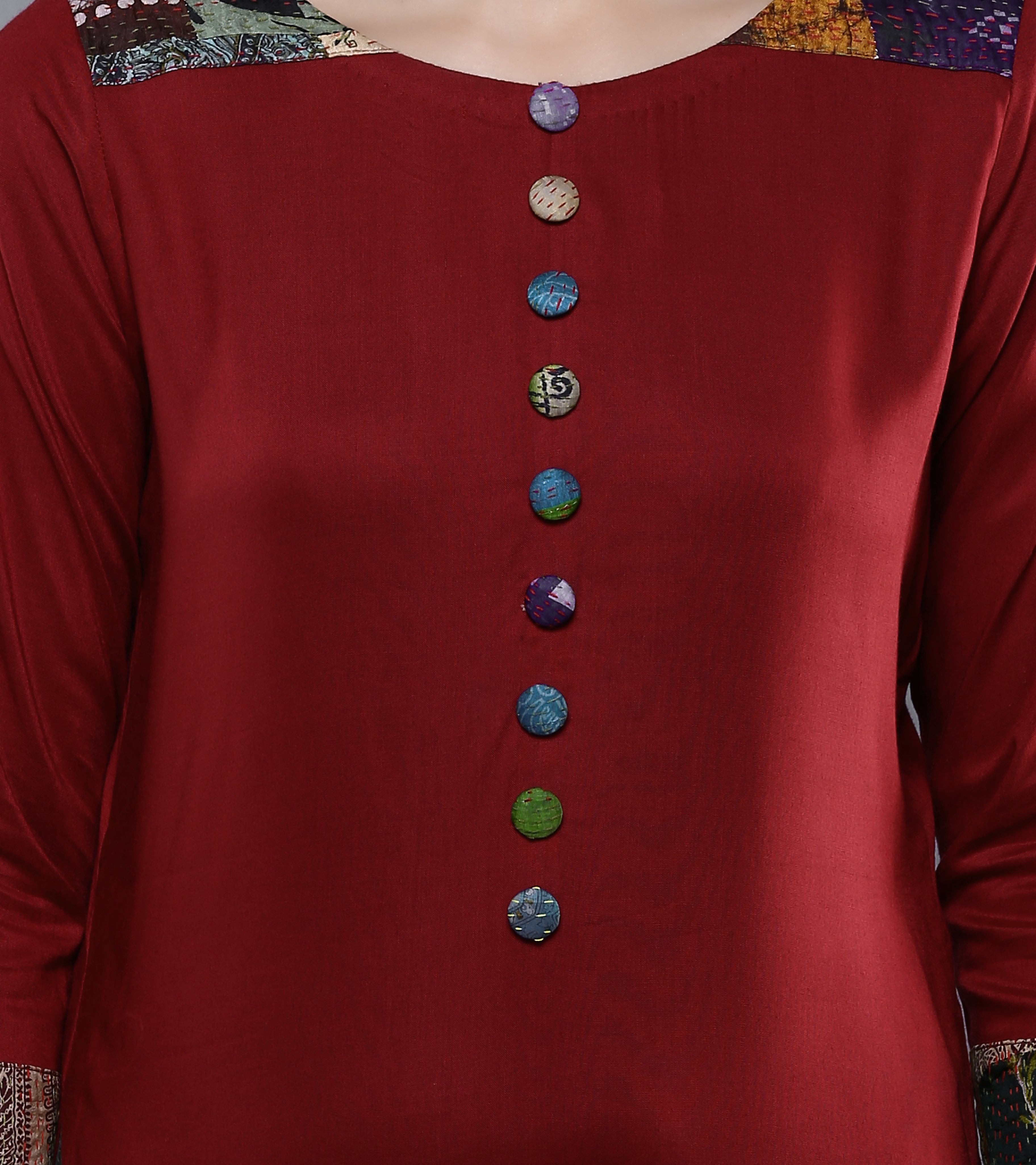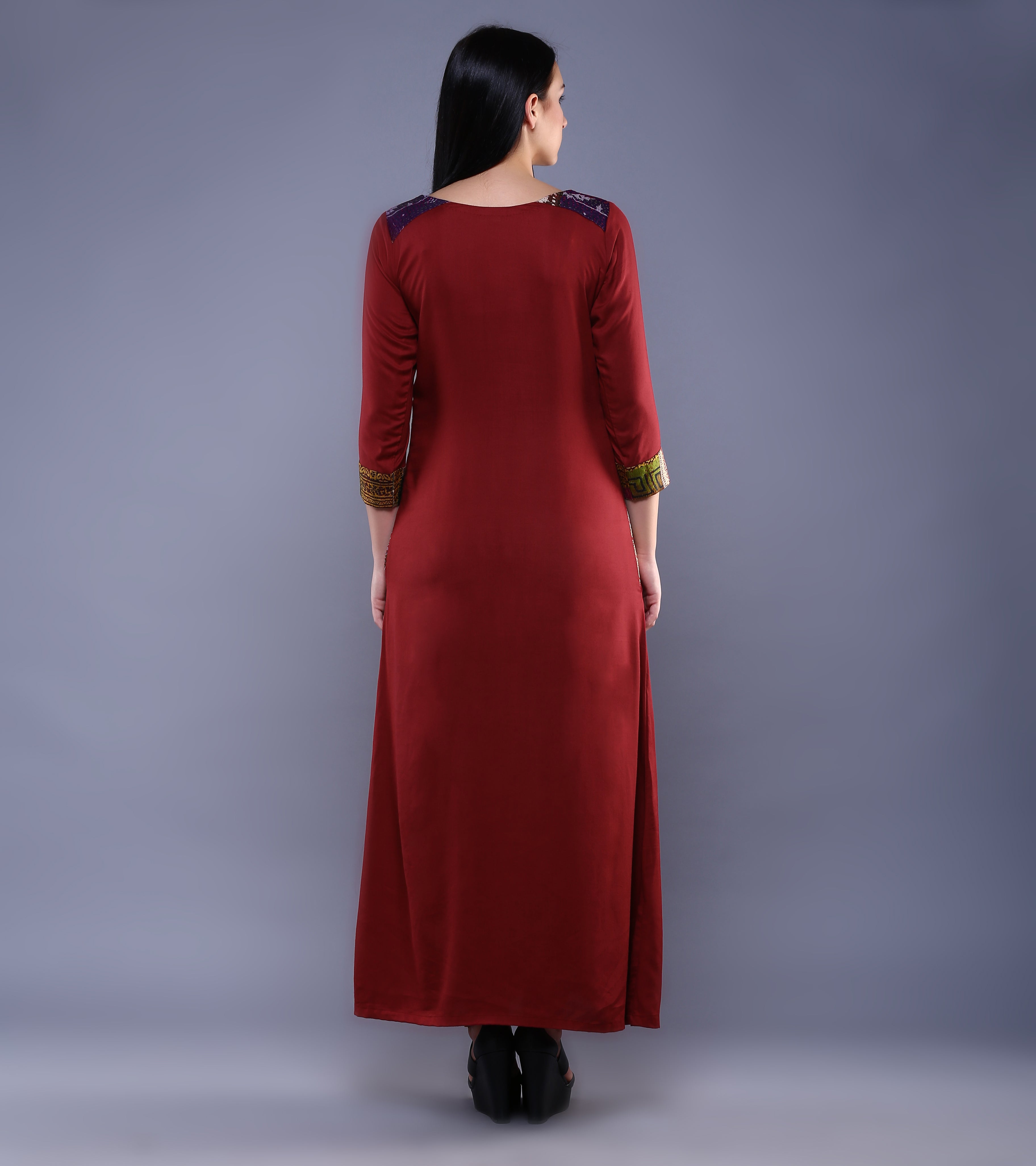 GULAAL: Red vintage silk kantha hand embroidered dress