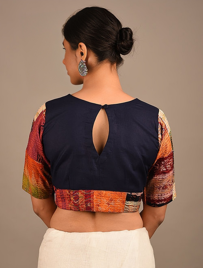 NEEL: Navy Blue Kantha Patchwork Blouse for Saree