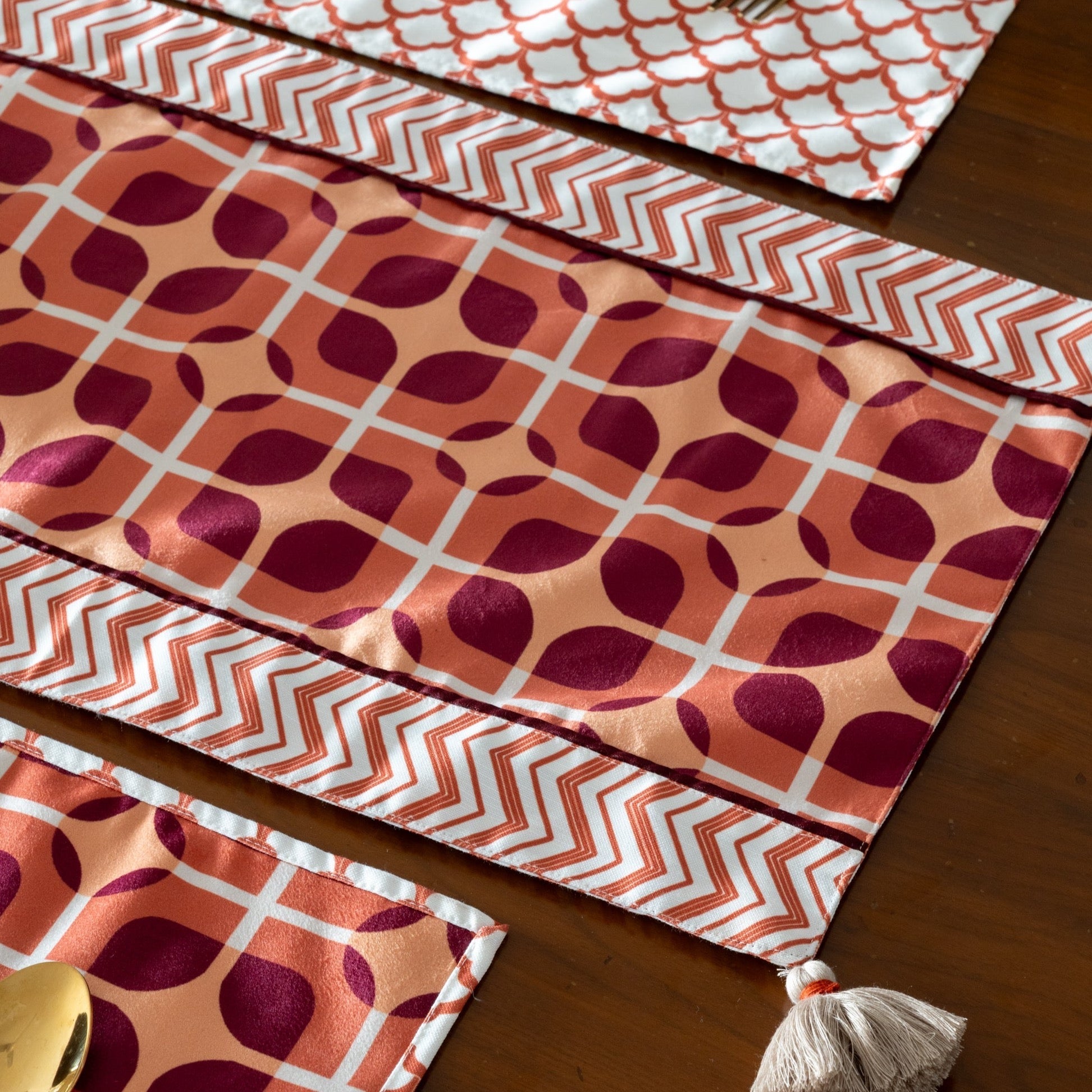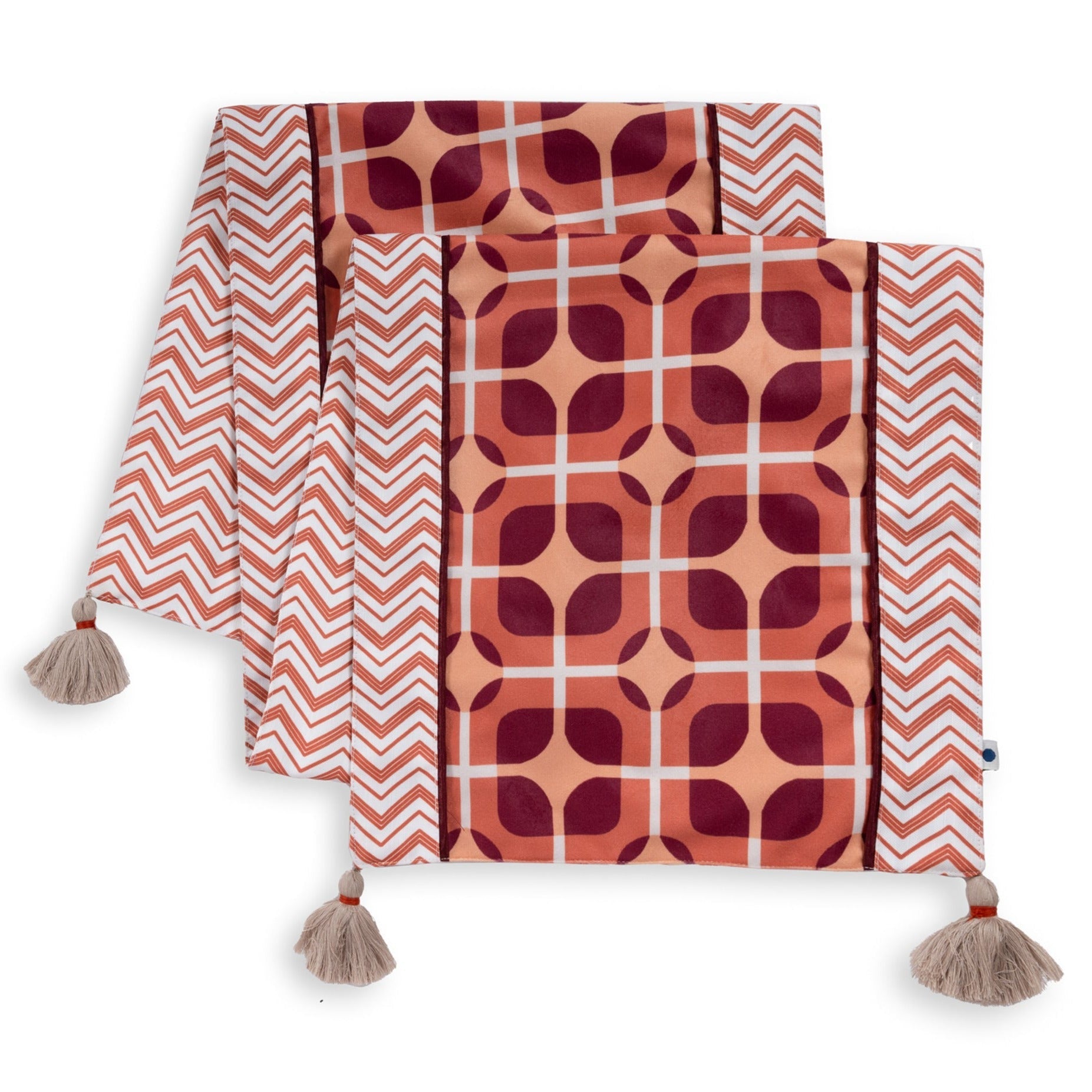 Introducing our Terra Tangle Table Runner, a captivating blend of earthy warmth and geometric intrigue. The deep rust tones of this table runner evoke the essence of rich, terracotta landscapes, while the intricate geometric pattern adds a contemporary twist.
