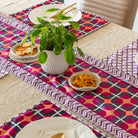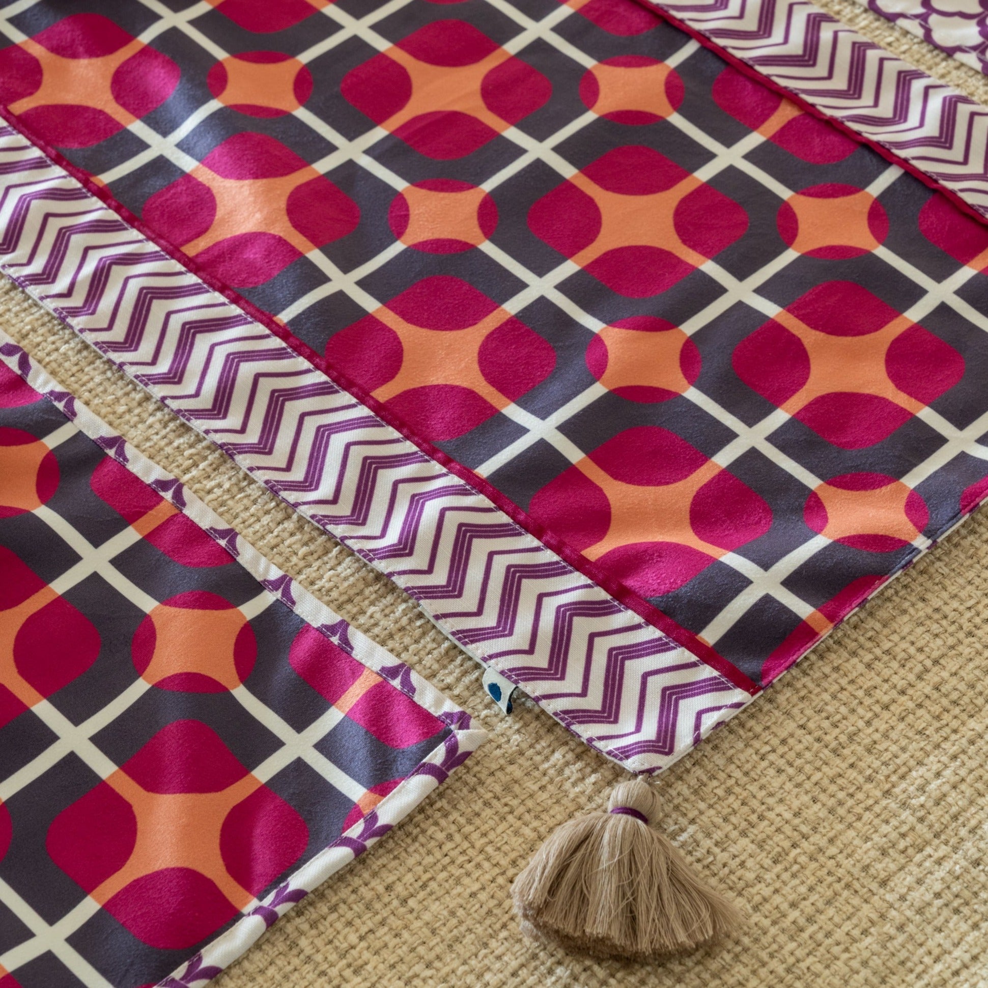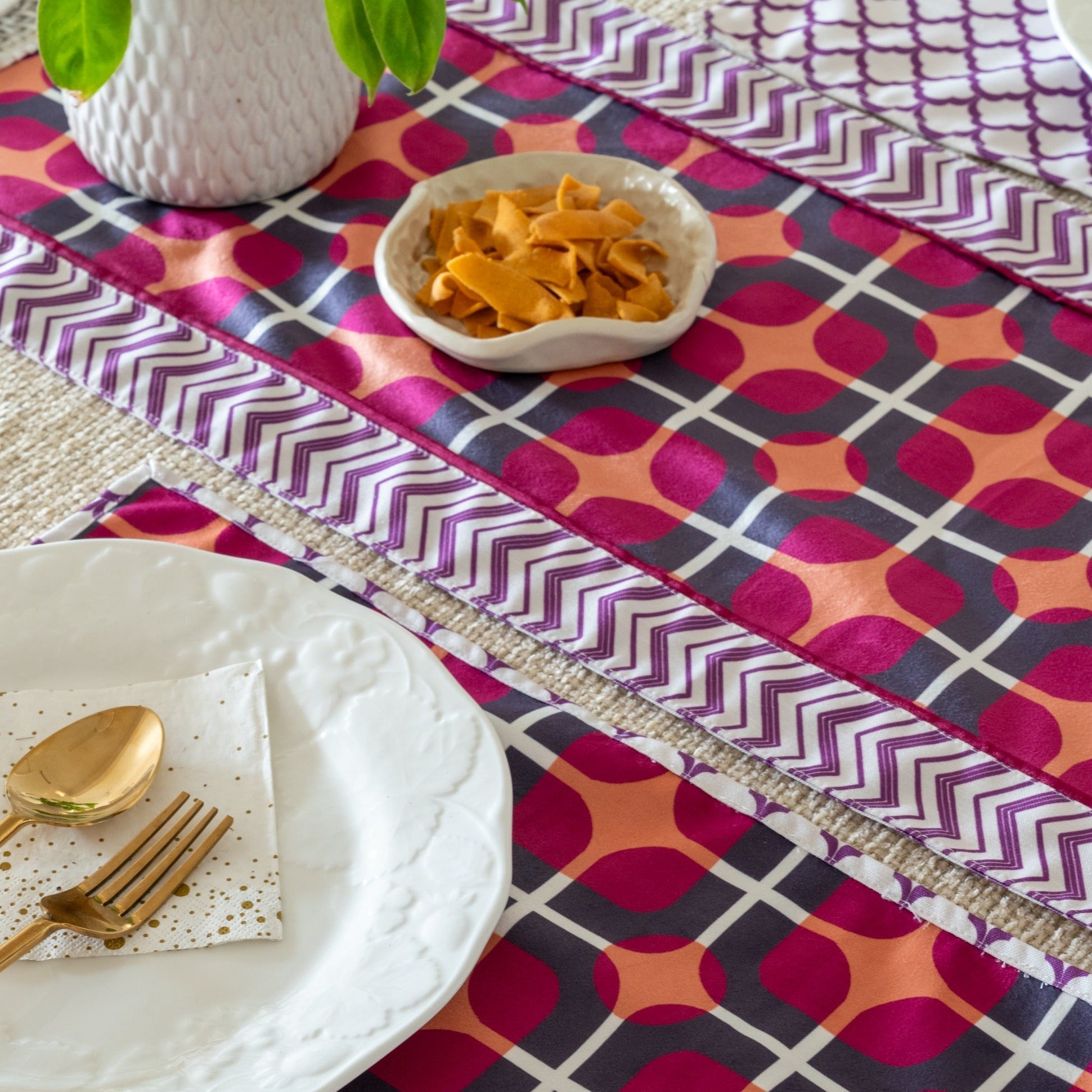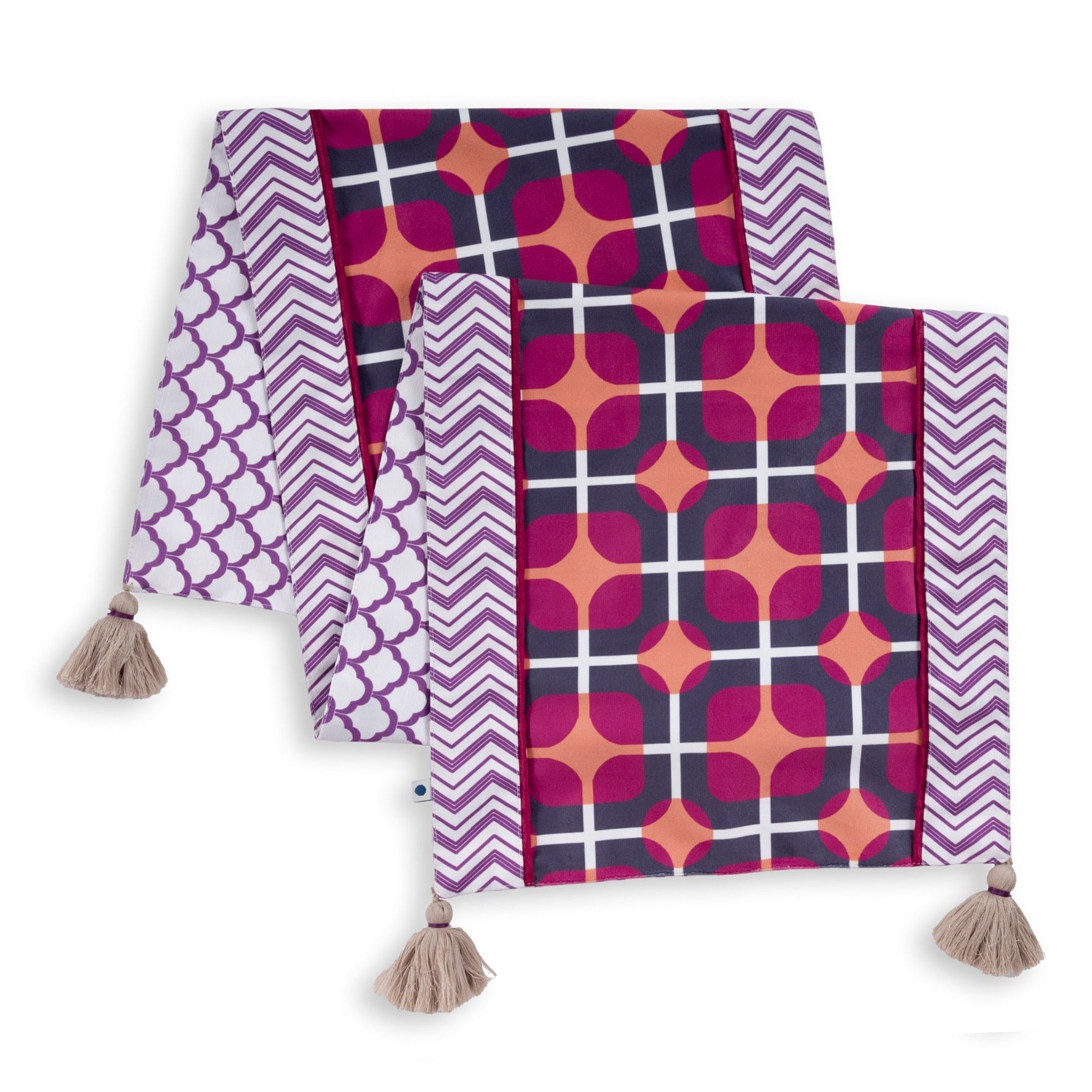 A captivating fusion of pink and purple hues that brings a touch of enchantment to your dining experience. This exquisite table runner is adorned with a mesmerizing geometric pattern, carefully curated to infuse your dining space with a sense of modern charm and vibrant elegance.