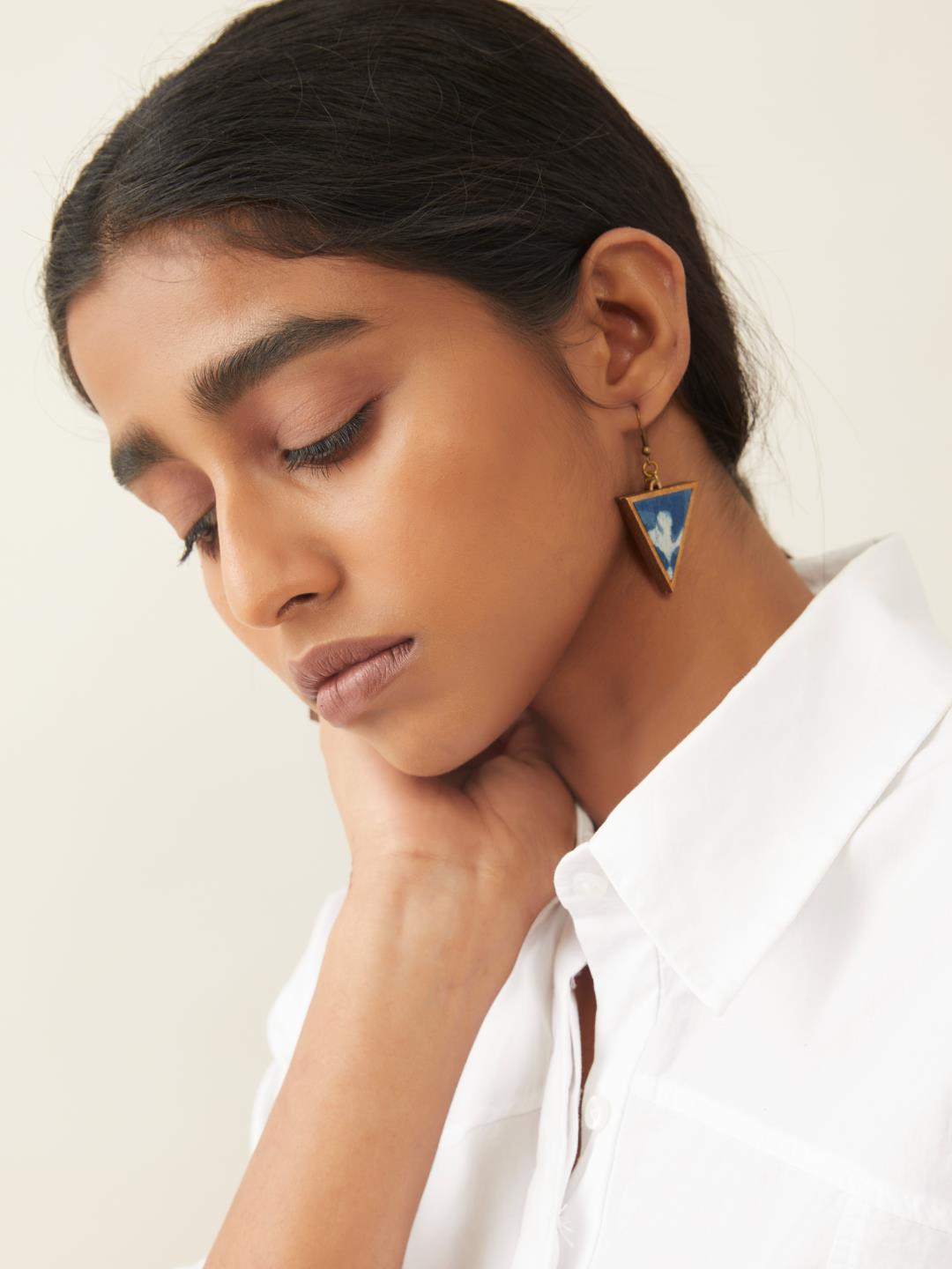 Whe Repurposed Wood Frame Blue Kalamkari Earring