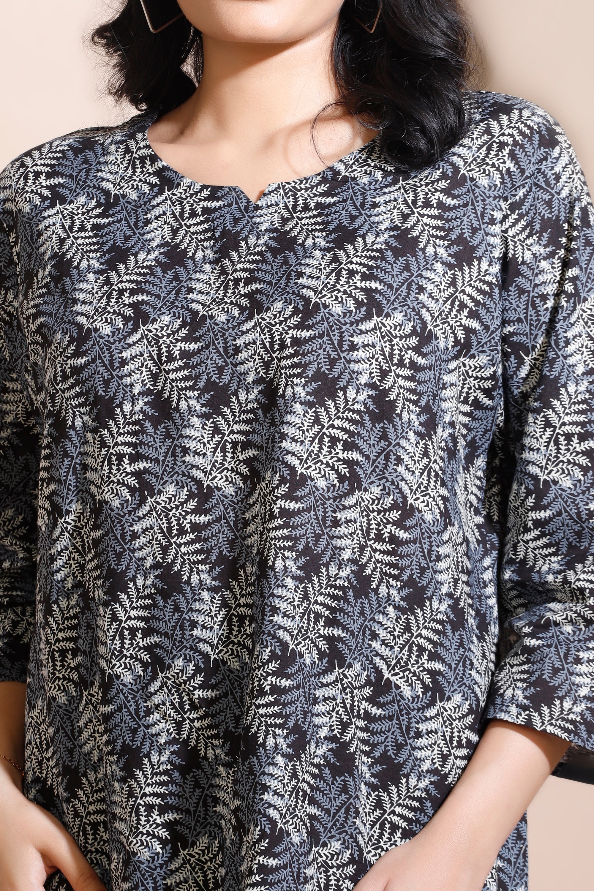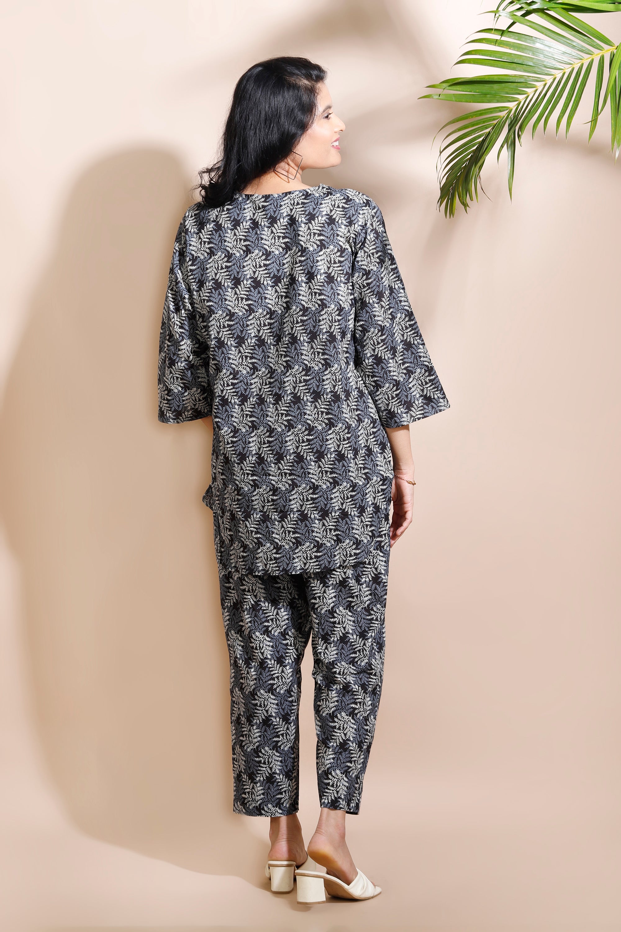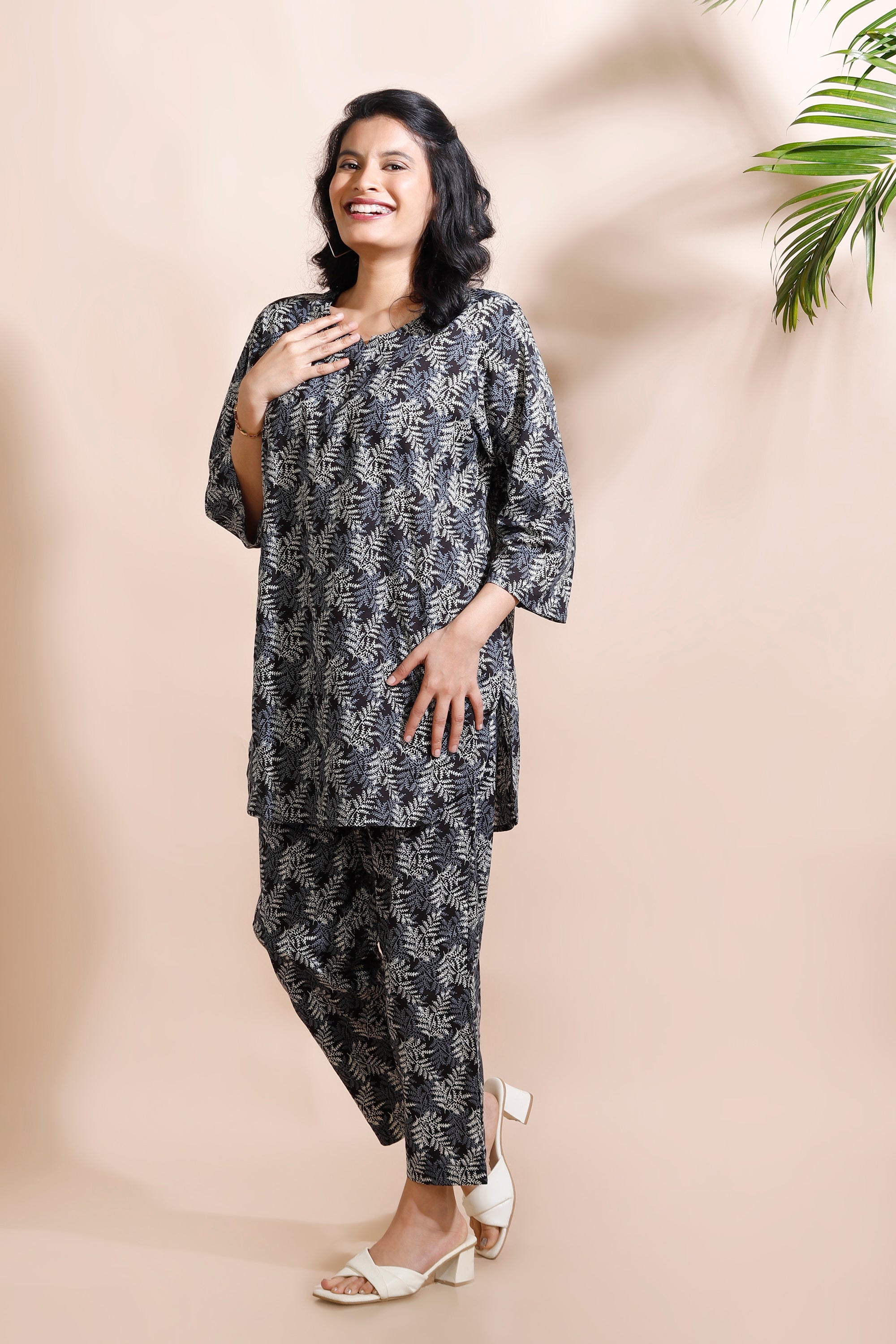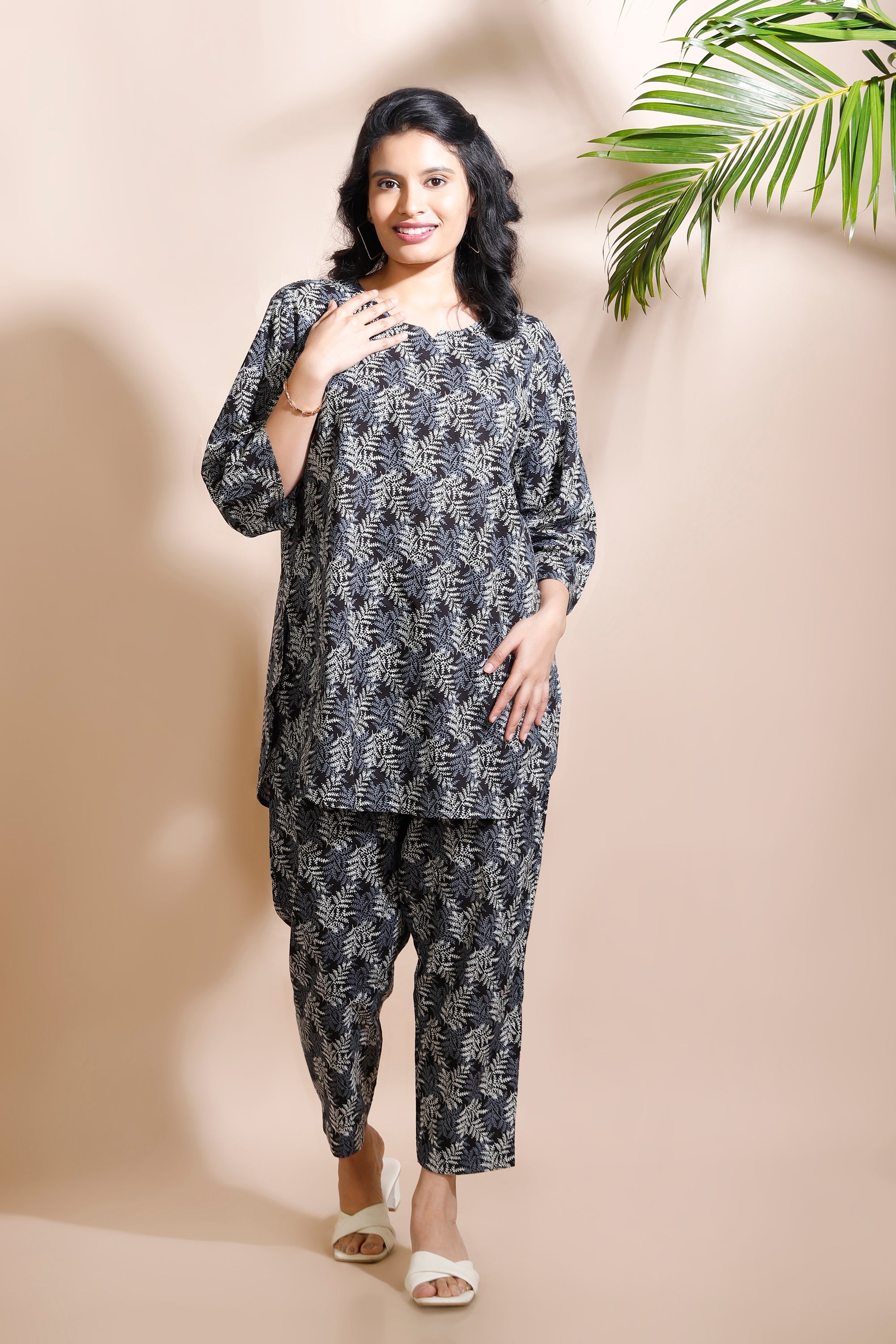 Discover the perfect blend of comfort and style with the BREATH:ABLES women’s black cotton abstract print co-ord set. Crafted from breathable premium cotton, this versatile set includes a hip-length kurta with a relaxed silhouette, round neck, and 3/4th sleeves, paired with short narrow-bottom pants. The elasticated waistband with adjustable drawstrings ensures a custom fit, while the modern abstract print in timeless black makes it a chic choice for lounging, casual outings, or travel. Designed for effortless wear and easy care, it keeps its shape and colour wash after wash.
