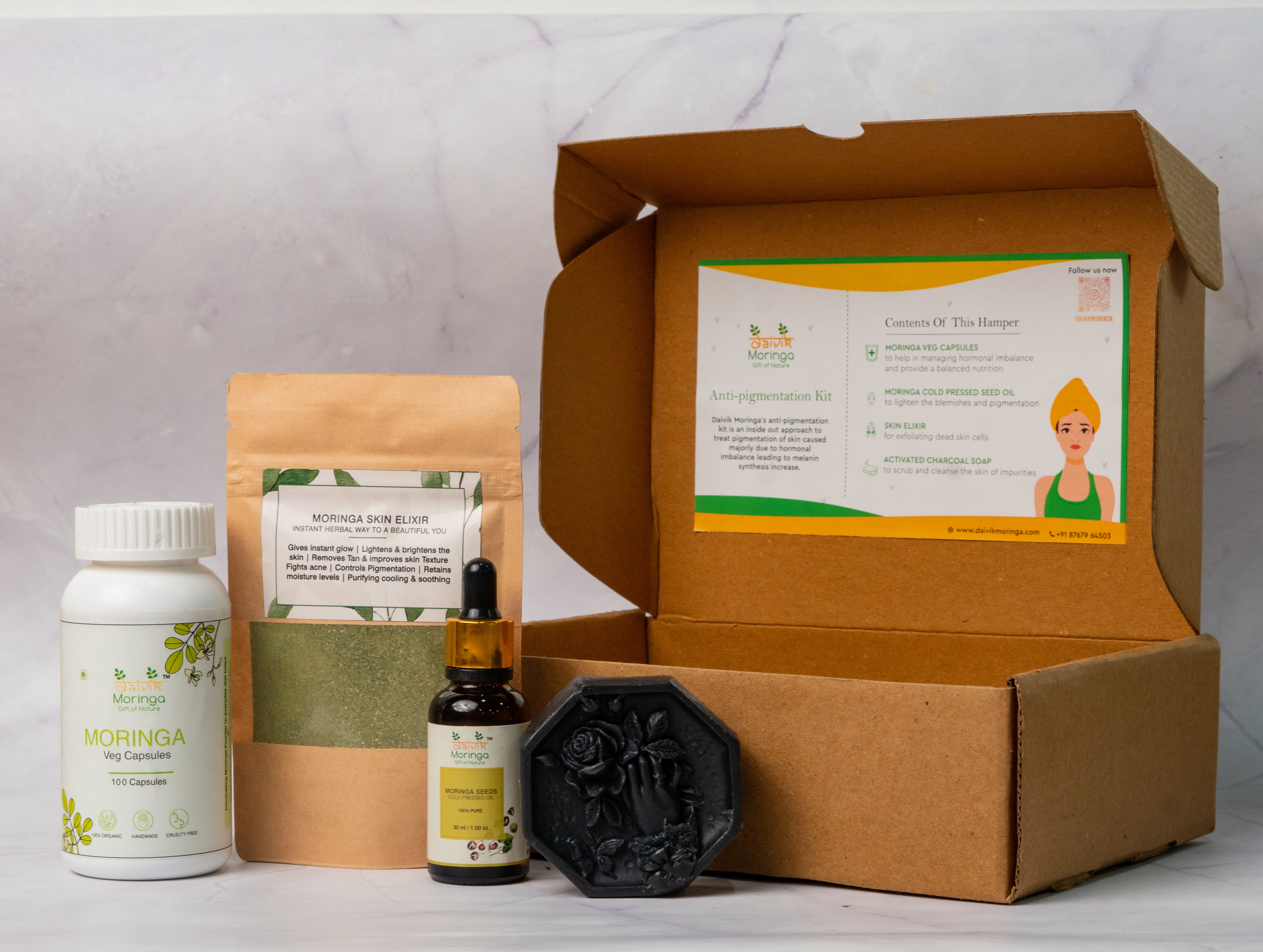 Daivik Moringa’s anti-pigmentation kit is an inside out approach to treat pigmentation of skin caused majorly due to hormonal imbalance leading to melanin synthesis increase.
