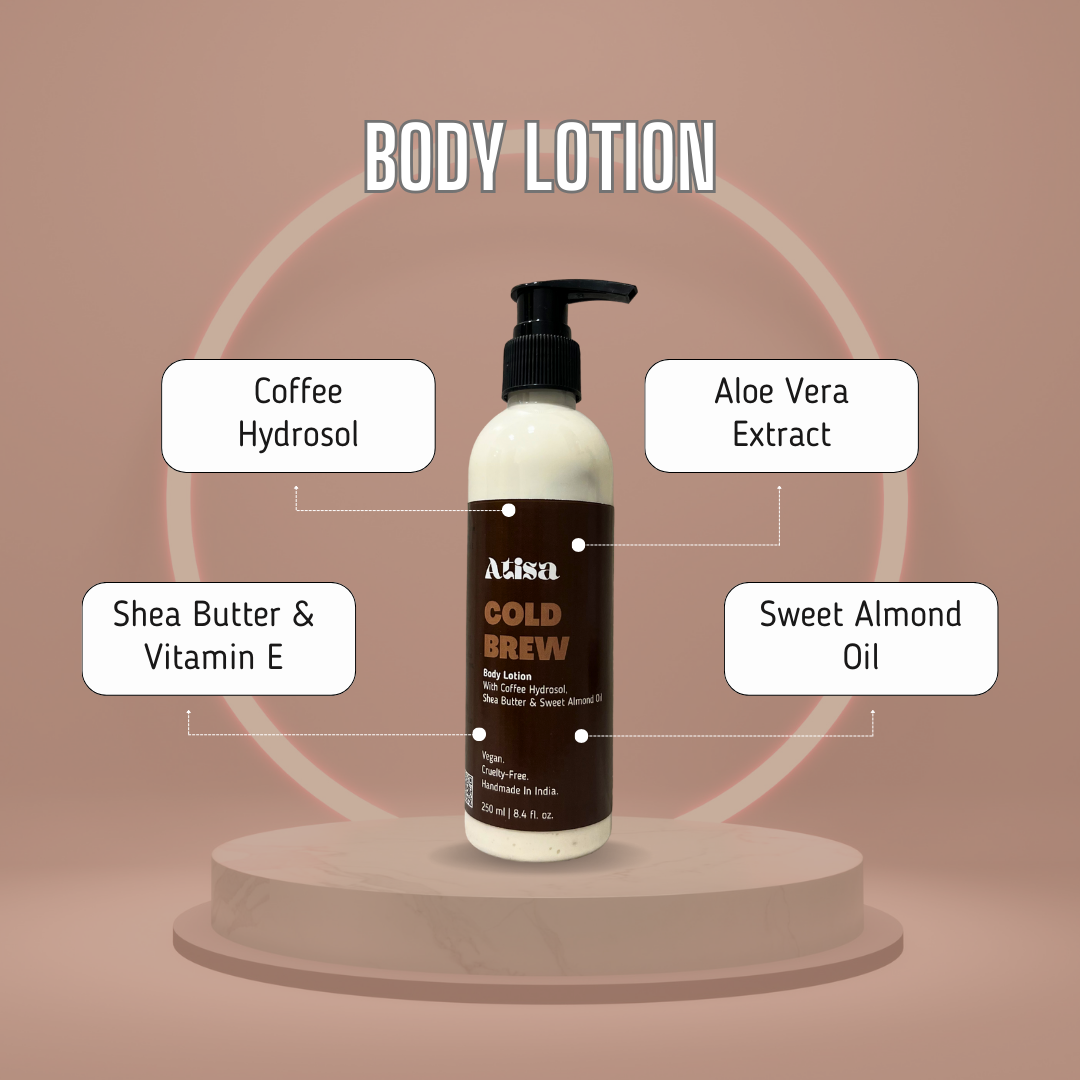 Leave your skin feeling moisturised without the greasiness with Atisa's collection of body lotions for a truly unique and memorable fragrance experience! Crafted with natural hydrosols, that are the gentler version of essential oils but with all the same goodness, they absorb easily into the skin nourishing it from within. Cold Brew is formulated with Coffee Hydrosol that: has skin toning and tightening properties, helps prevent signs of ageing, blemishes, dark spots and stimulates collagen growth, energizes and revives the mind. Along with the added benefits of Shea Butter, Sweet Almond Oil, Vitamin E and Aloe Vera Extract for maximum skin nourishment!