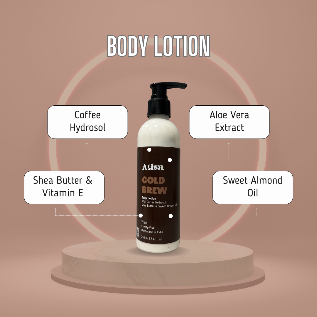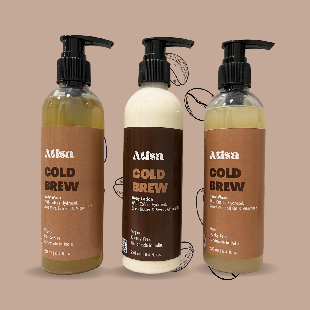 Leave your skin feeling fresh, hydrated and moisturised with Atisa's collection of body wash + body lotion + hand wash combos for a truly unique and memorable fragrance experience! Crafted with natural hydrosols, that are the gentler version of essential oils but with all the same goodness, they absorb easily into the skin nourishing it from within. Cold Brew is formulated with Coffee Hydrosol that: has skin toning and tightening properties, helps prevent signs of ageing, blemishes, dark spots and stimulates collagen growth, energizes and revives the mind. Along with the added benefits of Vitamin E, Aloe Vera Extract and Glycerine in the body wash, Shea Butter, Sweet Almond Oil, Vitamin E and Aloe Vera Extract in the body lotion and Sweet Almond Oil, Vitamin E and Glycerine in the hand wash for maximum skin nourishment!