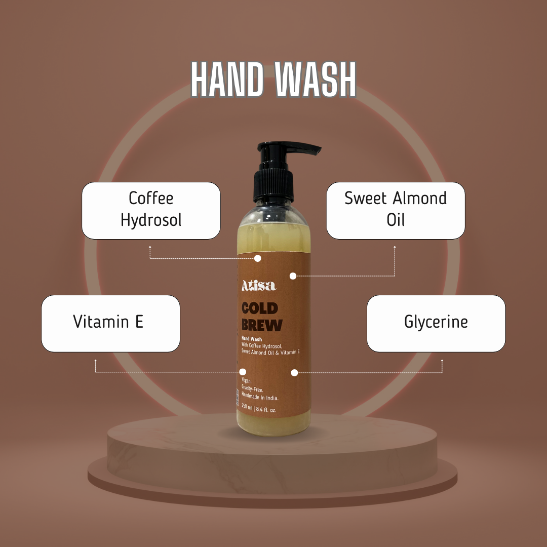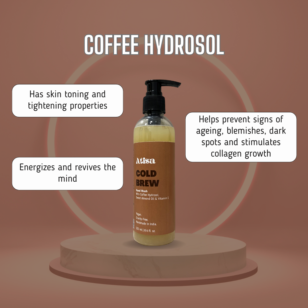 Leave your hands feeling fresh and hydrated with Atisa's collection of hand washes for a truly unique and memorable fragrance experience! Crafted with natural hydrosols, that are the gentler version of essential oils but with all the same goodness, they absorb easily into the skin nourishing it from within. Cold Brew is formulated with Coffee Hydrosol that: has skin toning and tightening properties, helps prevent signs of ageing, blemishes, dark spots and stimulates collagen growth, energizes and revives the mind. Along with the added benefits of Sweet Almond Oil, Vitamin E and Glycerine for maximum skin nourishment!