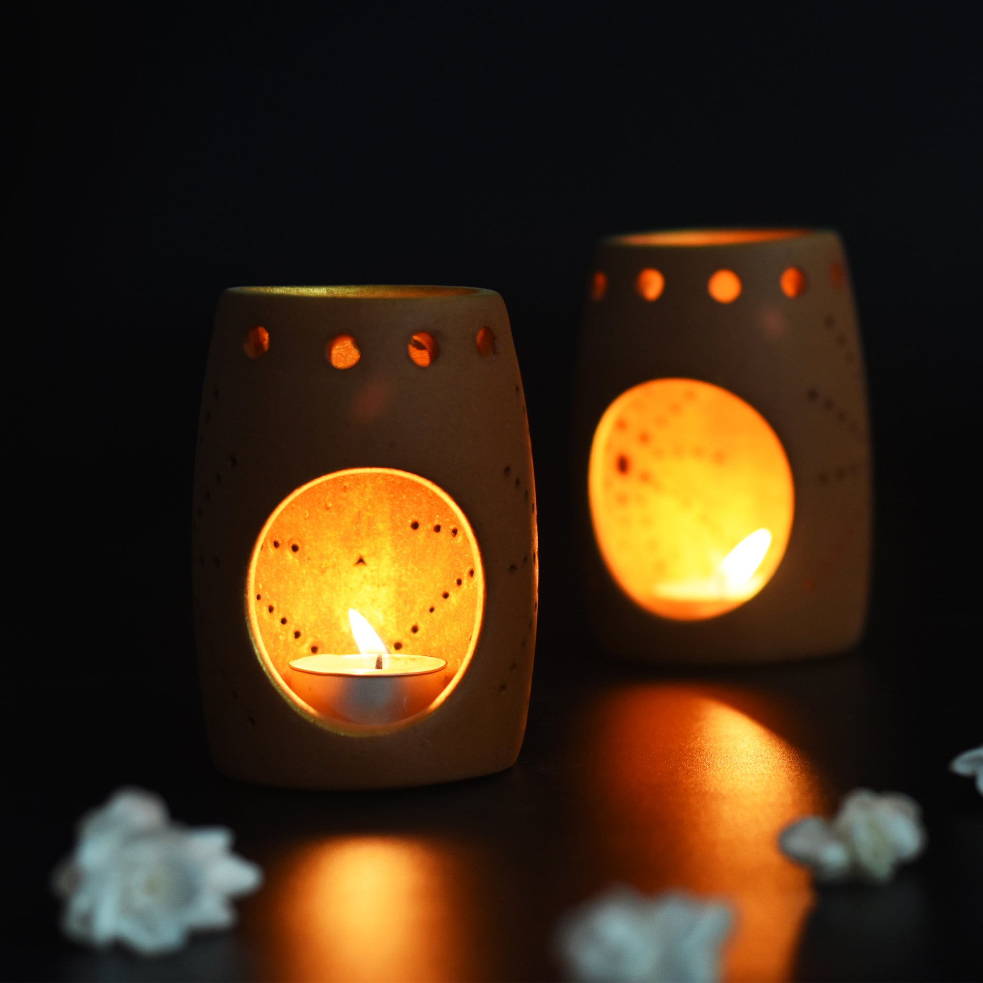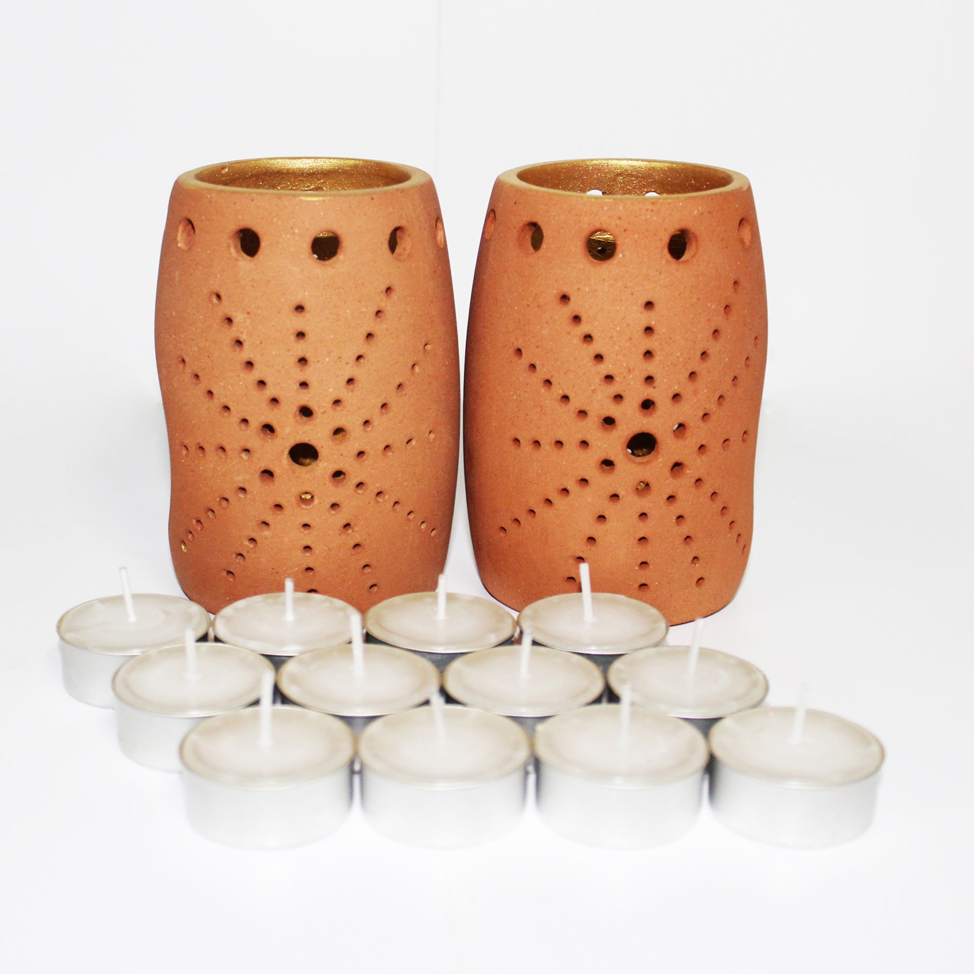 Package contains : set of 2 terracotta clay candle holder + 2 complimentary tealight candles