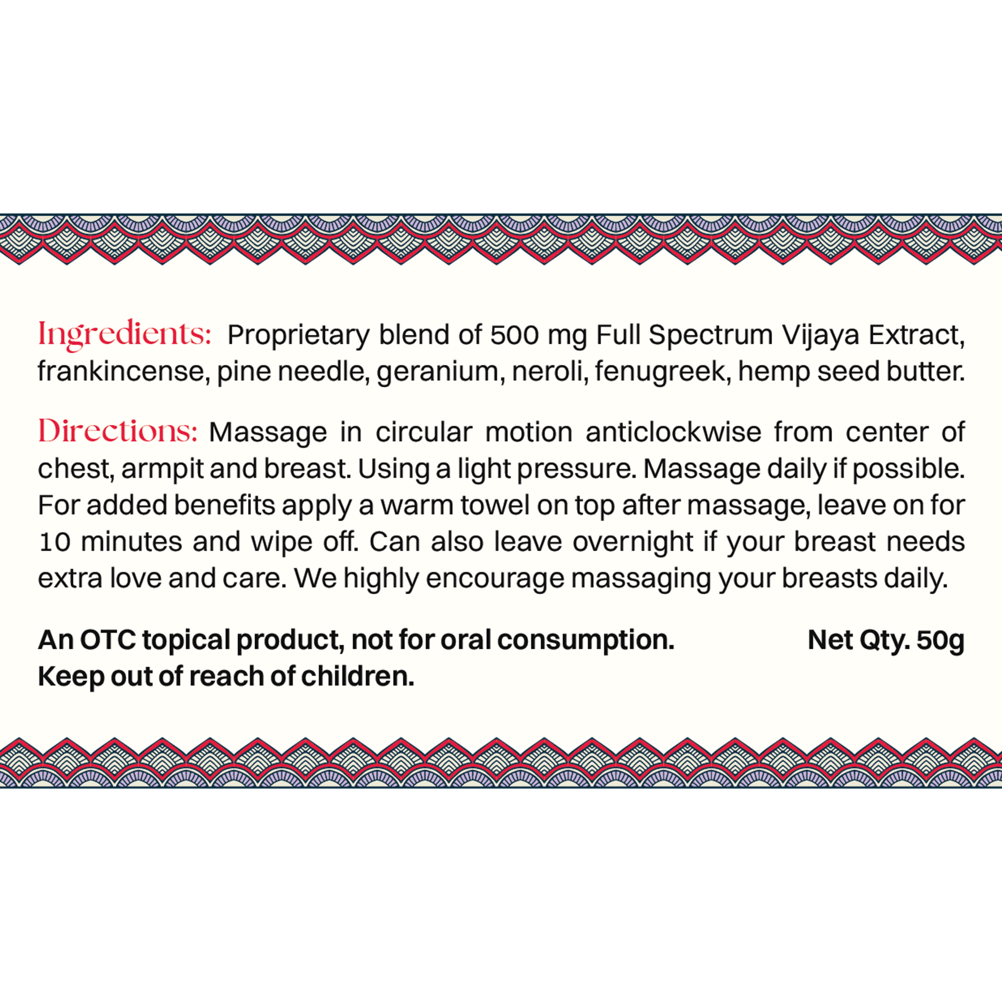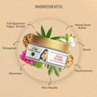 Ingredients: Proprietary blend of 500 mg Full Spectrum Vijaya Extract, frankincense, pine needle, geranium, neroli, fenugreek, hemp seed butter.
