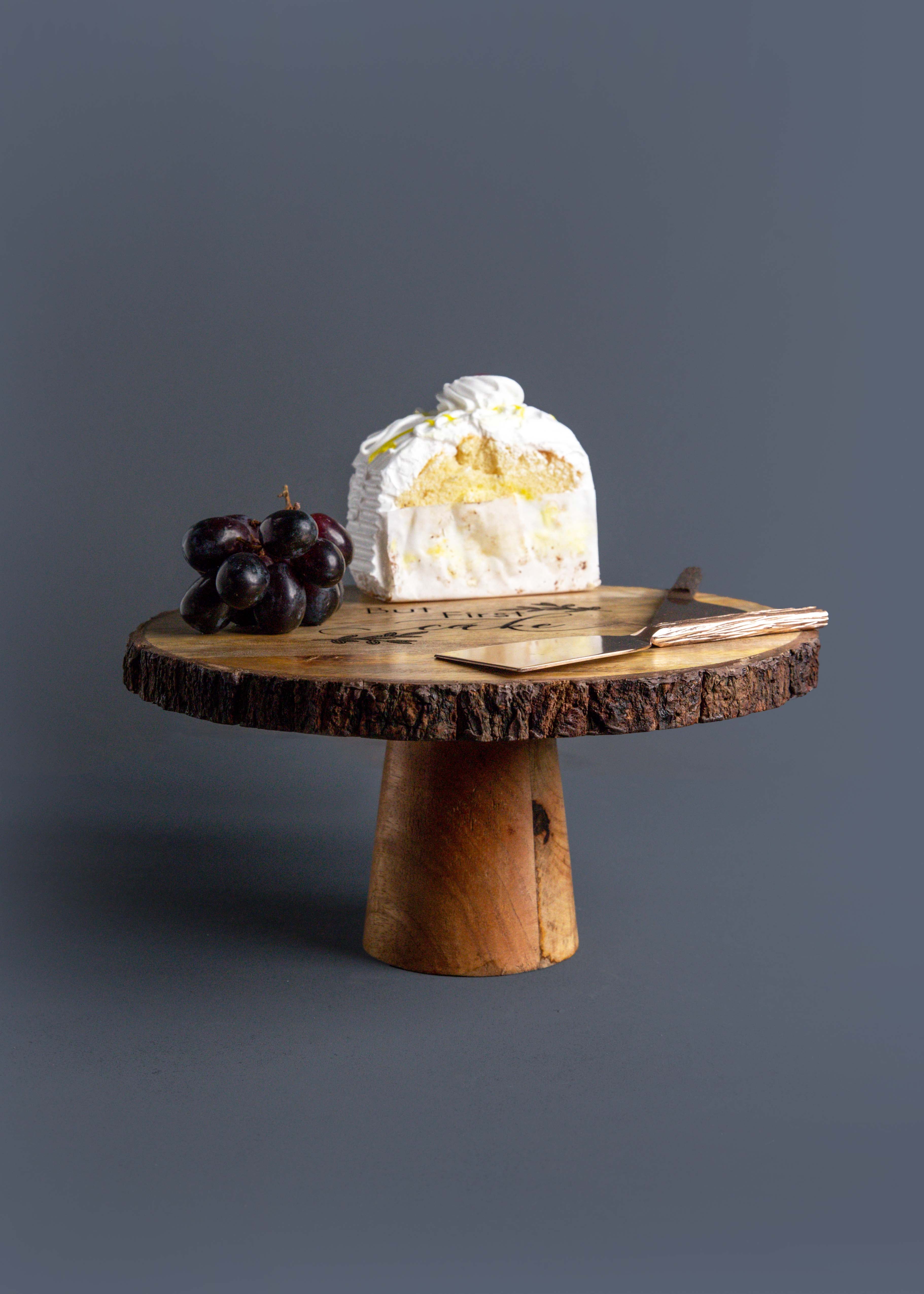 Serve your sweet treats on this rustic, handcrafted cake stand. Made in mango wood with bark edges, engraved in a fun mood setting text, this cake stand would be a go to for all your celebrations.