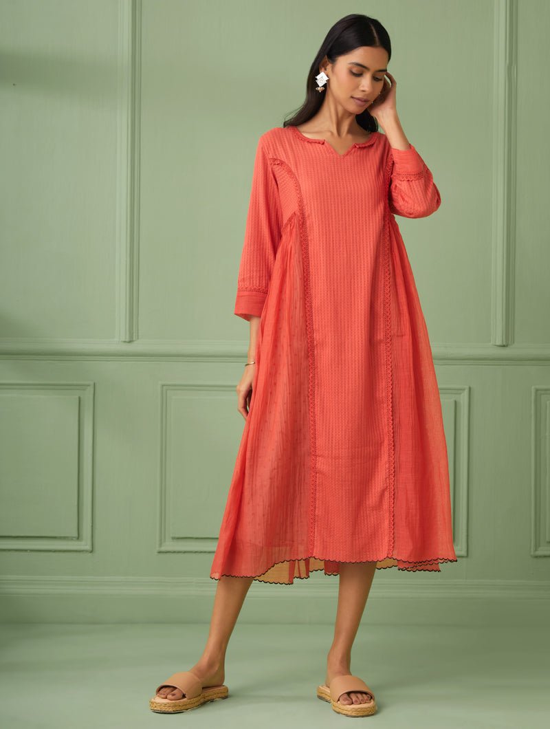 A beautiful coral calf length dress made in soft cotton silk has lace detailing at princess line and the neckline, with delicate even gathers in the side panel. The hem of the dress is adorned with embroidery and the sleeves has lace details with hand stitiches in black. This set of 2 comes in Blockprinted soft cotton slip.