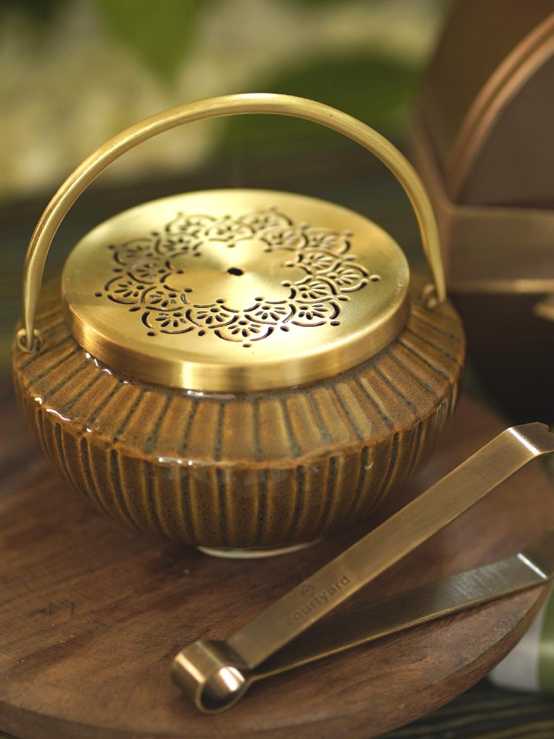 This Mandala Fumer with Tong by Courtyard will further elevate your spiritual experience. It contains one fumer, two resin boxes, two charcoal pieces and one Tong. The set is hand-crafted with precision using cast brass and imparts a smooth finished look that is sure to catch your fancy.