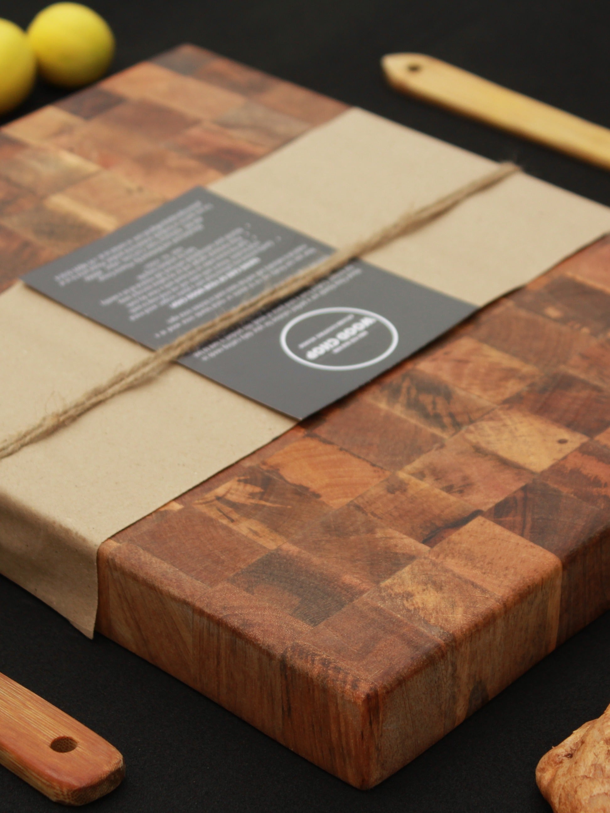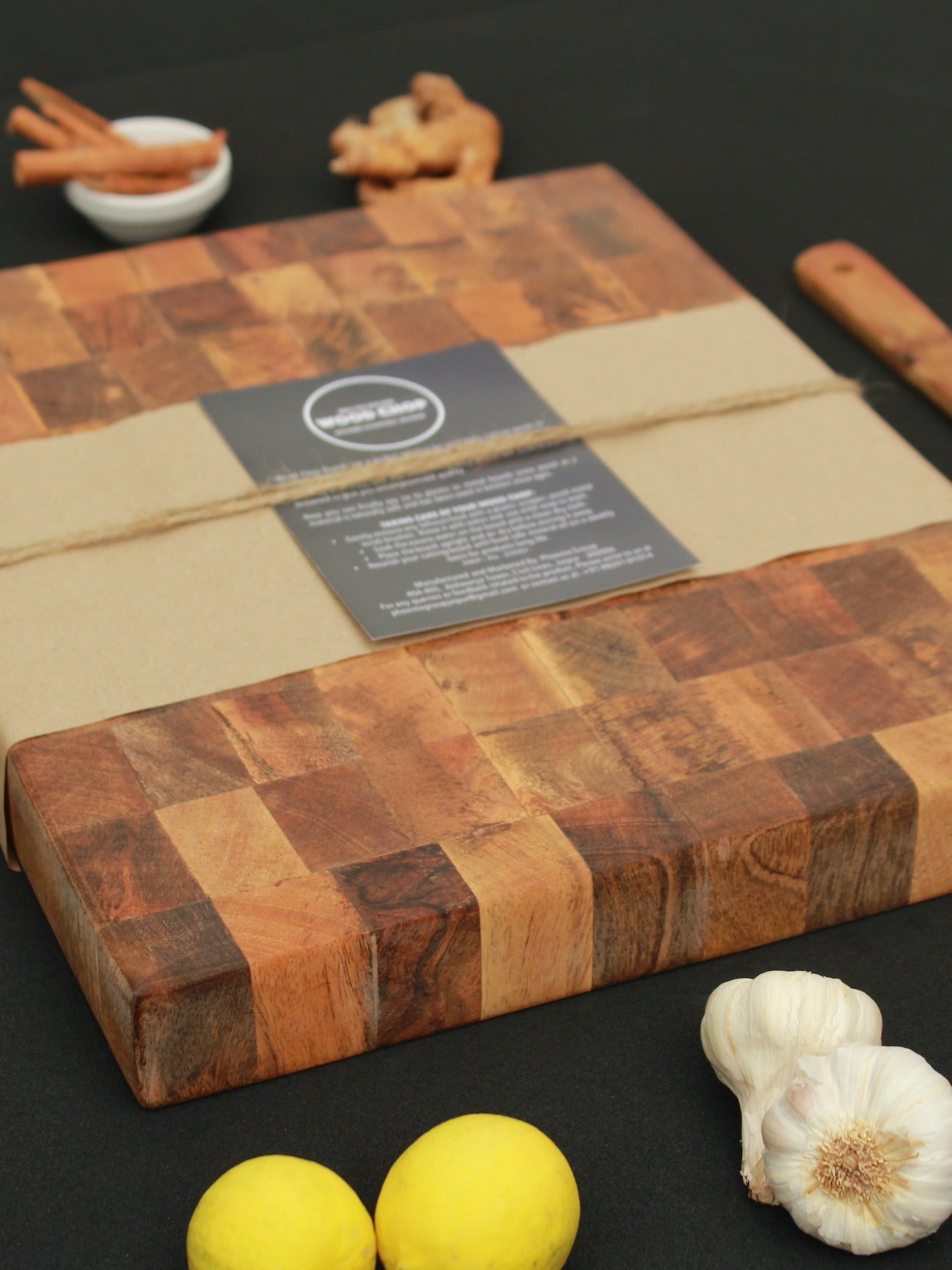 This end grain chopping board made from durable mango wood offers a smooth, self-healing surface, perfect for preserving knife edges while adding a touch of natural elegance to your kitchen
