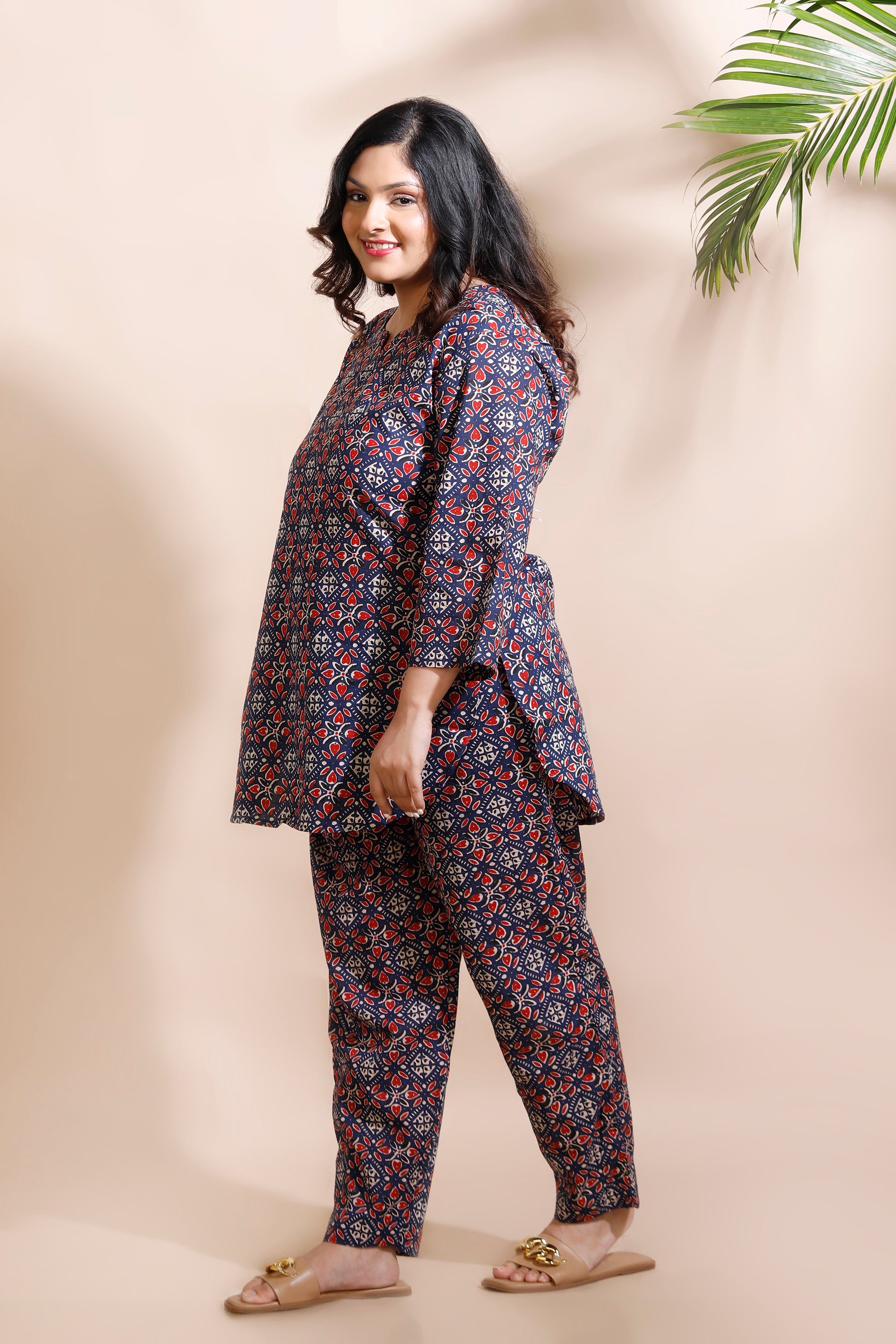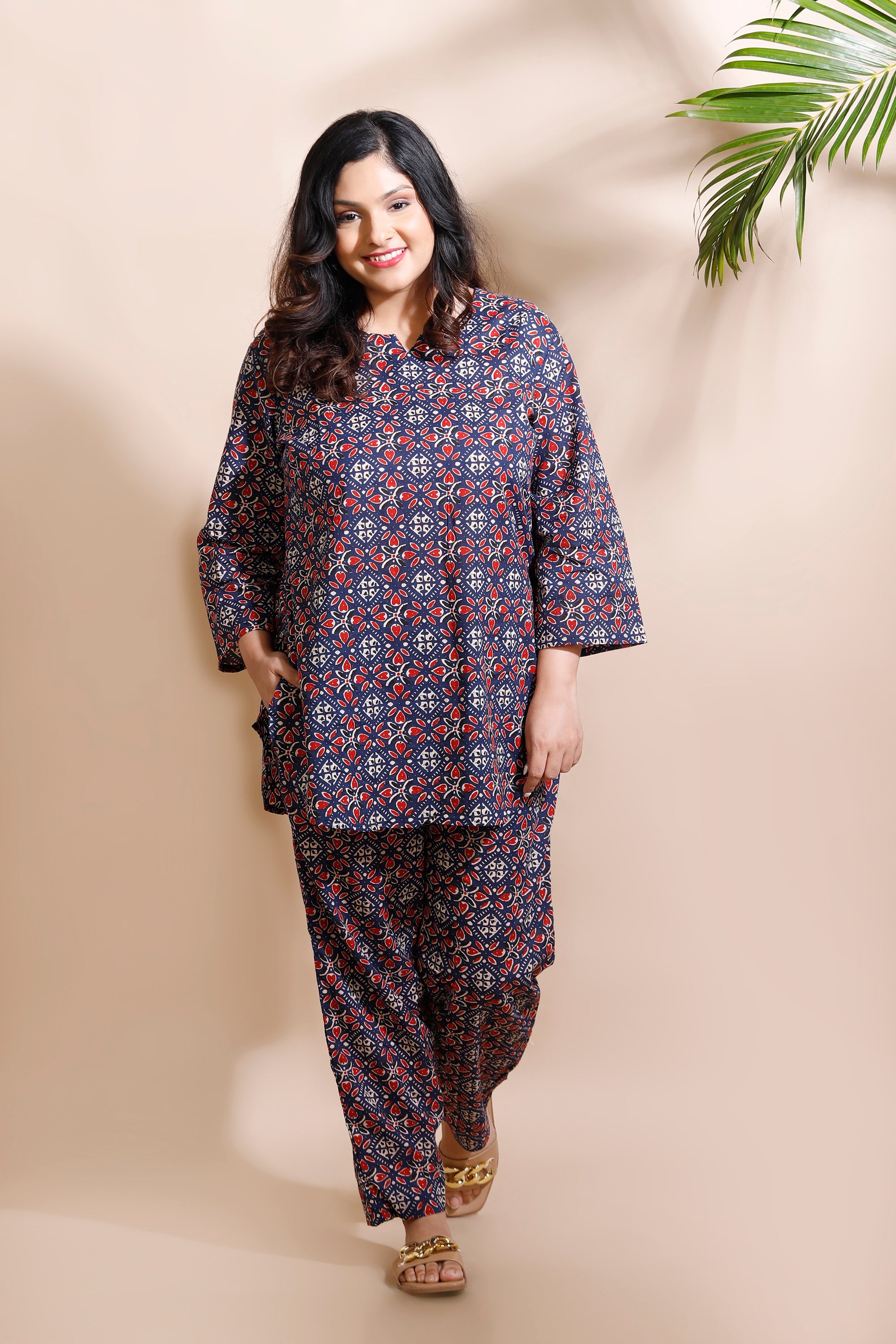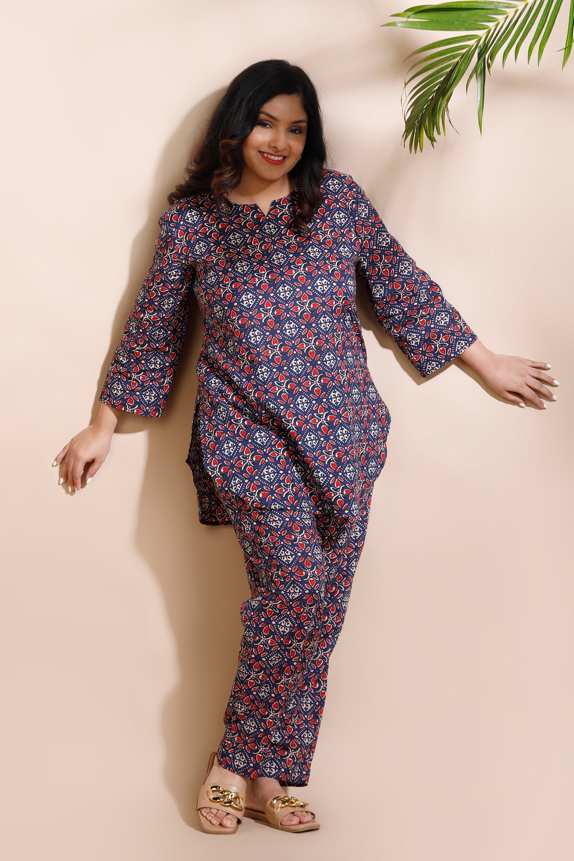 Elevate your loungewear collection with the BREATH:ABLES women’s blue cotton geometric print co-ord set. Crafted from soft, breathable premium cotton, this set features a hip-length kurta with a relaxed round neck and 3/4th sleeves, paired with short narrow-bottom pants. Designed with an elastic waistband and adjustable drawstrings, the pants provide a customised, comfortable fit. The bold geometric print in calming blue tones adds a modern, stylish edge. Perfect for home, casual outings, travel, or work-from-home days, this set combines comfort and chic versatility.