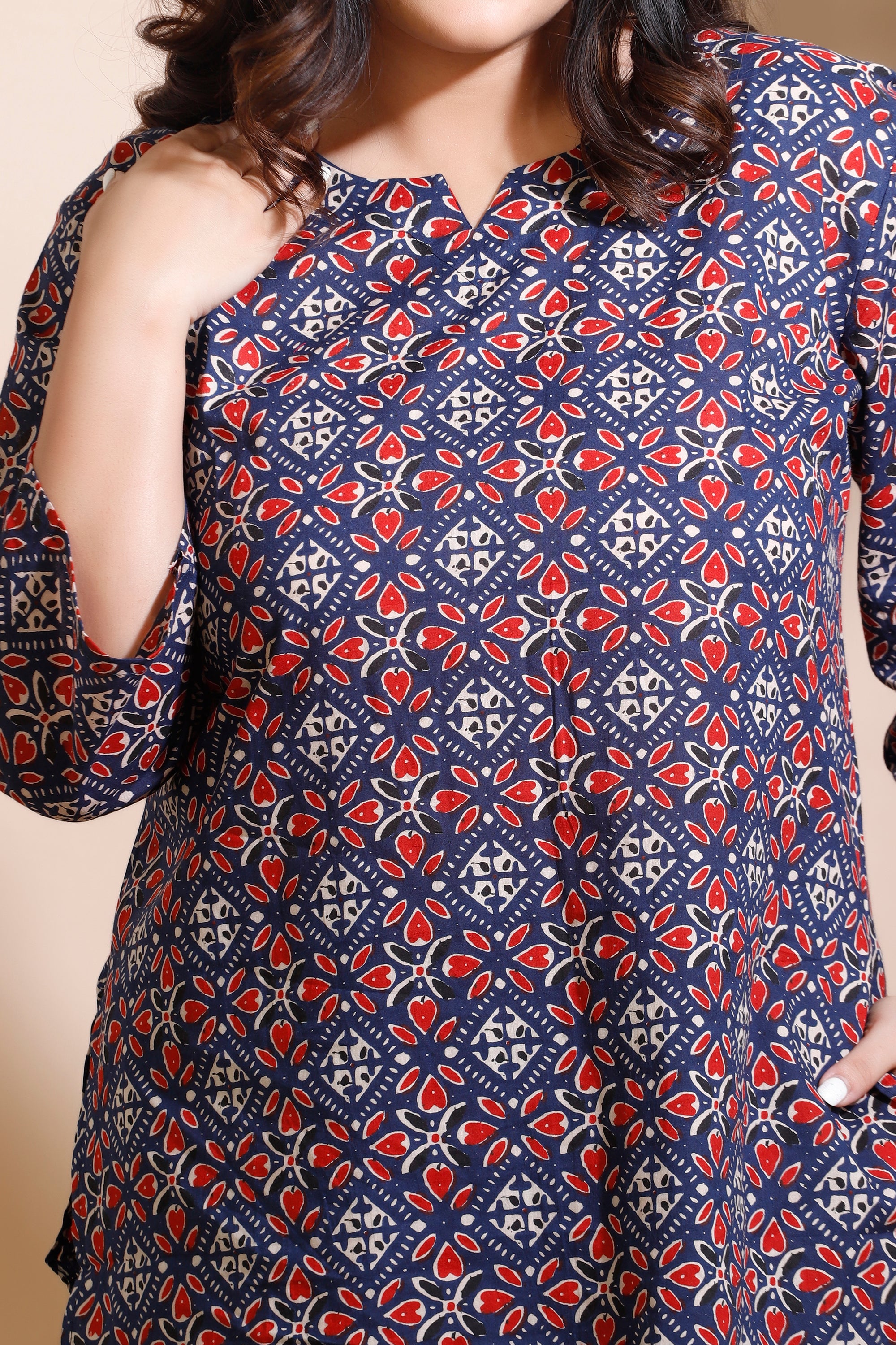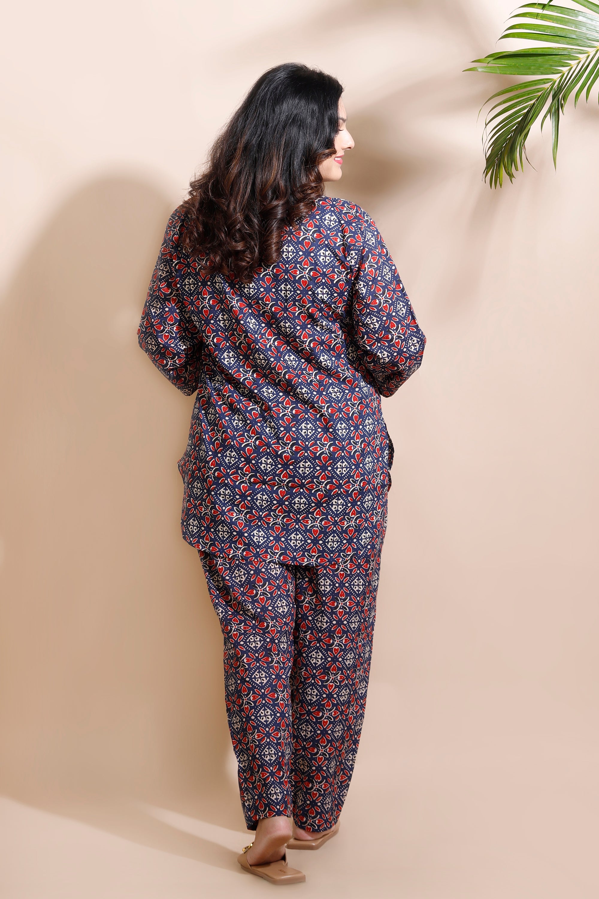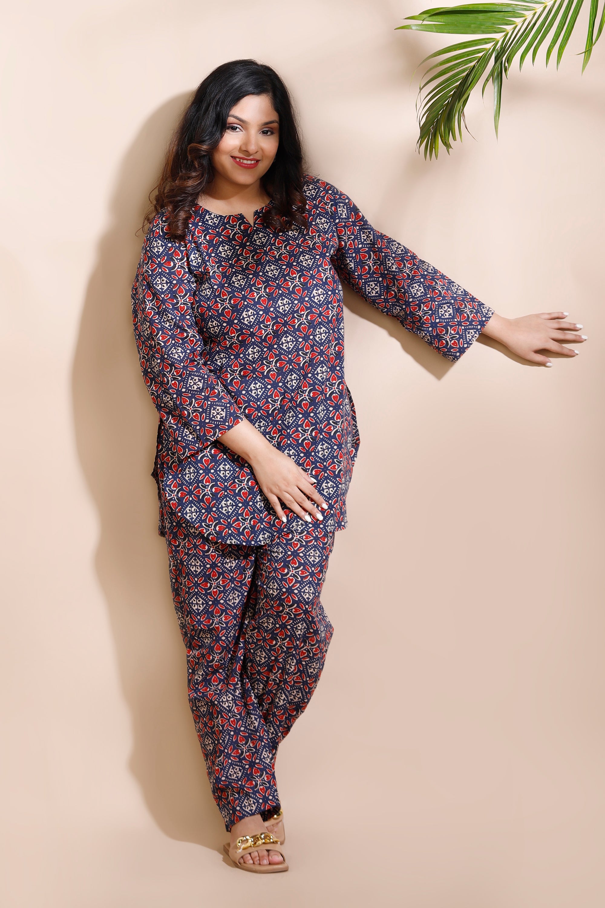 Elevate your loungewear collection with the BREATH:ABLES women’s blue cotton geometric print co-ord set. Crafted from soft, breathable premium cotton, this set features a hip-length kurta with a relaxed round neck and 3/4th sleeves, paired with short narrow-bottom pants. Designed with an elastic waistband and adjustable drawstrings, the pants provide a customised, comfortable fit. The bold geometric print in calming blue tones adds a modern, stylish edge. Perfect for home, casual outings, travel, or work-from-home days, this set combines comfort and chic versatility.