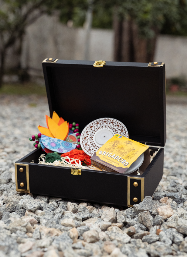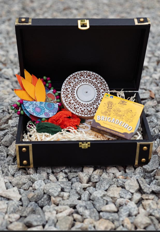 . Recycled Cloth Diya Latkan: Add a splash of color and tradition to your décor with this vibrant diya latkan, crafted from recycled cloth. Each latkan is a unique piece, featuring a mix of patterns and hues that bring festive cheer and sustainability into your home. Perfect for hanging during celebrations or year-round as a decorative accent, this latkan is a beautiful reminder of mindful living. 2. Wooden Jaipuri Block Tea Light Holder: This exquisite tea light holder is handcrafted with traditional Jaipuri block designs, bringing a touch of Rajasthan’s rich cultural heritage to your space. The intricate carvings create a stunning effect when lit, casting warm, inviting patterns that enhance the ambiance of any room. It’s an elegant piece that adds a touch of artistry to your home décor. 3. Chocolate-Flavored Pudding: Savor the rich, velvety taste of chocolate-flavored pudding, a delectable treat that offers a moment of pure indulgence. Packaged for convenience, this pudding is perfect for enjoying as a dessert or a sweet snack, delivering a satisfying burst of chocolatey goodness whenever you need it. 4. Wooden Small Suitcase (Organizer/Storage Box): The wooden suitcase that houses this hamper is more than just packaging—it’s a versatile and stylish storage solution. Crafted with care, it features a sturdy design and a natural wood finish that complements any décor. Ideal for organizing small items, storing keepsakes, or simply adding a rustic touch to your space, this suitcase is a lasting reminder of the thoughtful gift it holds.