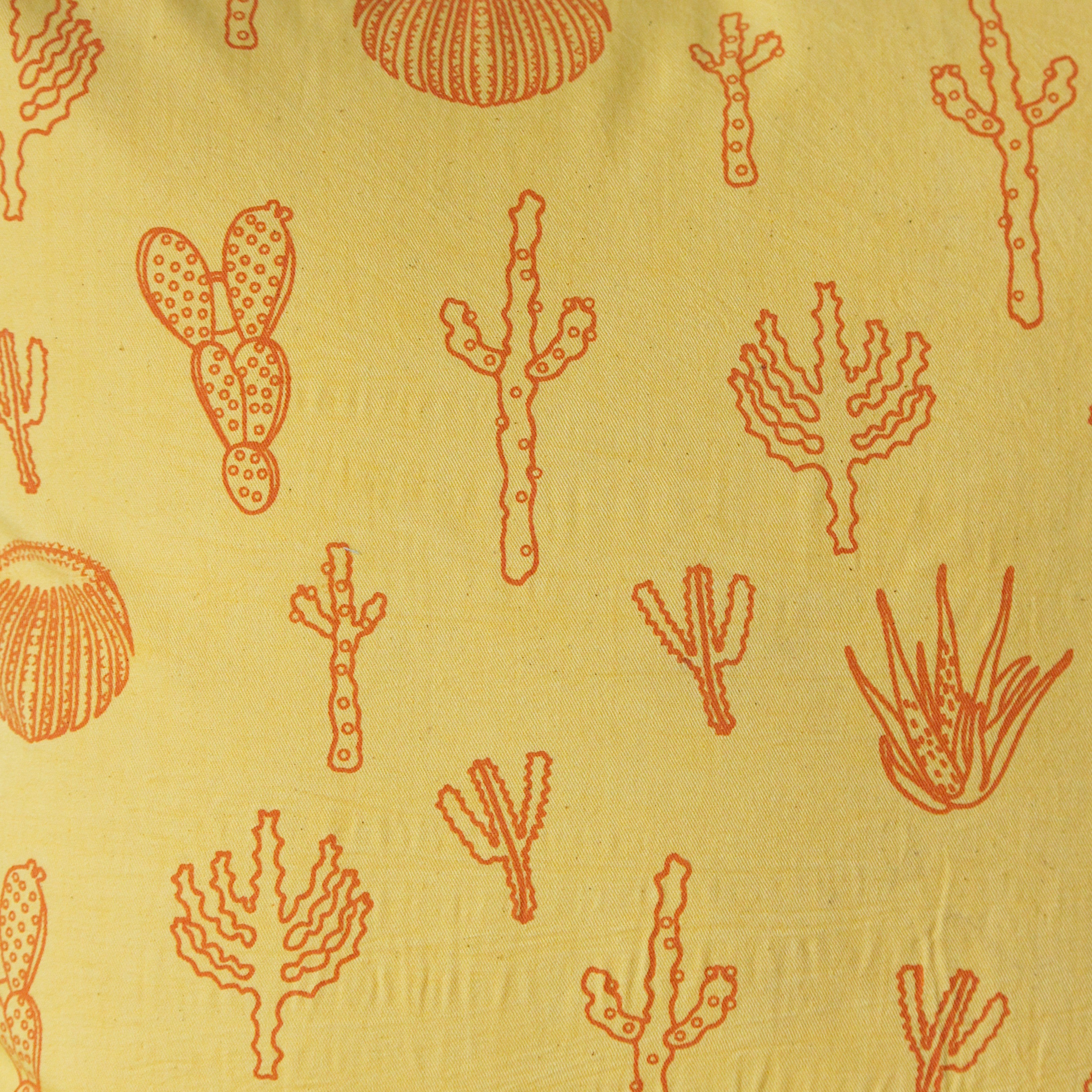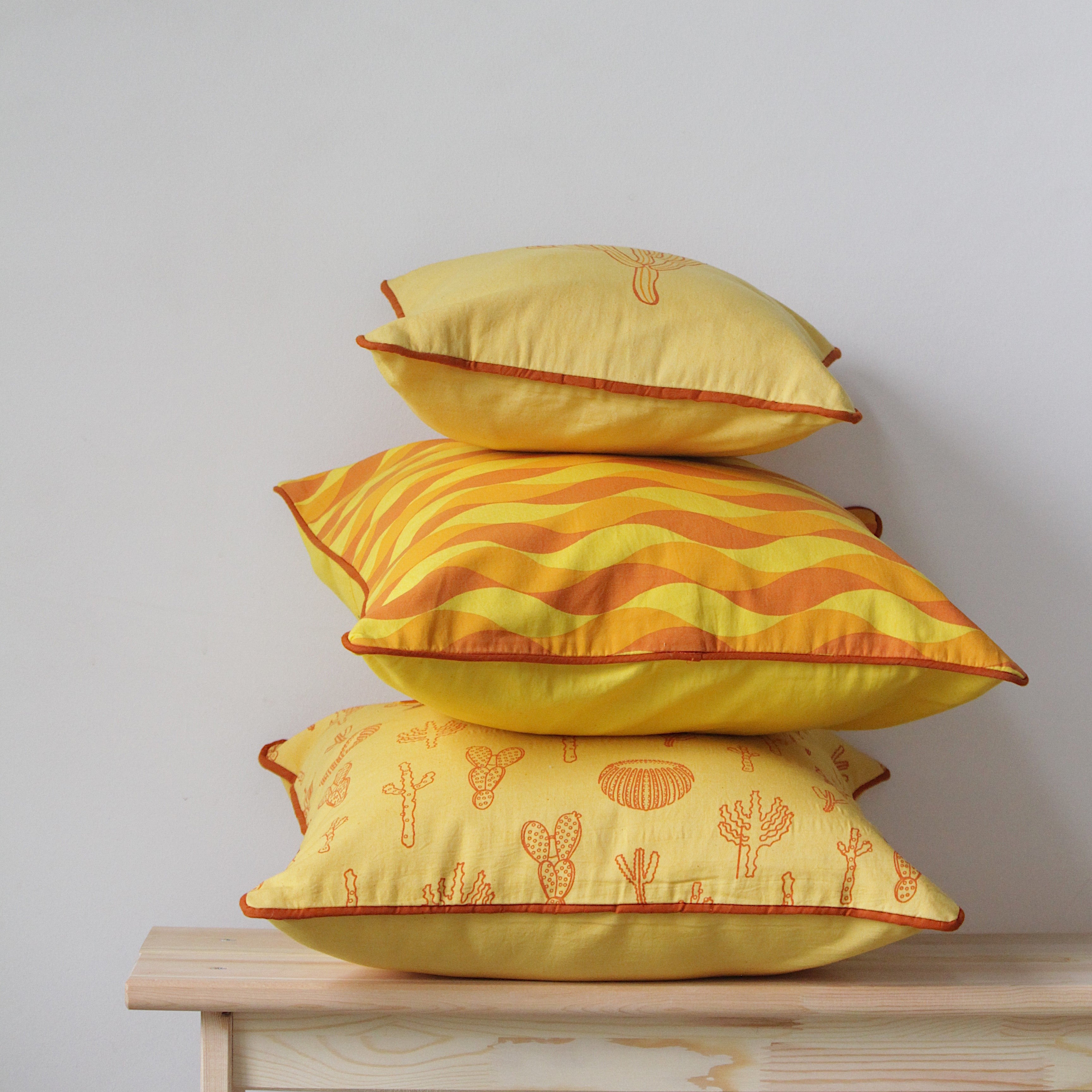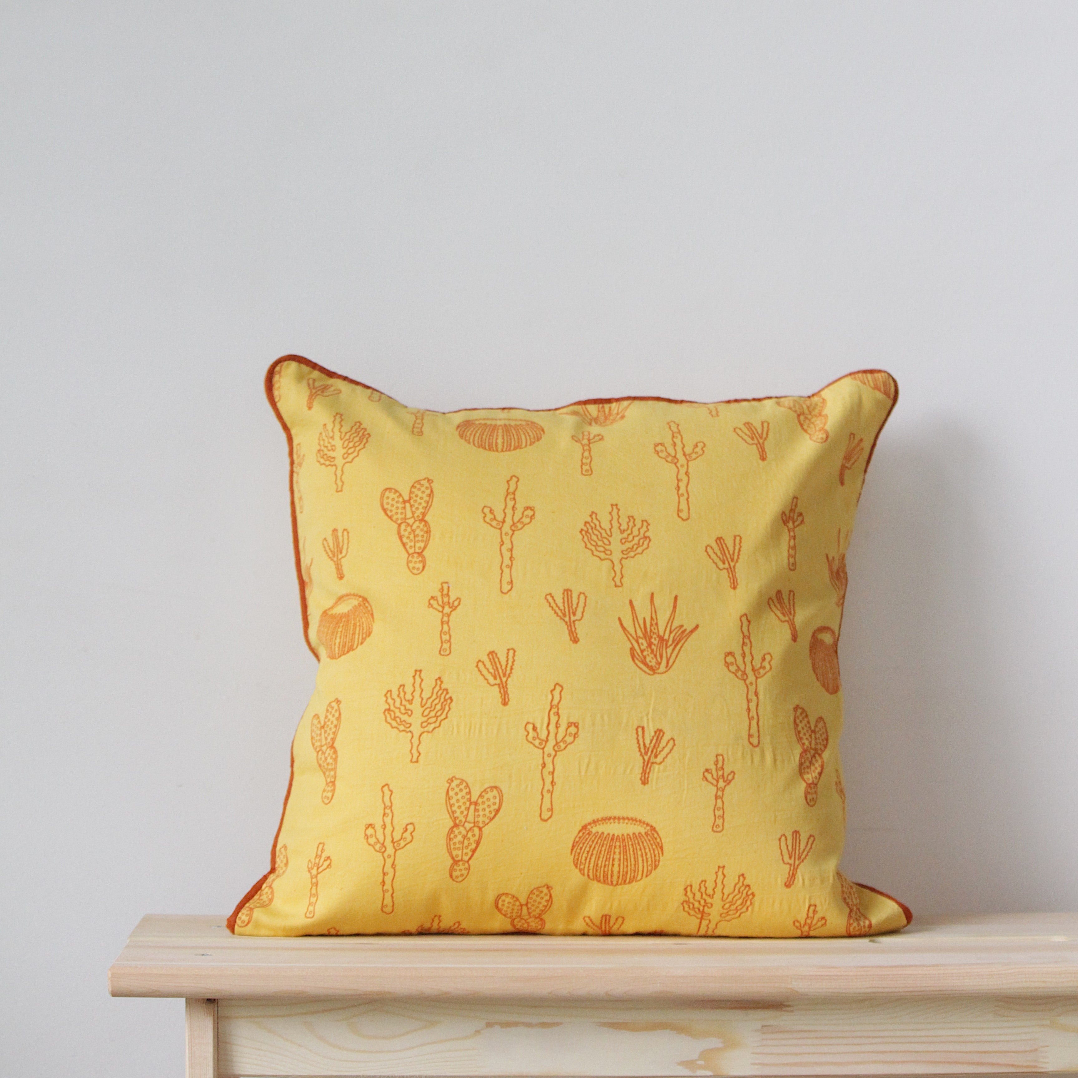 The Habitat cushion covers are hand screen printed on a hand dyed cotton fabric. We recommend dry cleaning of your cushions for best care results. Please note, owing to the nature of the craft, slight variations in color may occur.