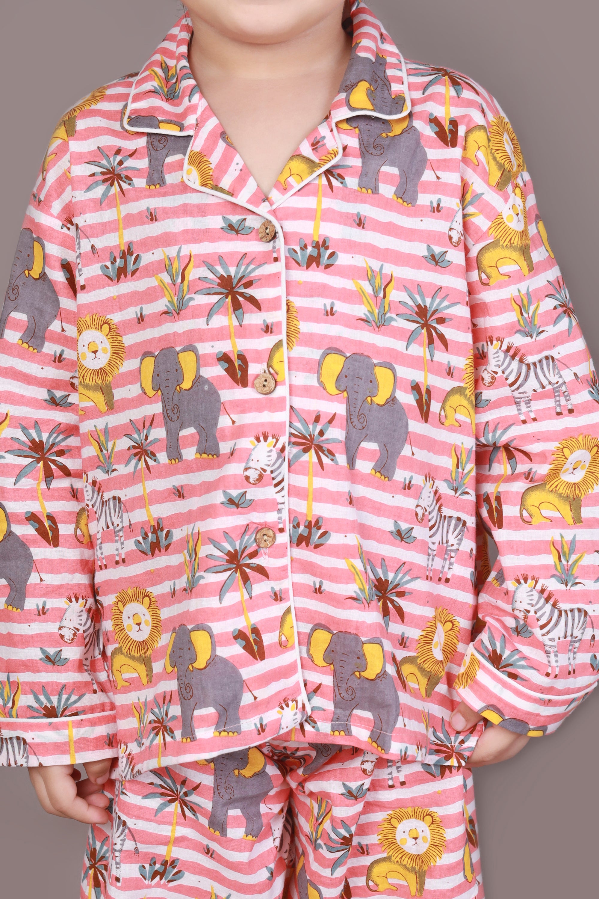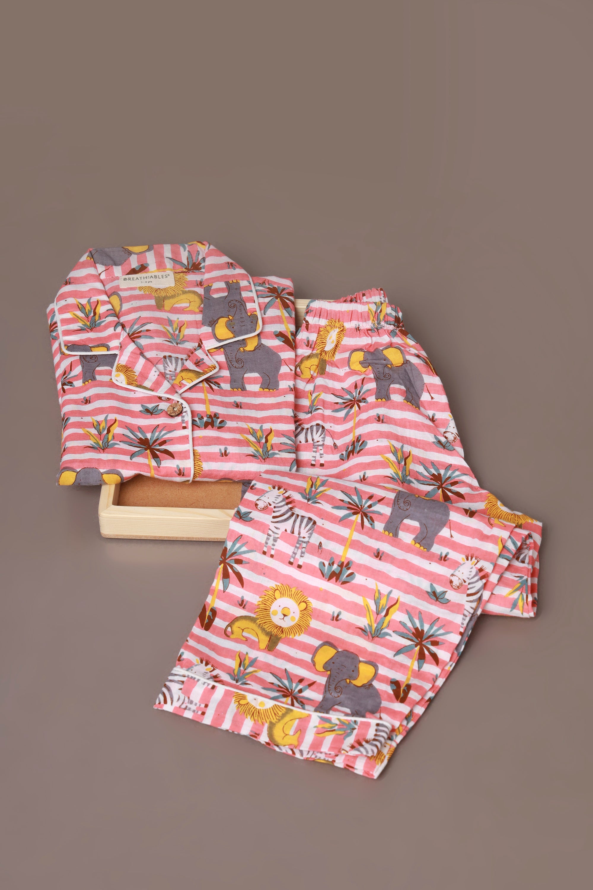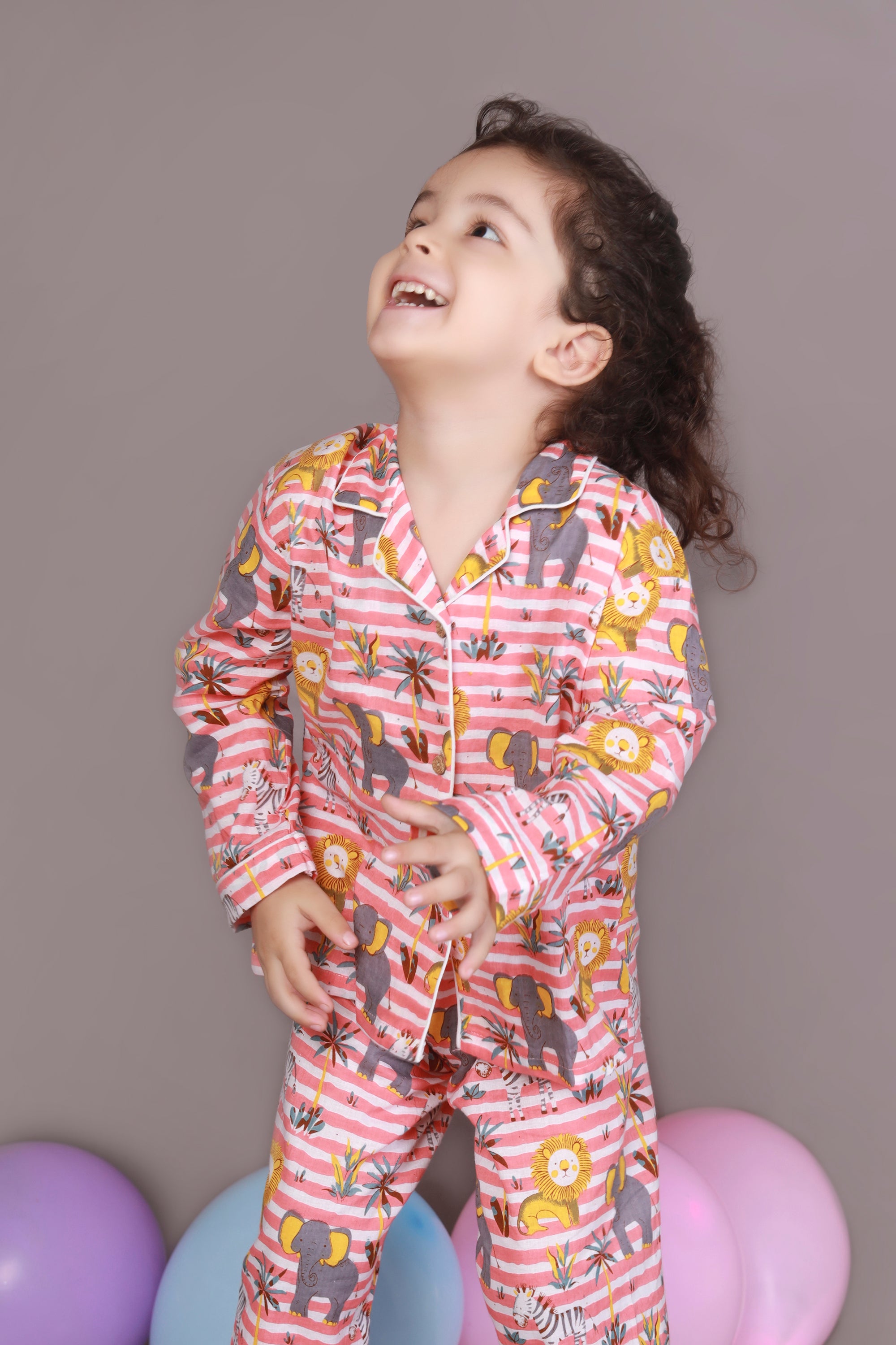A bold blend of stripes and safari – this red & white nightsuit features lion, elephant, and zebra prints in a striking co-ord set. The shirt has a notched collar and full sleeves, paired with relaxed pyjamas. Made for adventurous dreamers in soft cotton.