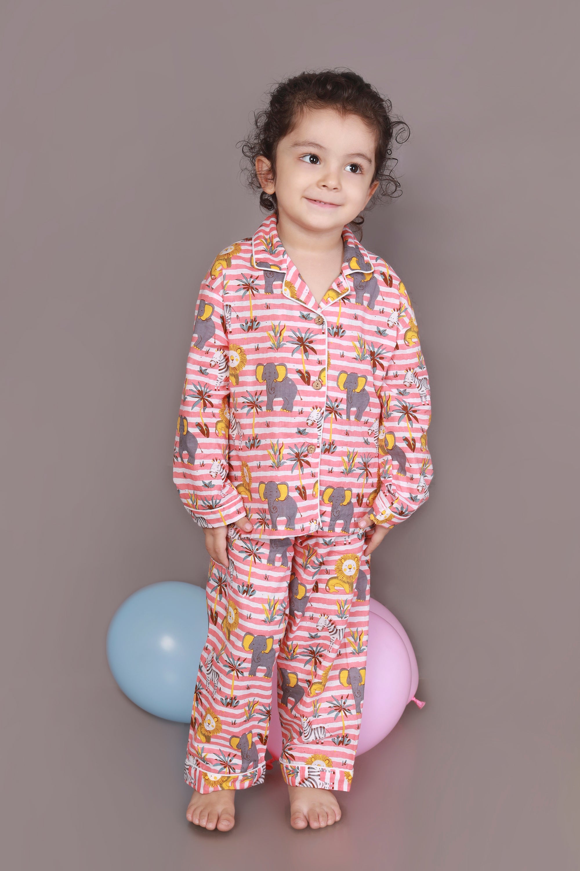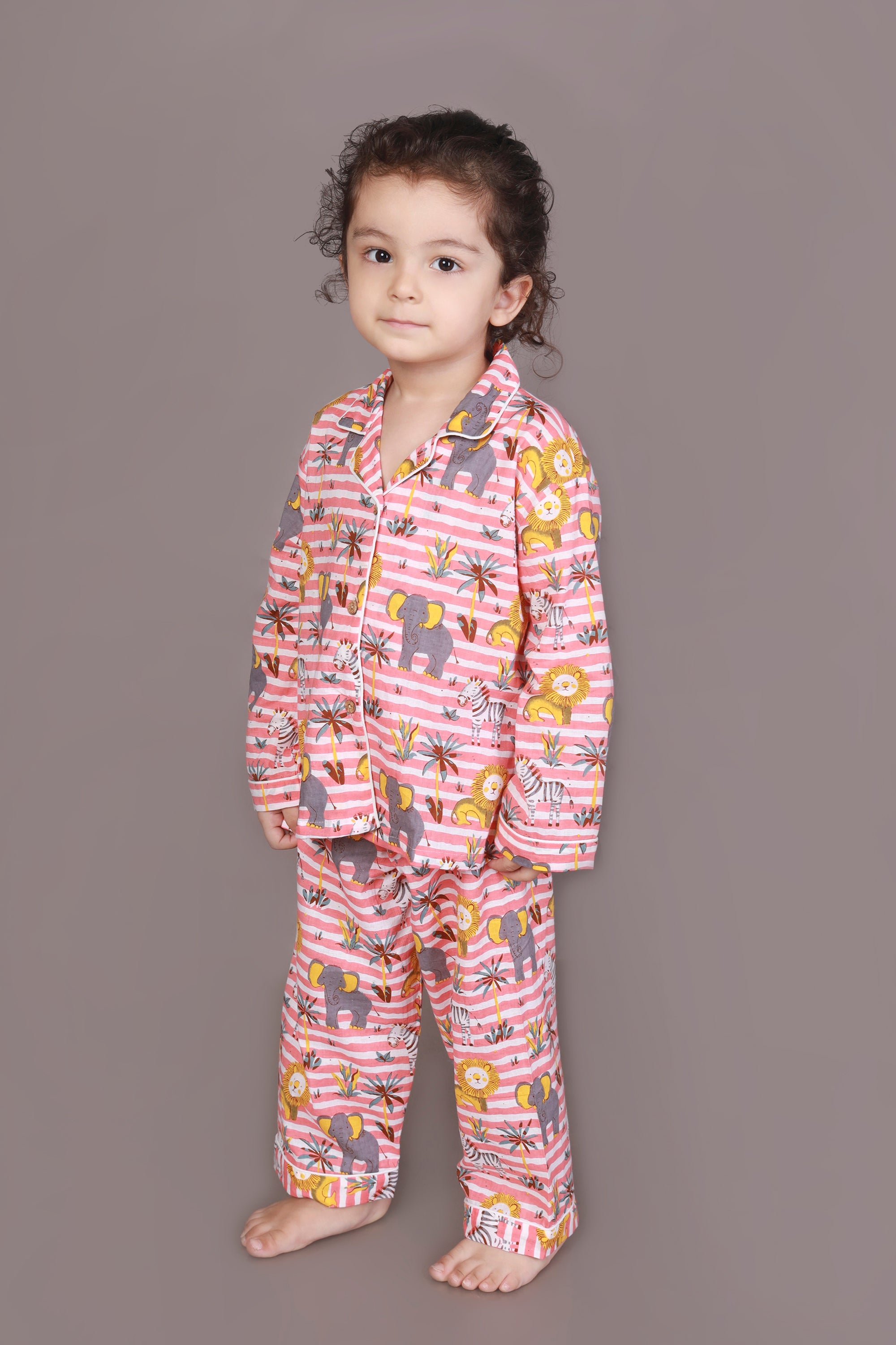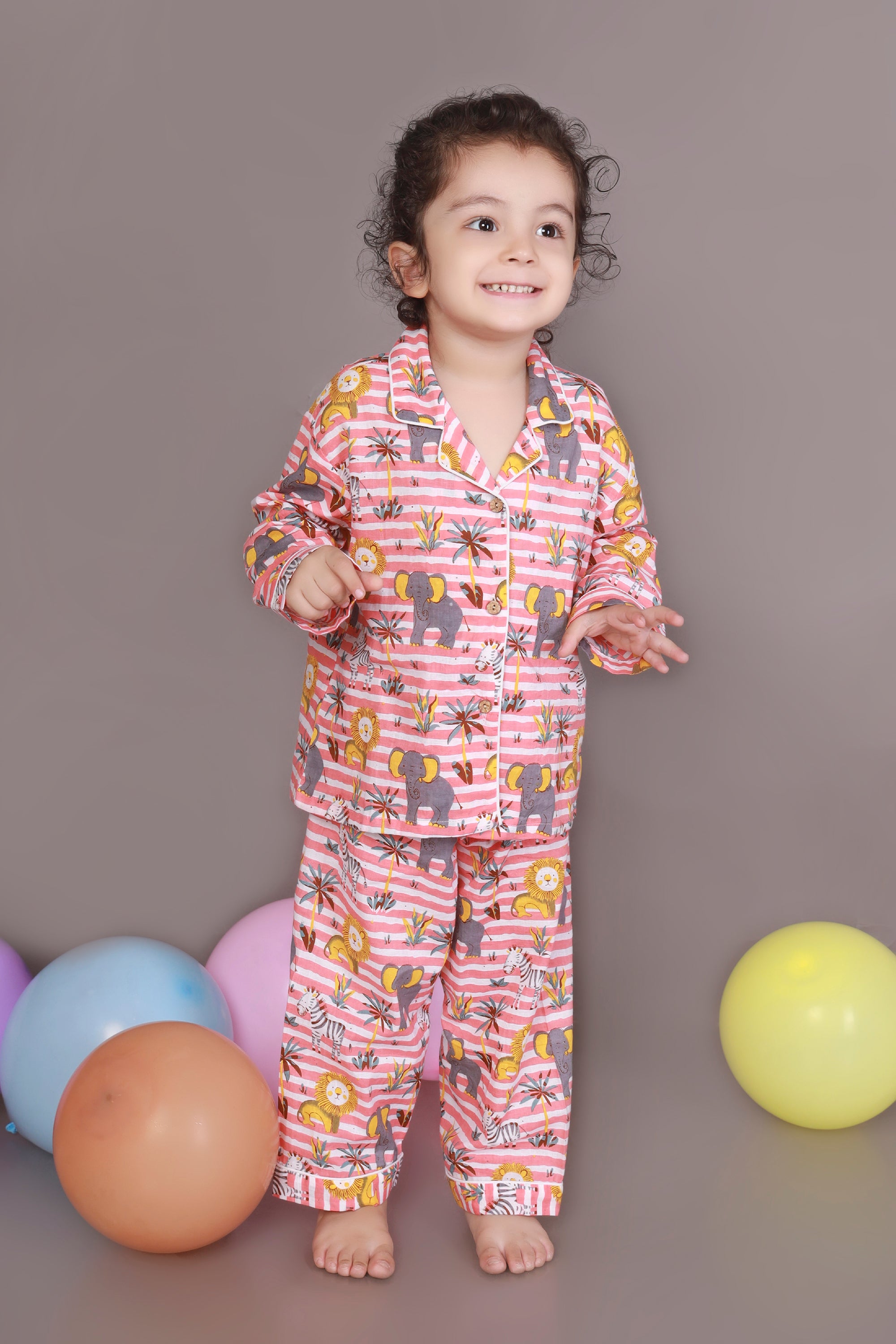 A bold blend of stripes and safari – this red & white nightsuit features lion, elephant, and zebra prints in a striking co-ord set. The shirt has a notched collar and full sleeves, paired with relaxed pyjamas. Made for adventurous dreamers in soft cotton.