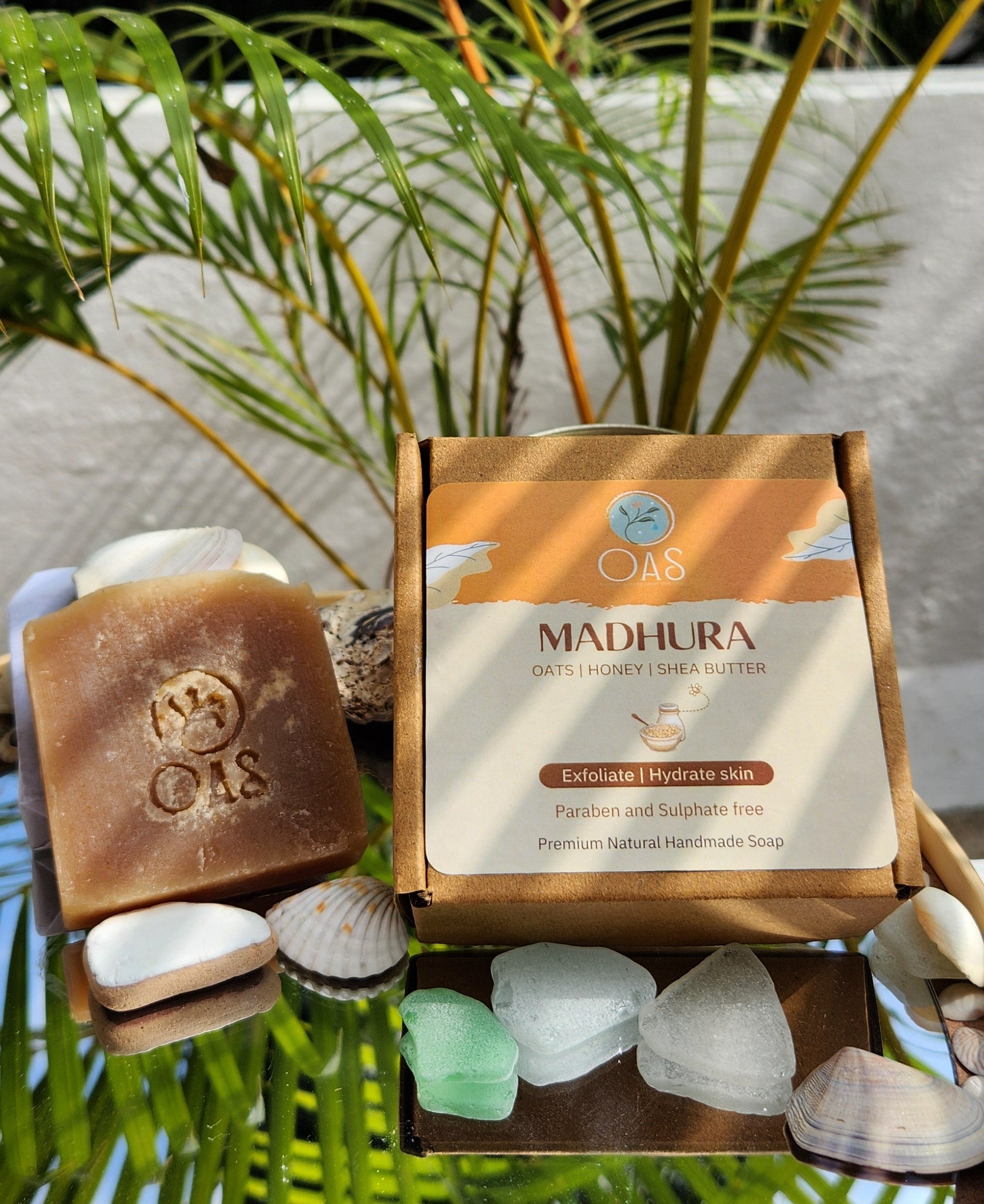 Indulge in the luxury of natural exfoliation with Madhura. Our handcrafted soap bar is infused with a harmonious blend of nourishing ingredients, designed to gently cleanse, exfoliate, and moisturize your skin.