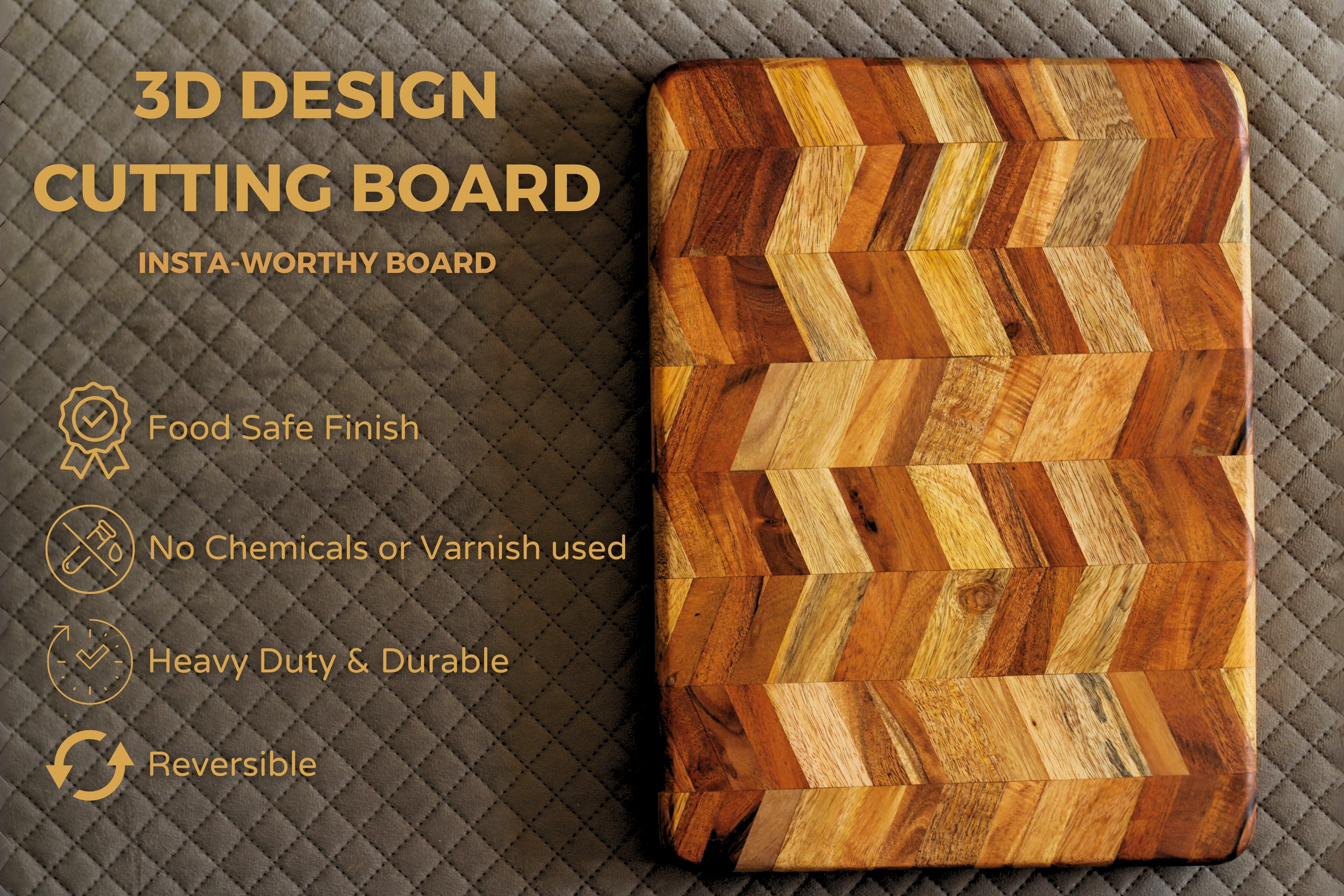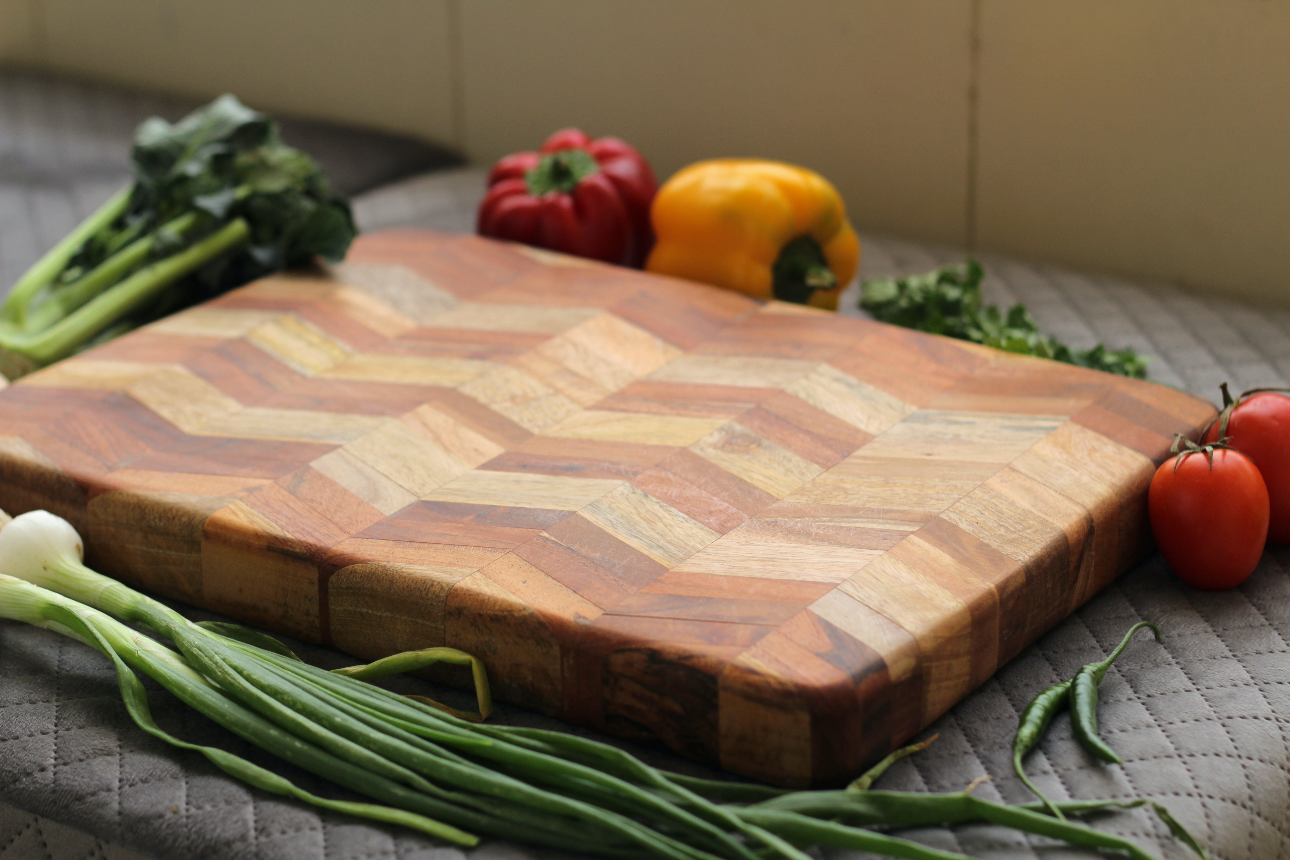 A reversible butcher block crafted from mango and acacia wood, featuring a striking 3D pattern. Treated with food-grade mineral oil for a smooth, durable finish, perfect for chopping and cutting.