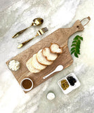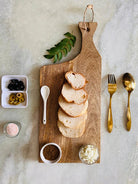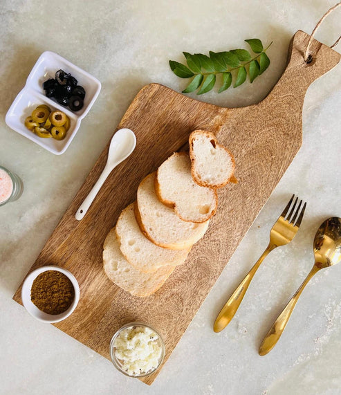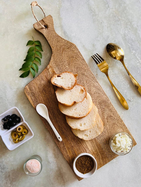 Mango Wood Chopping Board & Serving Platter with Handle – Handcrafted from durable mango wood, this versatile board doubles as a chopping surface and a stylish serving platter. The sturdy handle ensures easy carrying and elegant presentation.