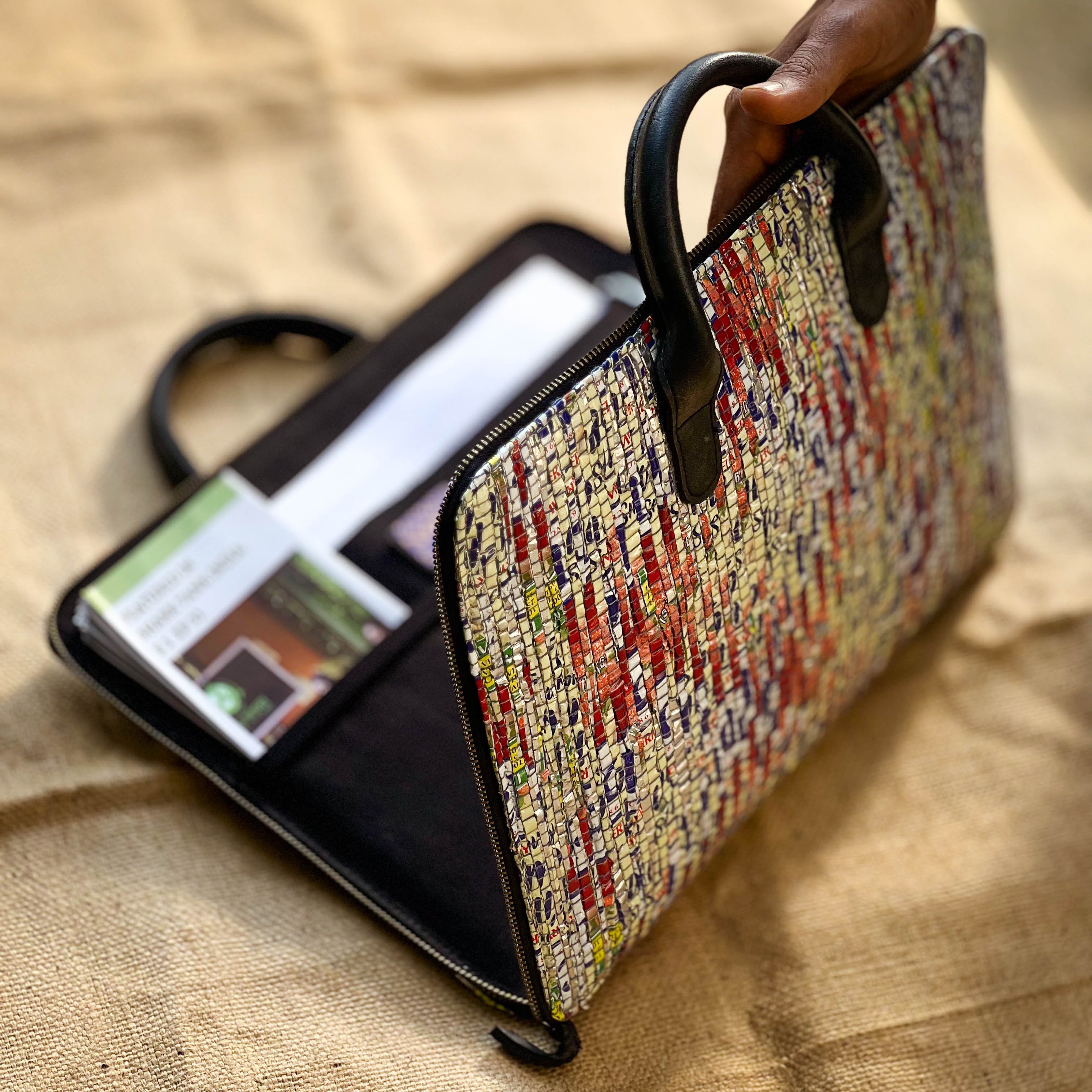 • Made with our signature handloom textile upcycled from single use plastic wrappers
